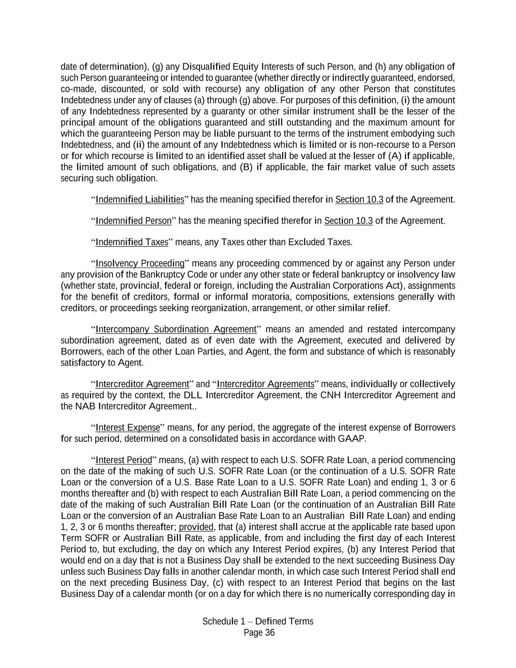 Schedule 1 – Defined Terms Page 36 date of determination), (g) any Disqualified Equity Interests of such Person, and (h) any obligation of such Person guaranteeing or intended to guarantee (whether directly or indirectly guaranteed, endorsed, co-made, discounted, or sold with recourse) any obligation of any other Person that constitutes Indebtedness under any of clauses (a) through (g) above. For purposes of this definition, (i) the amount of any Indebtedness represented by a guaranty or other similar instrument shall be the lesser of the principal amount of the obligations guaranteed and still outstanding and the maximum amount for which the guaranteeing Person may be liable pursuant to the terms of the instrument embodying such Indebtedness, and (ii) the amount of any Indebtedness which is limited or is non-recourse to a Person or for which recourse is limited to an identified asset shall be valued at the lesser of (A) if applicable, the limited amount of such obligations, and (B) if applicable, the fair market value of such assets securing such obligation. “Indemnified Liabilities” has the meaning specified therefor in Section 10.3 of the Agreement. “Indemnified Person” has the meaning specified therefor in Section 10.3 of the Agreement. “Indemnified Taxes” means, any Taxes other than Excluded Taxes. “Insolvency Proceeding” means any proceeding commenced by or against any Person under any provision of the Bankruptcy Code or under any other state or federal bankruptcy or insolvency law (whether state, provincial, federal or foreign, including the Australian Corporations Act), assignments for the benefit of creditors, formal or informal moratoria, compositions, extensions generally with creditors, or proceedings seeking reorganization, arrangement, or other similar relief. “Intercompany Subordination Agreement” means an amended and restated intercompany subordination agreement, dated as of even date with the Agreement, executed and delivered by Borrowers, each of the other Loan Parties, and Agent, the form and substance of which is reasonably satisfactory to Agent. “Intercreditor Agreement” and “Intercreditor Agreements” means, individually or collectively as required by the context, the DLL Intercreditor Agreement, the CNH Intercreditor Agreement and the NAB Intercreditor Agreement.. “Interest Expense” means, for any period, the aggregate of the interest expense of Borrowers for such period, determined on a consolidated basis in accordance with GAAP. “Interest Period” means, (a) with respect to each U.S. SOFR Rate Loan, a period commencing on the date of the making of such U.S. SOFR Rate Loan (or the continuation of a U.S. SOFR Rate Loan or the conversion of a U.S. Base Rate Loan to a U.S. SOFR Rate Loan) and ending 1, 3 or 6 months thereafter and (b) with respect to each Australian Bill Rate Loan, a period commencing on the date of the making of such Australian Bill Rate Loan (or the continuation of an Australian Bill Rate Loan or the conversion of an Australian Base Rate Loan to an Australian Bill Rate Loan) and ending 1, 2, 3 or 6 months thereafter; provided, that (a) interest shall accrue at the applicable rate based upon Term SOFR or Australian Bill Rate, as applicable, from and including the first day of each Interest Period to, but excluding, the day on which any Interest Period expires, (b) any Interest Period that would end on a day that is not a Business Day shall be extended to the next succeeding Business Day unless such Business Day falls in another calendar month, in which case such Interest Period shall end on the next preceding Business Day, (c) with respect to an Interest Period that begins on the last Business Day of a calendar month (or on a day for which there is no numerically corresponding day in