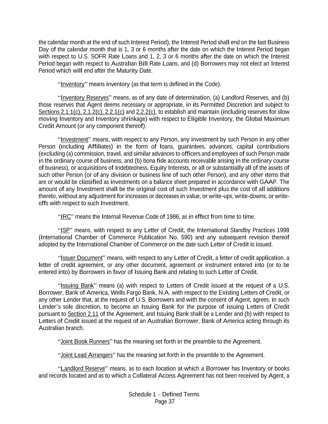 Schedule 1 – Defined Terms Page 37 the calendar month at the end of such Interest Period), the Interest Period shall end on the last Business Day of the calendar month that is 1, 3 or 6 months after the date on which the Interest Period began with respect to U.S. SOFR Rate Loans and 1, 2, 3 or 6 months after the date on which the Interest Period began with respect to Australian Bill Rate Loans, and (d) Borrowers may not elect an Interest Period which will end after the Maturity Date. “Inventory” means inventory (as that term is defined in the Code). “Inventory Reserves” means, as of any date of determination, (a) Landlord Reserves, and (b) those reserves that Agent deems necessary or appropriate, in its Permitted Discretion and subject to Sections 2.1.1(c), 2.1.2(c), 2.2.1(c) and 2.2.2(c), to establish and maintain (including reserves for slow moving Inventory and Inventory shrinkage) with respect to Eligible Inventory, the Global Maximum Credit Amount (or any component thereof). “Investment” means, with respect to any Person, any investment by such Person in any other Person (including Affiliates) in the form of loans, guarantees, advances, capital contributions (excluding (a) commission, travel, and similar advances to officers and employees of such Person made in the ordinary course of business, and (b) bona fide accounts receivable arising in the ordinary course of business), or acquisitions of Indebtedness, Equity Interests, or all or substantially all of the assets of such other Person (or of any division or business line of such other Person), and any other items that are or would be classified as investments on a balance sheet prepared in accordance with GAAP. The amount of any Investment shall be the original cost of such Investment plus the cost of all additions thereto, without any adjustment for increases or decreases in value, or write-ups, write-downs, or write- offs with respect to such Investment. “IRC” means the Internal Revenue Code of 1986, as in effect from time to time. “ISP” means, with respect to any Letter of Credit, the International Standby Practices 1998 (International Chamber of Commerce Publication No. 590) and any subsequent revision thereof adopted by the International Chamber of Commerce on the date such Letter of Credit is issued. “Issuer Document” means, with respect to any Letter of Credit, a letter of credit application, a letter of credit agreement, or any other document, agreement or instrument entered into (or to be entered into) by Borrowers in favor of Issuing Bank and relating to such Letter of Credit. “Issuing Bank” means (a) with respect to Letters of Credit issued at the request of a U.S. Borrower, Bank of America, Wells Fargo Bank, N.A. with respect to the Existing Letters of Credit, or any other Lender that, at the request of U.S. Borrowers and with the consent of Agent, agrees, in such Lender’s sole discretion, to become an Issuing Bank for the purpose of issuing Letters of Credit pursuant to Section 2.11 of the Agreement, and Issuing Bank shall be a Lender and (b) with respect to Letters of Credit issued at the request of an Australian Borrower, Bank of America acting through its Australian branch. “Joint Book Runners” has the meaning set forth in the preamble to the Agreement. “Joint Lead Arrangers” has the meaning set forth in the preamble to the Agreement. “Landlord Reserve” means, as to each location at which a Borrower has Inventory or books and records located and as to which a Collateral Access Agreement has not been received by Agent, a