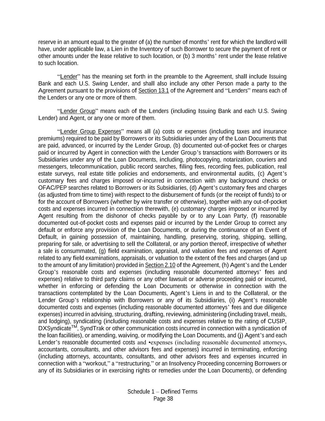 Schedule 1 – Defined Terms Page 38 reserve in an amount equal to the greater of (a) the number of months’ rent for which the landlord will have, under applicable law, a Lien in the Inventory of such Borrower to secure the payment of rent or other amounts under the lease relative to such location, or (b) 3 months’ rent under the lease relative to such location. “Lender” has the meaning set forth in the preamble to the Agreement, shall include Issuing Bank and each U.S. Swing Lender, and shall also include any other Person made a party to the Agreement pursuant to the provisions of Section 13.1 of the Agreement and “Lenders” means each of the Lenders or any one or more of them. “Lender Group” means each of the Lenders (including Issuing Bank and each U.S. Swing Lender) and Agent, or any one or more of them. “Lender Group Expenses” means all (a) costs or expenses (including taxes and insurance premiums) required to be paid by Borrowers or its Subsidiaries under any of the Loan Documents that are paid, advanced, or incurred by the Lender Group, (b) documented out-of-pocket fees or charges paid or incurred by Agent in connection with the Lender Group’s transactions with Borrowers or its Subsidiaries under any of the Loan Documents, including, photocopying, notarization, couriers and messengers, telecommunication, public record searches, filing fees, recording fees, publication, real estate surveys, real estate title policies and endorsements, and environmental audits, (c) Agent’s customary fees and charges imposed or-incurred in connection with any background checks or OFAC/PEP searches related to Borrowers or its Subsidiaries, (d) Agent’s customary fees and charges (as adjusted from time to time) with respect to the disbursement of funds (or the receipt of funds) to or for the account of Borrowers (whether by wire transfer or otherwise), together with any out-of-pocket costs and expenses incurred in connection therewith, (e) customary charges imposed or incurred by Agent resulting from the dishonor of checks payable by or to any Loan Party, (f) reasonable documented out-of-pocket costs and expenses paid or incurred by the Lender Group to correct any default or enforce any provision of the Loan Documents, or during the continuance of an Event of Default, in gaining possession of, maintaining, handling, preserving, storing, shipping, selling, preparing for sale, or advertising to sell the Collateral, or any portion thereof, irrespective of whether a sale is consummated, (g) field examination, appraisal, and valuation fees and expenses of Agent related to any field examinations, appraisals, or valuation to the extent of the fees and charges (and up to the amount of any limitation) provided in Section 2.10 of the Agreement, (h) Agent’s and the Lender Group’s reasonable costs and expenses (including reasonable documented attorneys’ fees and expenses) relative to third party claims or any other lawsuit or adverse proceeding paid or incurred, whether in enforcing or defending the Loan Documents or otherwise in connection with the transactions contemplated by the Loan Documents, Agent’s Liens in and to the Collateral, or the Lender Group’s relationship with Borrowers or any of its Subsidiaries, (i) Agent’s reasonable documented costs and expenses (including reasonable documented attorneys’ fees and due diligence expenses) incurred in advising, structuring, drafting, reviewing, administering (including travel, meals, and lodging), syndicating (including reasonable costs and expenses relative to the rating of CUSIP, DXSyndicateTM, SyndTrak or other communication costs incurred in connection with a syndication of the loan facilities), or amending, waiving, or modifying the Loan Documents, and (j) Agent’s and each Lender’s reasonable documented costs and •expenses (including reasonable documented attorneys, accountants, consultants, and other advisors fees and expenses) incurred in terminating, enforcing (including attorneys, accountants, consultants, and other advisors fees and expenses incurred in connection with a “workout,” a “restructuring,” or an Insolvency Proceeding concerning Borrowers or any of its Subsidiaries or in exercising rights or remedies under the Loan Documents), or defending