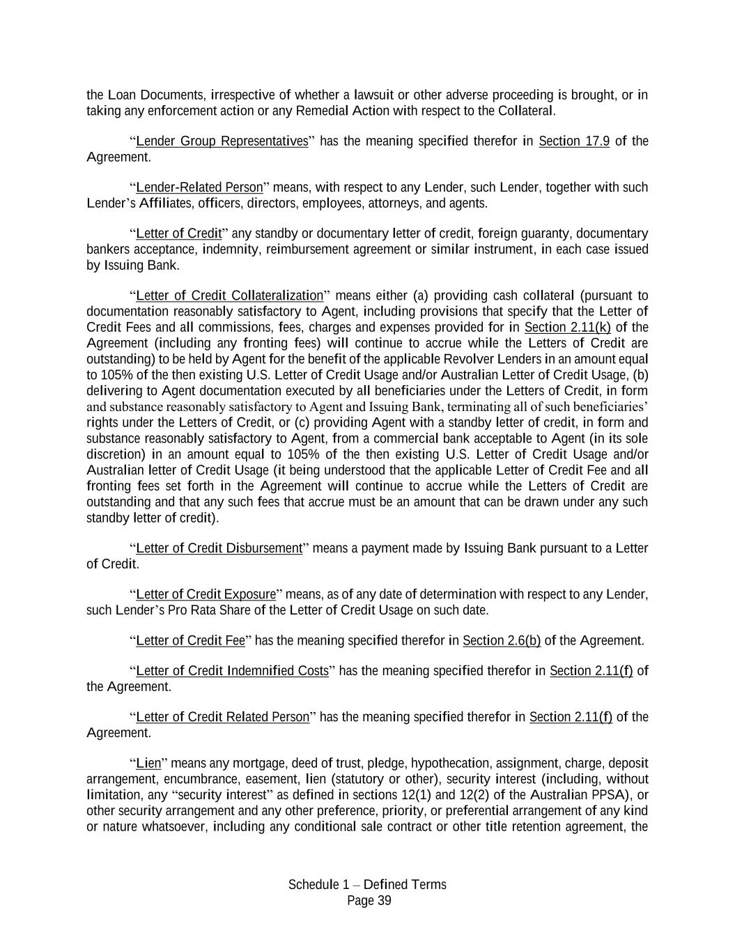 Schedule 1 – Defined Terms Page 39 the Loan Documents, irrespective of whether a lawsuit or other adverse proceeding is brought, or in taking any enforcement action or any Remedial Action with respect to the Collateral. “Lender Group Representatives” has the meaning specified therefor in Section 17.9 of the Agreement. “Lender-Related Person” means, with respect to any Lender, such Lender, together with such Lender’s Affiliates, officers, directors, employees, attorneys, and agents. “Letter of Credit” any standby or documentary letter of credit, foreign guaranty, documentary bankers acceptance, indemnity, reimbursement agreement or similar instrument, in each case issued by Issuing Bank. “Letter of Credit Collateralization” means either (a) providing cash collateral (pursuant to documentation reasonably satisfactory to Agent, including provisions that specify that the Letter of Credit Fees and all commissions, fees, charges and expenses provided for in Section 2.11(k) of the Agreement (including any fronting fees) will continue to accrue while the Letters of Credit are outstanding) to be held by Agent for the benefit of the applicable Revolver Lenders in an amount equal to 105% of the then existing U.S. Letter of Credit Usage and/or Australian Letter of Credit Usage, (b) delivering to Agent documentation executed by all beneficiaries under the Letters of Credit, in form and substance reasonably satisfactory to Agent and Issuing Bank, terminating all of such beneficiaries’ rights under the Letters of Credit, or (c) providing Agent with a standby letter of credit, in form and substance reasonably satisfactory to Agent, from a commercial bank acceptable to Agent (in its sole discretion) in an amount equal to 105% of the then existing U.S. Letter of Credit Usage and/or Australian letter of Credit Usage (it being understood that the applicable Letter of Credit Fee and all fronting fees set forth in the Agreement will continue to accrue while the Letters of Credit are outstanding and that any such fees that accrue must be an amount that can be drawn under any such standby letter of credit). “Letter of Credit Disbursement” means a payment made by Issuing Bank pursuant to a Letter of Credit. “Letter of Credit Exposure” means, as of any date of determination with respect to any Lender, such Lender’s Pro Rata Share of the Letter of Credit Usage on such date. “Letter of Credit Fee” has the meaning specified therefor in Section 2.6(b) of the Agreement. “Letter of Credit Indemnified Costs” has the meaning specified therefor in Section 2.11(f) of the Agreement. “Letter of Credit Related Person” has the meaning specified therefor in Section 2.11(f) of the Agreement. “Lien” means any mortgage, deed of trust, pledge, hypothecation, assignment, charge, deposit arrangement, encumbrance, easement, lien (statutory or other), security interest (including, without limitation, any “security interest” as defined in sections 12(1) and 12(2) of the Australian PPSA), or other security arrangement and any other preference, priority, or preferential arrangement of any kind or nature whatsoever, including any conditional sale contract or other title retention agreement, the