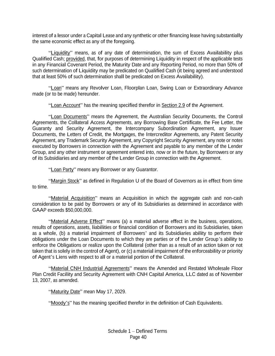 Schedule 1 – Defined Terms Page 40 interest of a lessor under a Capital Lease and any synthetic or other financing lease having substantially the same economic effect as any of the foregoing. “Liquidity” means, as of any date of determination, the sum of Excess Availability plus Qualified Cash; provided, that, for purposes of determining Liquidity in respect of the applicable tests in any Financial Covenant Period, the Maturity Date and any Reporting Period, no more than 50% of such determination of Liquidity may be predicated on Qualified Cash (it being agreed and understood that at least 50% of such determination shall be predicated on Excess Availability). “Loan” means any Revolver Loan, Floorplan Loan, Swing Loan or Extraordinary Advance made (or to be made) hereunder. “Loan Account” has the meaning specified therefor in Section 2.9 of the Agreement. “Loan Documents” means the Agreement, the Australian Security Documents, the Control Agreements, the Collateral Access Agreements, any Borrowing Base Certificate, the Fee Letter, the Guaranty and Security Agreement, the Intercompany Subordination Agreement, any Issuer Documents, the Letters of Credit, the Mortgages, the Intercreditor Agreements, any Patent Security Agreement, any Trademark Security Agreement, any Copyright Security Agreement, any note or notes executed by Borrowers in connection with the Agreement and payable to any member of the Lender Group, and any other instrument or agreement entered into, now or in the future, by Borrowers or any of its Subsidiaries and any member of the Lender Group in connection with the Agreement. “Loan Party” means any Borrower or any Guarantor. “Margin Stock” as defined in Regulation U of the Board of Governors as in effect from time to time. “Material Acquisition” means an Acquisition in which the aggregate cash and non-cash consideration to be paid by Borrowers or any of its Subsidiaries as determined in accordance with GAAP exceeds $50,000,000. “Material Adverse Effect” means (a) a material adverse effect in the business, operations, results of operations, assets, liabilities or financial condition of Borrowers and its Subsidiaries, taken as a whole, (b) a material impairment of Borrowers’ and its Subsidiaries ability to perform their obligations under the Loan Documents to which they are parties or of the Lender Group’s ability to enforce the Obligations or realize upon the Collateral (other than as a result of an action taken or not taken that is solely in the control of Agent), or (c) a material impairment of the enforceability or priority of Agent’s Liens with respect to all or a material portion of the Collateral. “Material CNH Industrial Agreements” means the Amended and Restated Wholesale Floor Plan Credit Facility and Security Agreement with CNH Capital America, LLC dated as of November 13, 2007, as amended. “Maturity Date” mean May 17, 2029. “Moody’s” has the meaning specified therefor in the definition of Cash Equivalents.