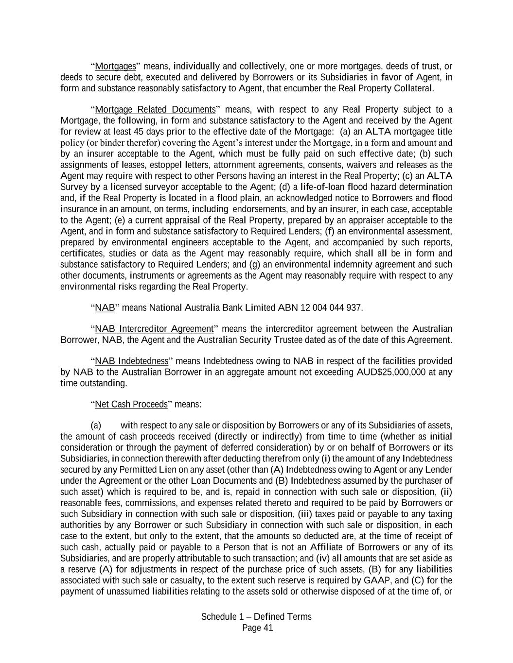 Schedule 1 – Defined Terms Page 41 “Mortgages” means, individually and collectively, one or more mortgages, deeds of trust, or deeds to secure debt, executed and delivered by Borrowers or its Subsidiaries in favor of Agent, in form and substance reasonably satisfactory to Agent, that encumber the Real Property Collateral. “Mortgage Related Documents” means, with respect to any Real Property subject to a Mortgage, the following, in form and substance satisfactory to the Agent and received by the Agent for review at least 45 days prior to the effective date of the Mortgage: (a) an ALTA mortgagee title policy (or binder therefor) covering the Agent’s interest under the Mortgage, in a form and amount and by an insurer acceptable to the Agent, which must be fully paid on such effective date; (b) such assignments of leases, estoppel letters, attornment agreements, consents, waivers and releases as the Agent may require with respect to other Persons having an interest in the Real Property; (c) an ALTA Survey by a licensed surveyor acceptable to the Agent; (d) a life-of-loan flood hazard determination and, if the Real Property is located in a flood plain, an acknowledged notice to Borrowers and flood insurance in an amount, on terms, including endorsements, and by an insurer, in each case, acceptable to the Agent; (e) a current appraisal of the Real Property, prepared by an appraiser acceptable to the Agent, and in form and substance satisfactory to Required Lenders; (f) an environmental assessment, prepared by environmental engineers acceptable to the Agent, and accompanied by such reports, certificates, studies or data as the Agent may reasonably require, which shall all be in form and substance satisfactory to Required Lenders; and (g) an environmental indemnity agreement and such other documents, instruments or agreements as the Agent may reasonably require with respect to any environmental risks regarding the Real Property. “NAB” means National Australia Bank Limited ABN 12 004 044 937. “NAB Intercreditor Agreement” means the intercreditor agreement between the Australian Borrower, NAB, the Agent and the Australian Security Trustee dated as of the date of this Agreement. “NAB Indebtedness” means Indebtedness owing to NAB in respect of the facilities provided by NAB to the Australian Borrower in an aggregate amount not exceeding AUD$25,000,000 at any time outstanding. “Net Cash Proceeds” means: (a) with respect to any sale or disposition by Borrowers or any of its Subsidiaries of assets, the amount of cash proceeds received (directly or indirectly) from time to time (whether as initial consideration or through the payment of deferred consideration) by or on behalf of Borrowers or its Subsidiaries, in connection therewith after deducting therefrom only (i) the amount of any Indebtedness secured by any Permitted Lien on any asset (other than (A) Indebtedness owing to Agent or any Lender under the Agreement or the other Loan Documents and (B) Indebtedness assumed by the purchaser of such asset) which is required to be, and is, repaid in connection with such sale or disposition, (ii) reasonable fees, commissions, and expenses related thereto and required to be paid by Borrowers or such Subsidiary in connection with such sale or disposition, (iii) taxes paid or payable to any taxing authorities by any Borrower or such Subsidiary in connection with such sale or disposition, in each case to the extent, but only to the extent, that the amounts so deducted are, at the time of receipt of such cash, actually paid or payable to a Person that is not an Affiliate of Borrowers or any of its Subsidiaries, and are properly attributable to such transaction; and (iv) all amounts that are set aside as a reserve (A) for adjustments in respect of the purchase price of such assets, (B) for any liabilities associated with such sale or casualty, to the extent such reserve is required by GAAP, and (C) for the payment of unassumed liabilities relating to the assets sold or otherwise disposed of at the time of, or