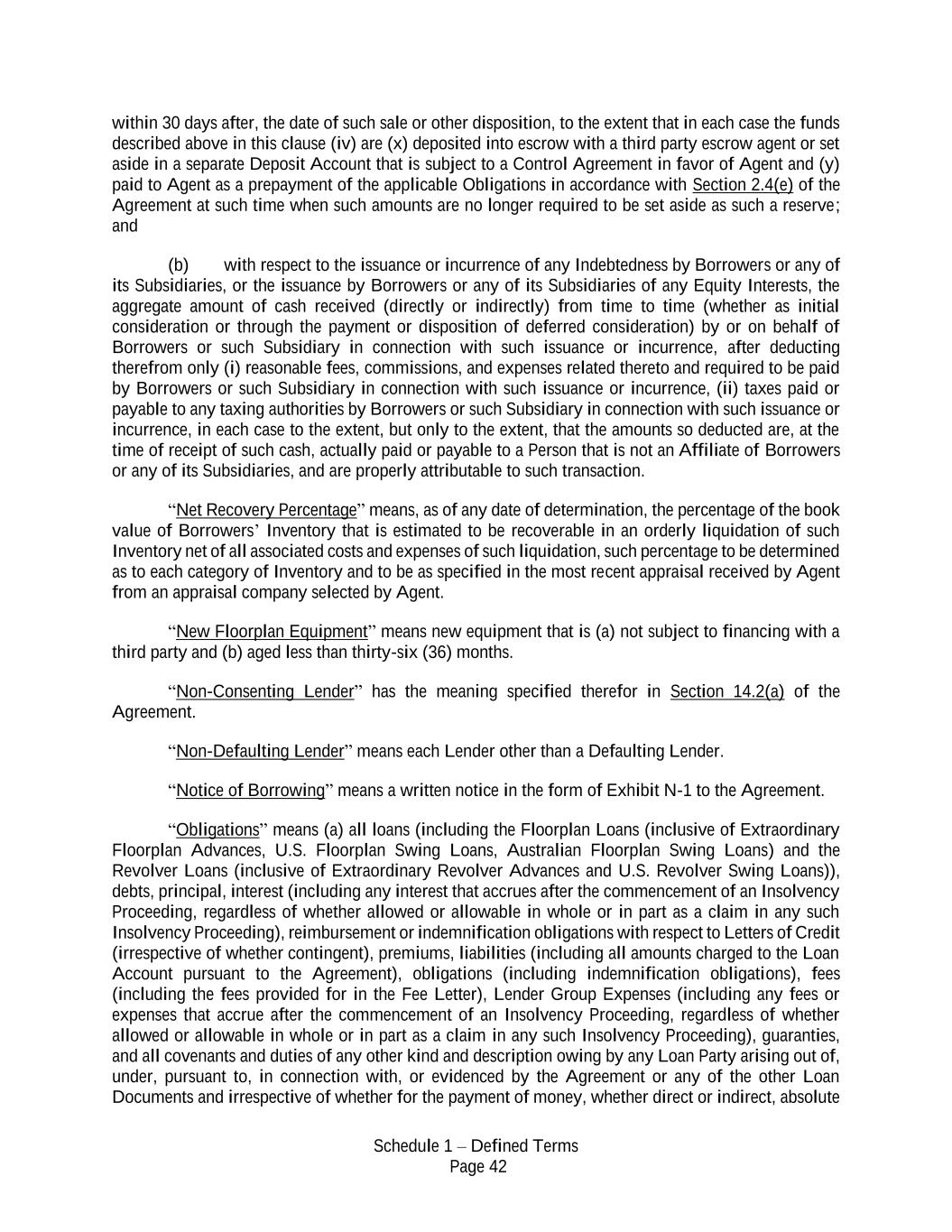 Schedule 1 – Defined Terms Page 42 within 30 days after, the date of such sale or other disposition, to the extent that in each case the funds described above in this clause (iv) are (x) deposited into escrow with a third party escrow agent or set aside in a separate Deposit Account that is subject to a Control Agreement in favor of Agent and (y) paid to Agent as a prepayment of the applicable Obligations in accordance with Section 2.4(e) of the Agreement at such time when such amounts are no longer required to be set aside as such a reserve; and (b) with respect to the issuance or incurrence of any Indebtedness by Borrowers or any of its Subsidiaries, or the issuance by Borrowers or any of its Subsidiaries of any Equity Interests, the aggregate amount of cash received (directly or indirectly) from time to time (whether as initial consideration or through the payment or disposition of deferred consideration) by or on behalf of Borrowers or such Subsidiary in connection with such issuance or incurrence, after deducting therefrom only (i) reasonable fees, commissions, and expenses related thereto and required to be paid by Borrowers or such Subsidiary in connection with such issuance or incurrence, (ii) taxes paid or payable to any taxing authorities by Borrowers or such Subsidiary in connection with such issuance or incurrence, in each case to the extent, but only to the extent, that the amounts so deducted are, at the time of receipt of such cash, actually paid or payable to a Person that is not an Affiliate of Borrowers or any of its Subsidiaries, and are properly attributable to such transaction. “Net Recovery Percentage” means, as of any date of determination, the percentage of the book value of Borrowers’ Inventory that is estimated to be recoverable in an orderly liquidation of such Inventory net of all associated costs and expenses of such liquidation, such percentage to be determined as to each category of Inventory and to be as specified in the most recent appraisal received by Agent from an appraisal company selected by Agent. “New Floorplan Equipment” means new equipment that is (a) not subject to financing with a third party and (b) aged less than thirty-six (36) months. “Non-Consenting Lender” has the meaning specified therefor in Section 14.2(a) of the Agreement. “Non-Defaulting Lender” means each Lender other than a Defaulting Lender. “Notice of Borrowing” means a written notice in the form of Exhibit N-1 to the Agreement. “Obligations” means (a) all loans (including the Floorplan Loans (inclusive of Extraordinary Floorplan Advances, U.S. Floorplan Swing Loans, Australian Floorplan Swing Loans) and the Revolver Loans (inclusive of Extraordinary Revolver Advances and U.S. Revolver Swing Loans)), debts, principal, interest (including any interest that accrues after the commencement of an Insolvency Proceeding, regardless of whether allowed or allowable in whole or in part as a claim in any such Insolvency Proceeding), reimbursement or indemnification obligations with respect to Letters of Credit (irrespective of whether contingent), premiums, liabilities (including all amounts charged to the Loan Account pursuant to the Agreement), obligations (including indemnification obligations), fees (including the fees provided for in the Fee Letter), Lender Group Expenses (including any fees or expenses that accrue after the commencement of an Insolvency Proceeding, regardless of whether allowed or allowable in whole or in part as a claim in any such Insolvency Proceeding), guaranties, and all covenants and duties of any other kind and description owing by any Loan Party arising out of, under, pursuant to, in connection with, or evidenced by the Agreement or any of the other Loan Documents and irrespective of whether for the payment of money, whether direct or indirect, absolute