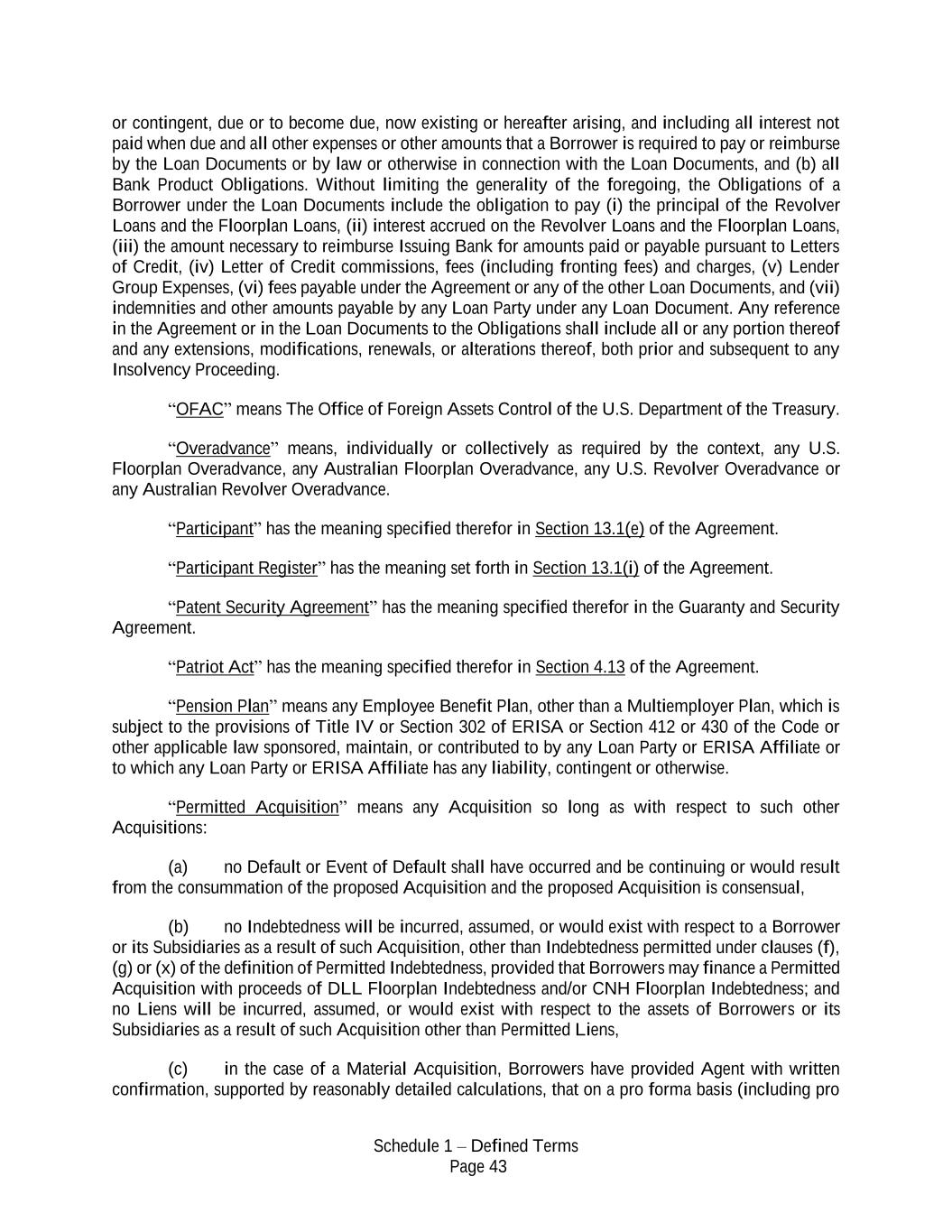 Schedule 1 – Defined Terms Page 43 or contingent, due or to become due, now existing or hereafter arising, and including all interest not paid when due and all other expenses or other amounts that a Borrower is required to pay or reimburse by the Loan Documents or by law or otherwise in connection with the Loan Documents, and (b) all Bank Product Obligations. Without limiting the generality of the foregoing, the Obligations of a Borrower under the Loan Documents include the obligation to pay (i) the principal of the Revolver Loans and the Floorplan Loans, (ii) interest accrued on the Revolver Loans and the Floorplan Loans, (iii) the amount necessary to reimburse Issuing Bank for amounts paid or payable pursuant to Letters of Credit, (iv) Letter of Credit commissions, fees (including fronting fees) and charges, (v) Lender Group Expenses, (vi) fees payable under the Agreement or any of the other Loan Documents, and (vii) indemnities and other amounts payable by any Loan Party under any Loan Document. Any reference in the Agreement or in the Loan Documents to the Obligations shall include all or any portion thereof and any extensions, modifications, renewals, or alterations thereof, both prior and subsequent to any Insolvency Proceeding. “OFAC” means The Office of Foreign Assets Control of the U.S. Department of the Treasury. “Overadvance” means, individually or collectively as required by the context, any U.S. Floorplan Overadvance, any Australian Floorplan Overadvance, any U.S. Revolver Overadvance or any Australian Revolver Overadvance. “Participant” has the meaning specified therefor in Section 13.1(e) of the Agreement. “Participant Register” has the meaning set forth in Section 13.1(i) of the Agreement. “Patent Security Agreement” has the meaning specified therefor in the Guaranty and Security Agreement. “Patriot Act” has the meaning specified therefor in Section 4.13 of the Agreement. “Pension Plan” means any Employee Benefit Plan, other than a Multiemployer Plan, which is subject to the provisions of Title IV or Section 302 of ERISA or Section 412 or 430 of the Code or other applicable law sponsored, maintain, or contributed to by any Loan Party or ERISA Affiliate or to which any Loan Party or ERISA Affiliate has any liability, contingent or otherwise. “Permitted Acquisition” means any Acquisition so long as with respect to such other Acquisitions: (a) no Default or Event of Default shall have occurred and be continuing or would result from the consummation of the proposed Acquisition and the proposed Acquisition is consensual, (b) no Indebtedness will be incurred, assumed, or would exist with respect to a Borrower or its Subsidiaries as a result of such Acquisition, other than Indebtedness permitted under clauses (f), (g) or (x) of the definition of Permitted Indebtedness, provided that Borrowers may finance a Permitted Acquisition with proceeds of DLL Floorplan Indebtedness and/or CNH Floorplan Indebtedness; and no Liens will be incurred, assumed, or would exist with respect to the assets of Borrowers or its Subsidiaries as a result of such Acquisition other than Permitted Liens, (c) in the case of a Material Acquisition, Borrowers have provided Agent with written confirmation, supported by reasonably detailed calculations, that on a pro forma basis (including pro