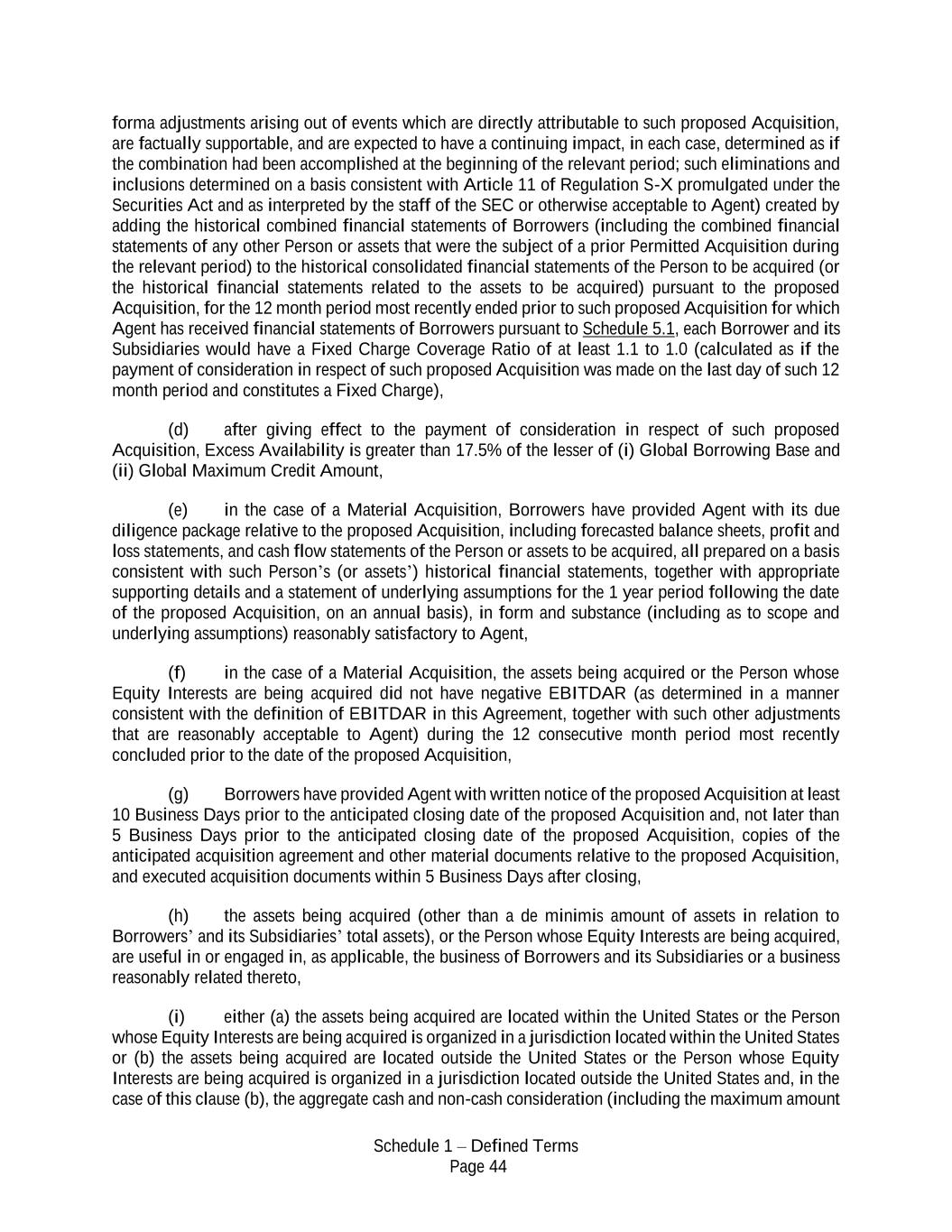 Schedule 1 – Defined Terms Page 44 forma adjustments arising out of events which are directly attributable to such proposed Acquisition, are factually supportable, and are expected to have a continuing impact, in each case, determined as if the combination had been accomplished at the beginning of the relevant period; such eliminations and inclusions determined on a basis consistent with Article 11 of Regulation S-X promulgated under the Securities Act and as interpreted by the staff of the SEC or otherwise acceptable to Agent) created by adding the historical combined financial statements of Borrowers (including the combined financial statements of any other Person or assets that were the subject of a prior Permitted Acquisition during the relevant period) to the historical consolidated financial statements of the Person to be acquired (or the historical financial statements related to the assets to be acquired) pursuant to the proposed Acquisition, for the 12 month period most recently ended prior to such proposed Acquisition for which Agent has received financial statements of Borrowers pursuant to Schedule 5.1, each Borrower and its Subsidiaries would have a Fixed Charge Coverage Ratio of at least 1.1 to 1.0 (calculated as if the payment of consideration in respect of such proposed Acquisition was made on the last day of such 12 month period and constitutes a Fixed Charge), (d) after giving effect to the payment of consideration in respect of such proposed Acquisition, Excess Availability is greater than 17.5% of the lesser of (i) Global Borrowing Base and (ii) Global Maximum Credit Amount, (e) in the case of a Material Acquisition, Borrowers have provided Agent with its due diligence package relative to the proposed Acquisition, including forecasted balance sheets, profit and loss statements, and cash flow statements of the Person or assets to be acquired, all prepared on a basis consistent with such Person’s (or assets’) historical financial statements, together with appropriate supporting details and a statement of underlying assumptions for the 1 year period following the date of the proposed Acquisition, on an annual basis), in form and substance (including as to scope and underlying assumptions) reasonably satisfactory to Agent, (f) in the case of a Material Acquisition, the assets being acquired or the Person whose Equity Interests are being acquired did not have negative EBITDAR (as determined in a manner consistent with the definition of EBITDAR in this Agreement, together with such other adjustments that are reasonably acceptable to Agent) during the 12 consecutive month period most recently concluded prior to the date of the proposed Acquisition, (g) Borrowers have provided Agent with written notice of the proposed Acquisition at least 10 Business Days prior to the anticipated closing date of the proposed Acquisition and, not later than 5 Business Days prior to the anticipated closing date of the proposed Acquisition, copies of the anticipated acquisition agreement and other material documents relative to the proposed Acquisition, and executed acquisition documents within 5 Business Days after closing, (h) the assets being acquired (other than a de minimis amount of assets in relation to Borrowers’ and its Subsidiaries’ total assets), or the Person whose Equity Interests are being acquired, are useful in or engaged in, as applicable, the business of Borrowers and its Subsidiaries or a business reasonably related thereto, (i) either (a) the assets being acquired are located within the United States or the Person whose Equity Interests are being acquired is organized in a jurisdiction located within the United States or (b) the assets being acquired are located outside the United States or the Person whose Equity Interests are being acquired is organized in a jurisdiction located outside the United States and, in the case of this clause (b), the aggregate cash and non-cash consideration (including the maximum amount