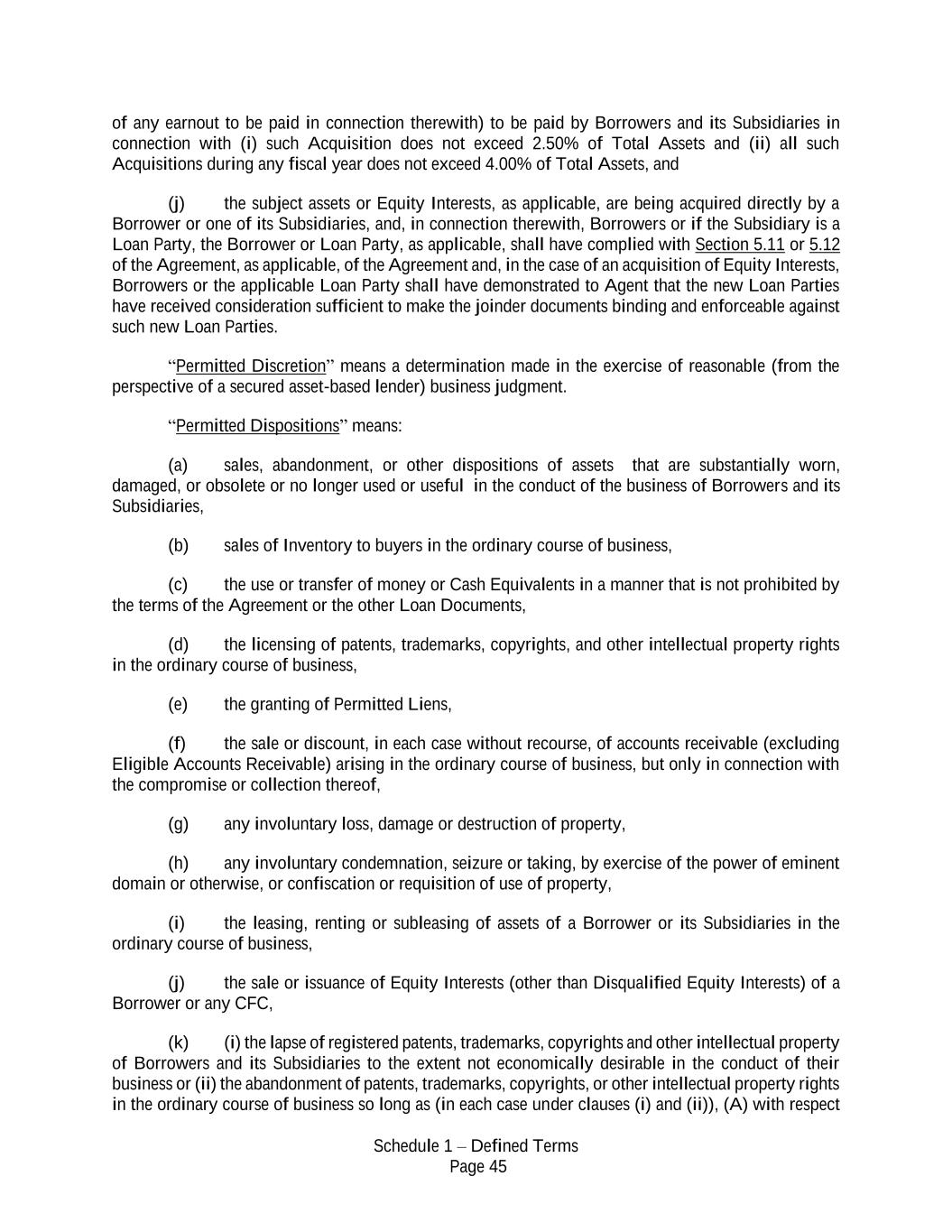 Schedule 1 – Defined Terms Page 45 of any earnout to be paid in connection therewith) to be paid by Borrowers and its Subsidiaries in connection with (i) such Acquisition does not exceed 2.50% of Total Assets and (ii) all such Acquisitions during any fiscal year does not exceed 4.00% of Total Assets, and (j) the subject assets or Equity Interests, as applicable, are being acquired directly by a Borrower or one of its Subsidiaries, and, in connection therewith, Borrowers or if the Subsidiary is a Loan Party, the Borrower or Loan Party, as applicable, shall have complied with Section 5.11 or 5.12 of the Agreement, as applicable, of the Agreement and, in the case of an acquisition of Equity Interests, Borrowers or the applicable Loan Party shall have demonstrated to Agent that the new Loan Parties have received consideration sufficient to make the joinder documents binding and enforceable against such new Loan Parties. “Permitted Discretion” means a determination made in the exercise of reasonable (from the perspective of a secured asset-based lender) business judgment. “Permitted Dispositions” means: (a) sales, abandonment, or other dispositions of assets that are substantially worn, damaged, or obsolete or no longer used or useful in the conduct of the business of Borrowers and its Subsidiaries, (b) sales of Inventory to buyers in the ordinary course of business, (c) the use or transfer of money or Cash Equivalents in a manner that is not prohibited by the terms of the Agreement or the other Loan Documents, (d) the licensing of patents, trademarks, copyrights, and other intellectual property rights in the ordinary course of business, (e) the granting of Permitted Liens, (f) the sale or discount, in each case without recourse, of accounts receivable (excluding Eligible Accounts Receivable) arising in the ordinary course of business, but only in connection with the compromise or collection thereof, (g) any involuntary loss, damage or destruction of property, (h) any involuntary condemnation, seizure or taking, by exercise of the power of eminent domain or otherwise, or confiscation or requisition of use of property, (i) the leasing, renting or subleasing of assets of a Borrower or its Subsidiaries in the ordinary course of business, (j) the sale or issuance of Equity Interests (other than Disqualified Equity Interests) of a Borrower or any CFC, (k) (i) the lapse of registered patents, trademarks, copyrights and other intellectual property of Borrowers and its Subsidiaries to the extent not economically desirable in the conduct of their business or (ii) the abandonment of patents, trademarks, copyrights, or other intellectual property rights in the ordinary course of business so long as (in each case under clauses (i) and (ii)), (A) with respect