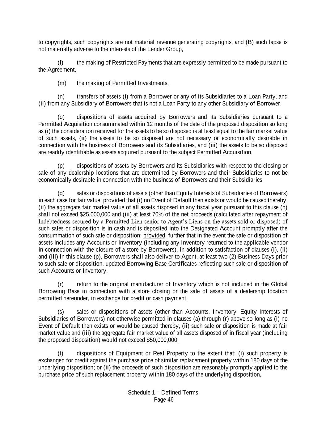 Schedule 1 – Defined Terms Page 46 to copyrights, such copyrights are not material revenue generating copyrights, and (B) such lapse is not materially adverse to the interests of the Lender Group, (l) the making of Restricted Payments that are expressly permitted to be made pursuant to the Agreement, (m) the making of Permitted Investments, (n) transfers of assets (i) from a Borrower or any of its Subsidiaries to a Loan Party, and (ii) from any Subsidiary of Borrowers that is not a Loan Party to any other Subsidiary of Borrower, (o) dispositions of assets acquired by Borrowers and its Subsidiaries pursuant to a Permitted Acquisition consummated within 12 months of the date of the proposed disposition so long as (i) the consideration received for the assets to be so disposed is at least equal to the fair market value of such assets, (ii) the assets to be so disposed are not necessary or economically desirable in connection with the business of Borrowers and its Subsidiaries, and (iii) the assets to be so disposed are readily identifiable as assets acquired pursuant to the subject Permitted Acquisition, (p) dispositions of assets by Borrowers and its Subsidiaries with respect to the closing or sale of any dealership locations that are determined by Borrowers and their Subsidiaries to not be economically desirable in connection with the business of Borrowers and their Subsidiaries, (q) sales or dispositions of assets (other than Equity Interests of Subsidiaries of Borrowers) in each case for fair value; provided that (i) no Event of Default then exists or would be caused thereby, (ii) the aggregate fair market value of all assets disposed in any fiscal year pursuant to this clause (p) shall not exceed $25,000,000 and (iii) at least 70% of the net proceeds (calculated after repayment of Indebtedness secured by a Permitted Lien senior to Agent’s Liens on the assets sold or disposed) of such sales or disposition is in cash and is deposited into the Designated Account promptly after the consummation of such sale or disposition; provided, further that in the event the sale or disposition of assets includes any Accounts or Inventory (including any Inventory returned to the applicable vendor in connection with the closure of a store by Borrowers), in addition to satisfaction of clauses (i), (ii) and (iii) in this clause (p), Borrowers shall also deliver to Agent, at least two (2) Business Days prior to such sale or disposition, updated Borrowing Base Certificates reflecting such sale or disposition of such Accounts or Inventory, (r) return to the original manufacturer of Inventory which is not included in the Global Borrowing Base in connection with a store closing or the sale of assets of a dealership location permitted hereunder, in exchange for credit or cash payment, (s) sales or dispositions of assets (other than Accounts, Inventory, Equity Interests of Subsidiaries of Borrowers) not otherwise permitted in clauses (a) through (r) above so long as (i) no Event of Default then exists or would be caused thereby, (ii) such sale or disposition is made at fair market value and (iii) the aggregate fair market value of all assets disposed of in fiscal year (including the proposed disposition) would not exceed $50,000,000, (t) dispositions of Equipment or Real Property to the extent that: (i) such property is exchanged for credit against the purchase price of similar replacement property within 180 days of the underlying disposition; or (ii) the proceeds of such disposition are reasonably promptly applied to the purchase price of such replacement property within 180 days of the underlying disposition,