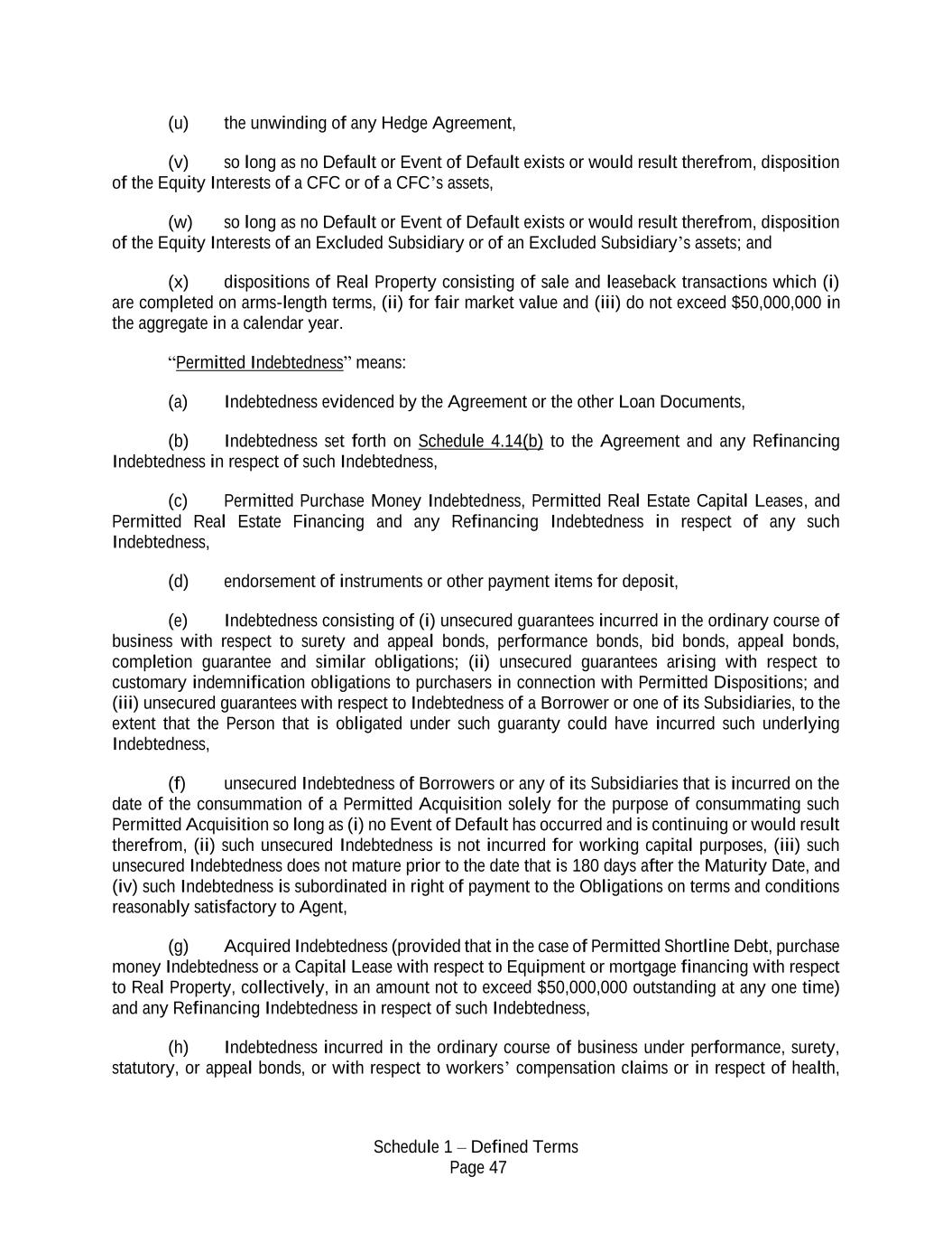 Schedule 1 – Defined Terms Page 47 (u) the unwinding of any Hedge Agreement, (v) so long as no Default or Event of Default exists or would result therefrom, disposition of the Equity Interests of a CFC or of a CFC’s assets, (w) so long as no Default or Event of Default exists or would result therefrom, disposition of the Equity Interests of an Excluded Subsidiary or of an Excluded Subsidiary’s assets; and (x) dispositions of Real Property consisting of sale and leaseback transactions which (i) are completed on arms-length terms, (ii) for fair market value and (iii) do not exceed $50,000,000 in the aggregate in a calendar year. “Permitted Indebtedness” means: (a) Indebtedness evidenced by the Agreement or the other Loan Documents, (b) Indebtedness set forth on Schedule 4.14(b) to the Agreement and any Refinancing Indebtedness in respect of such Indebtedness, (c) Permitted Purchase Money Indebtedness, Permitted Real Estate Capital Leases, and Permitted Real Estate Financing and any Refinancing Indebtedness in respect of any such Indebtedness, (d) endorsement of instruments or other payment items for deposit, (e) Indebtedness consisting of (i) unsecured guarantees incurred in the ordinary course of business with respect to surety and appeal bonds, performance bonds, bid bonds, appeal bonds, completion guarantee and similar obligations; (ii) unsecured guarantees arising with respect to customary indemnification obligations to purchasers in connection with Permitted Dispositions; and (iii) unsecured guarantees with respect to Indebtedness of a Borrower or one of its Subsidiaries, to the extent that the Person that is obligated under such guaranty could have incurred such underlying Indebtedness, (f) unsecured Indebtedness of Borrowers or any of its Subsidiaries that is incurred on the date of the consummation of a Permitted Acquisition solely for the purpose of consummating such Permitted Acquisition so long as (i) no Event of Default has occurred and is continuing or would result therefrom, (ii) such unsecured Indebtedness is not incurred for working capital purposes, (iii) such unsecured Indebtedness does not mature prior to the date that is 180 days after the Maturity Date, and (iv) such Indebtedness is subordinated in right of payment to the Obligations on terms and conditions reasonably satisfactory to Agent, (g) Acquired Indebtedness (provided that in the case of Permitted Shortline Debt, purchase money Indebtedness or a Capital Lease with respect to Equipment or mortgage financing with respect to Real Property, collectively, in an amount not to exceed $50,000,000 outstanding at any one time) and any Refinancing Indebtedness in respect of such Indebtedness, (h) Indebtedness incurred in the ordinary course of business under performance, surety, statutory, or appeal bonds, or with respect to workers’ compensation claims or in respect of health,