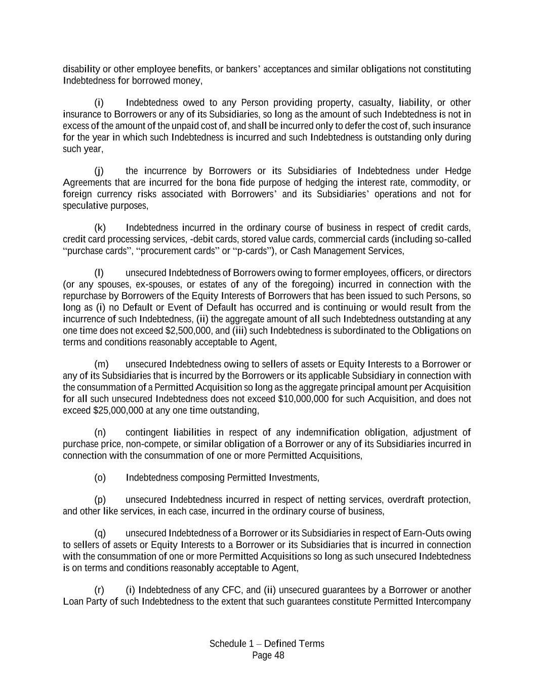 Schedule 1 – Defined Terms Page 48 disability or other employee benefits, or bankers’ acceptances and similar obligations not constituting Indebtedness for borrowed money, (i) Indebtedness owed to any Person providing property, casualty, liability, or other insurance to Borrowers or any of its Subsidiaries, so long as the amount of such Indebtedness is not in excess of the amount of the unpaid cost of, and shall be incurred only to defer the cost of, such insurance for the year in which such Indebtedness is incurred and such Indebtedness is outstanding only during such year, (j) the incurrence by Borrowers or its Subsidiaries of Indebtedness under Hedge Agreements that are incurred for the bona fide purpose of hedging the interest rate, commodity, or foreign currency risks associated with Borrowers’ and its Subsidiaries’ operations and not for speculative purposes, (k) Indebtedness incurred in the ordinary course of business in respect of credit cards, credit card processing services, -debit cards, stored value cards, commercial cards (including so-called “purchase cards”, “procurement cards” or “p-cards”), or Cash Management Services, (l) unsecured Indebtedness of Borrowers owing to former employees, officers, or directors (or any spouses, ex-spouses, or estates of any of the foregoing) incurred in connection with the repurchase by Borrowers of the Equity Interests of Borrowers that has been issued to such Persons, so long as (i) no Default or Event of Default has occurred and is continuing or would result from the incurrence of such Indebtedness, (ii) the aggregate amount of all such Indebtedness outstanding at any one time does not exceed $2,500,000, and (iii) such Indebtedness is subordinated to the Obligations on terms and conditions reasonably acceptable to Agent, (m) unsecured Indebtedness owing to sellers of assets or Equity Interests to a Borrower or any of its Subsidiaries that is incurred by the Borrowers or its applicable Subsidiary in connection with the consummation of a Permitted Acquisition so long as the aggregate principal amount per Acquisition for all such unsecured Indebtedness does not exceed $10,000,000 for such Acquisition, and does not exceed $25,000,000 at any one time outstanding, (n) contingent liabilities in respect of any indemnification obligation, adjustment of purchase price, non-compete, or similar obligation of a Borrower or any of its Subsidiaries incurred in connection with the consummation of one or more Permitted Acquisitions, (o) Indebtedness composing Permitted Investments, (p) unsecured Indebtedness incurred in respect of netting services, overdraft protection, and other like services, in each case, incurred in the ordinary course of business, (q) unsecured Indebtedness of a Borrower or its Subsidiaries in respect of Earn-Outs owing to sellers of assets or Equity Interests to a Borrower or its Subsidiaries that is incurred in connection with the consummation of one or more Permitted Acquisitions so long as such unsecured Indebtedness is on terms and conditions reasonably acceptable to Agent, (r) (i) Indebtedness of any CFC, and (ii) unsecured guarantees by a Borrower or another Loan Party of such Indebtedness to the extent that such guarantees constitute Permitted Intercompany