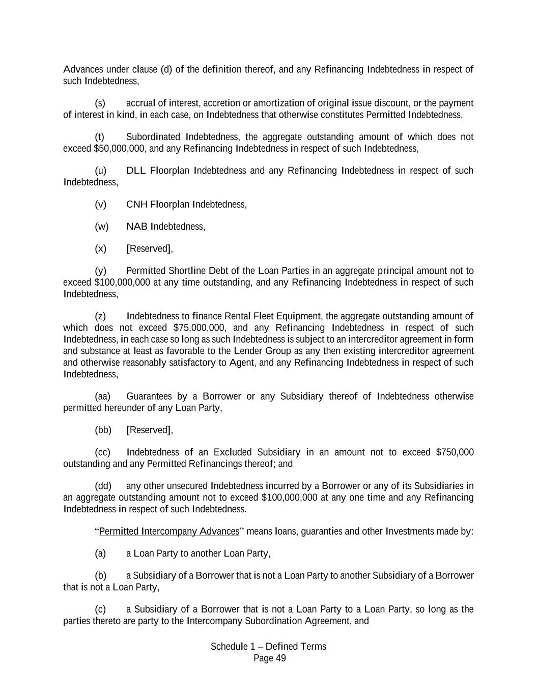 Schedule 1 – Defined Terms Page 49 Advances under clause (d) of the definition thereof, and any Refinancing Indebtedness in respect of such Indebtedness, (s) accrual of interest, accretion or amortization of original issue discount, or the payment of interest in kind, in each case, on Indebtedness that otherwise constitutes Permitted Indebtedness, (t) Subordinated Indebtedness, the aggregate outstanding amount of which does not exceed $50,000,000, and any Refinancing Indebtedness in respect of such Indebtedness, (u) DLL Floorplan Indebtedness and any Refinancing Indebtedness in respect of such Indebtedness, (v) CNH Floorplan Indebtedness, (w) NAB Indebtedness, (x) [Reserved], (y) Permitted Shortline Debt of the Loan Parties in an aggregate principal amount not to exceed $100,000,000 at any time outstanding, and any Refinancing Indebtedness in respect of such Indebtedness, (z) Indebtedness to finance Rental Fleet Equipment, the aggregate outstanding amount of which does not exceed $75,000,000, and any Refinancing Indebtedness in respect of such Indebtedness, in each case so long as such Indebtedness is subject to an intercreditor agreement in form and substance at least as favorable to the Lender Group as any then existing intercreditor agreement and otherwise reasonably satisfactory to Agent, and any Refinancing Indebtedness in respect of such Indebtedness, (aa) Guarantees by a Borrower or any Subsidiary thereof of Indebtedness otherwise permitted hereunder of any Loan Party, (bb) [Reserved], (cc) Indebtedness of an Excluded Subsidiary in an amount not to exceed $750,000 outstanding and any Permitted Refinancings thereof; and (dd) any other unsecured Indebtedness incurred by a Borrower or any of its Subsidiaries in an aggregate outstanding amount not to exceed $100,000,000 at any one time and any Refinancing Indebtedness in respect of such Indebtedness. “Permitted Intercompany Advances” means loans, guaranties and other Investments made by: (a) a Loan Party to another Loan Party, (b) a Subsidiary of a Borrower that is not a Loan Party to another Subsidiary of a Borrower that is not a Loan Party, (c) a Subsidiary of a Borrower that is not a Loan Party to a Loan Party, so long as the parties thereto are party to the Intercompany Subordination Agreement, and