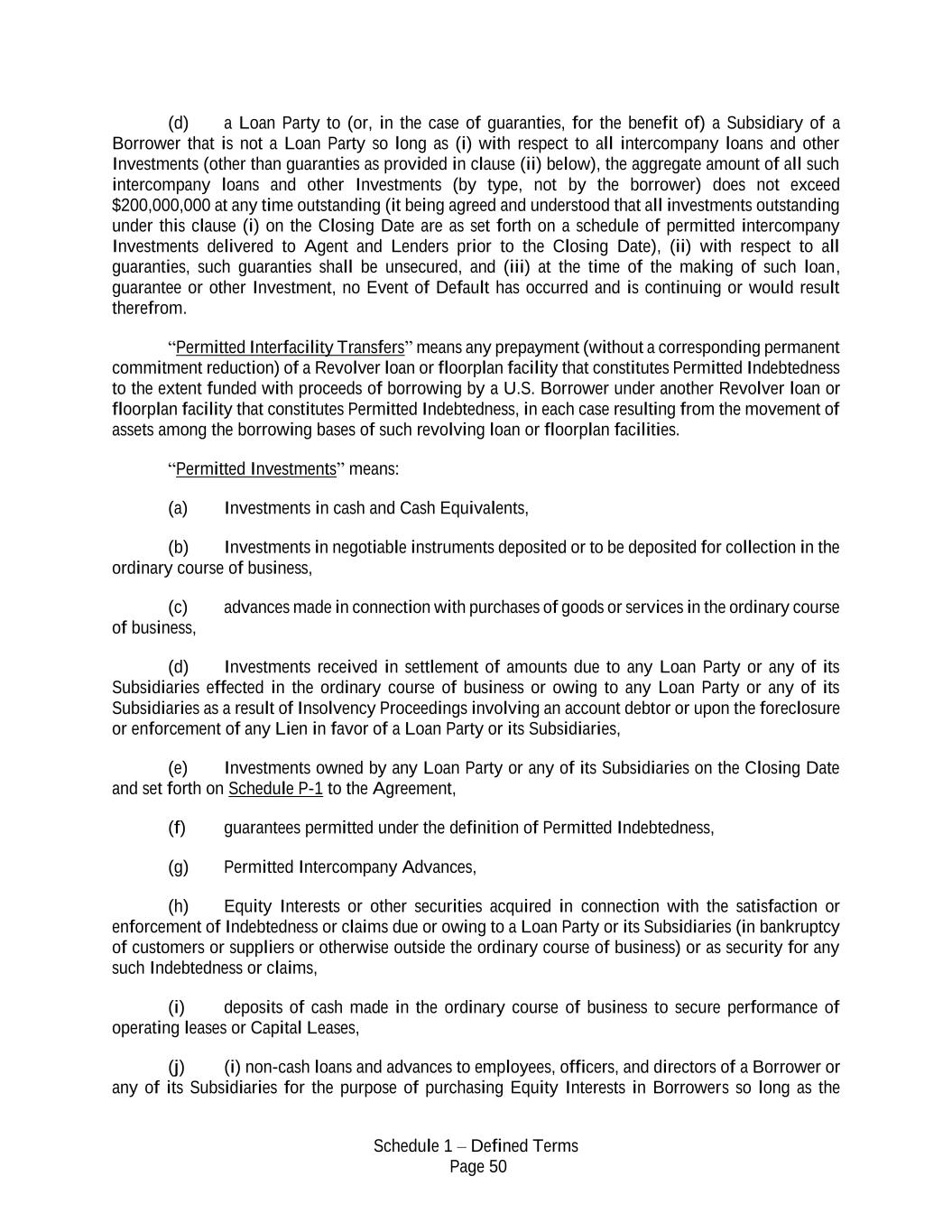Schedule 1 – Defined Terms Page 50 (d) a Loan Party to (or, in the case of guaranties, for the benefit of) a Subsidiary of a Borrower that is not a Loan Party so long as (i) with respect to all intercompany loans and other Investments (other than guaranties as provided in clause (ii) below), the aggregate amount of all such intercompany loans and other Investments (by type, not by the borrower) does not exceed $200,000,000 at any time outstanding (it being agreed and understood that all investments outstanding under this clause (i) on the Closing Date are as set forth on a schedule of permitted intercompany Investments delivered to Agent and Lenders prior to the Closing Date), (ii) with respect to all guaranties, such guaranties shall be unsecured, and (iii) at the time of the making of such loan, guarantee or other Investment, no Event of Default has occurred and is continuing or would result therefrom. “Permitted Interfacility Transfers” means any prepayment (without a corresponding permanent commitment reduction) of a Revolver loan or floorplan facility that constitutes Permitted Indebtedness to the extent funded with proceeds of borrowing by a U.S. Borrower under another Revolver loan or floorplan facility that constitutes Permitted Indebtedness, in each case resulting from the movement of assets among the borrowing bases of such revolving loan or floorplan facilities. “Permitted Investments” means: (a) Investments in cash and Cash Equivalents, (b) Investments in negotiable instruments deposited or to be deposited for collection in the ordinary course of business, (c) advances made in connection with purchases of goods or services in the ordinary course of business, (d) Investments received in settlement of amounts due to any Loan Party or any of its Subsidiaries effected in the ordinary course of business or owing to any Loan Party or any of its Subsidiaries as a result of Insolvency Proceedings involving an account debtor or upon the foreclosure or enforcement of any Lien in favor of a Loan Party or its Subsidiaries, (e) Investments owned by any Loan Party or any of its Subsidiaries on the Closing Date and set forth on Schedule P-1 to the Agreement, (f) guarantees permitted under the definition of Permitted Indebtedness, (g) Permitted Intercompany Advances, (h) Equity Interests or other securities acquired in connection with the satisfaction or enforcement of Indebtedness or claims due or owing to a Loan Party or its Subsidiaries (in bankruptcy of customers or suppliers or otherwise outside the ordinary course of business) or as security for any such Indebtedness or claims, (i) deposits of cash made in the ordinary course of business to secure performance of operating leases or Capital Leases, (j) (i) non-cash loans and advances to employees, officers, and directors of a Borrower or any of its Subsidiaries for the purpose of purchasing Equity Interests in Borrowers so long as the