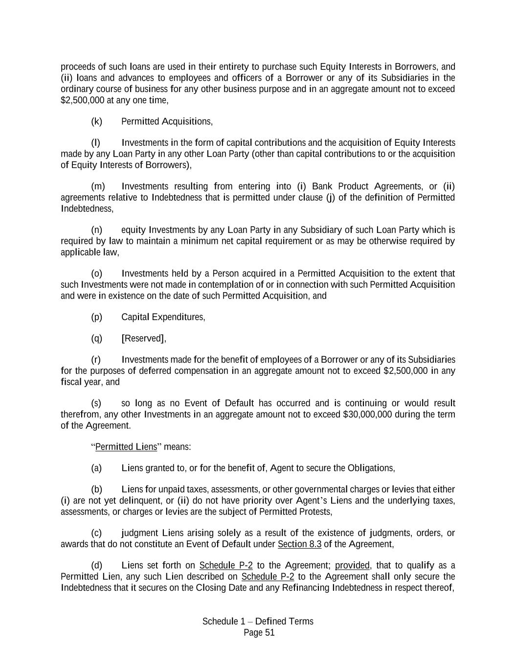 Schedule 1 – Defined Terms Page 51 proceeds of such loans are used in their entirety to purchase such Equity Interests in Borrowers, and (ii) loans and advances to employees and officers of a Borrower or any of its Subsidiaries in the ordinary course of business for any other business purpose and in an aggregate amount not to exceed $2,500,000 at any one time, (k) Permitted Acquisitions, (l) Investments in the form of capital contributions and the acquisition of Equity Interests made by any Loan Party in any other Loan Party (other than capital contributions to or the acquisition of Equity Interests of Borrowers), (m) Investments resulting from entering into (i) Bank Product Agreements, or (ii) agreements relative to Indebtedness that is permitted under clause (j) of the definition of Permitted Indebtedness, (n) equity Investments by any Loan Party in any Subsidiary of such Loan Party which is required by law to maintain a minimum net capital requirement or as may be otherwise required by applicable law, (o) Investments held by a Person acquired in a Permitted Acquisition to the extent that such Investments were not made in contemplation of or in connection with such Permitted Acquisition and were in existence on the date of such Permitted Acquisition, and (p) Capital Expenditures, (q) [Reserved], (r) Investments made for the benefit of employees of a Borrower or any of its Subsidiaries for the purposes of deferred compensation in an aggregate amount not to exceed $2,500,000 in any fiscal year, and (s) so long as no Event of Default has occurred and is continuing or would result therefrom, any other Investments in an aggregate amount not to exceed $30,000,000 during the term of the Agreement. “Permitted Liens” means: (a) Liens granted to, or for the benefit of, Agent to secure the Obligations, (b) Liens for unpaid taxes, assessments, or other governmental charges or levies that either (i) are not yet delinquent, or (ii) do not have priority over Agent’s Liens and the underlying taxes, assessments, or charges or levies are the subject of Permitted Protests, (c) judgment Liens arising solely as a result of the existence of judgments, orders, or awards that do not constitute an Event of Default under Section 8.3 of the Agreement, (d) Liens set forth on Schedule P-2 to the Agreement; provided, that to qualify as a Permitted Lien, any such Lien described on Schedule P-2 to the Agreement shall only secure the Indebtedness that it secures on the Closing Date and any Refinancing Indebtedness in respect thereof,