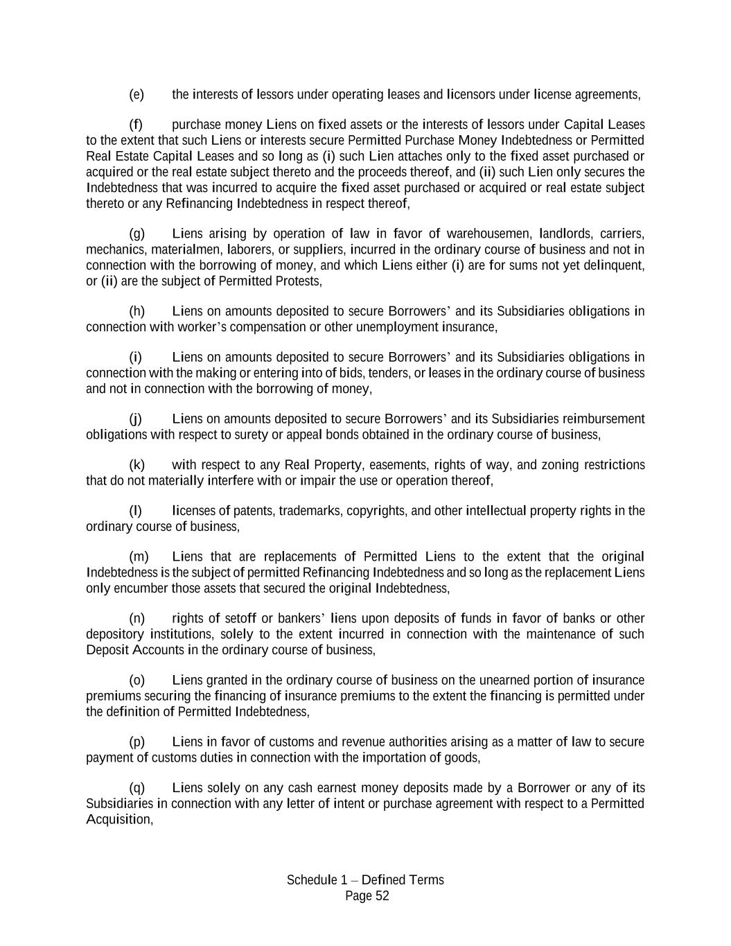 Schedule 1 – Defined Terms Page 52 (e) the interests of lessors under operating leases and licensors under license agreements, (f) purchase money Liens on fixed assets or the interests of lessors under Capital Leases to the extent that such Liens or interests secure Permitted Purchase Money Indebtedness or Permitted Real Estate Capital Leases and so long as (i) such Lien attaches only to the fixed asset purchased or acquired or the real estate subject thereto and the proceeds thereof, and (ii) such Lien only secures the Indebtedness that was incurred to acquire the fixed asset purchased or acquired or real estate subject thereto or any Refinancing Indebtedness in respect thereof, (g) Liens arising by operation of law in favor of warehousemen, landlords, carriers, mechanics, materialmen, laborers, or suppliers, incurred in the ordinary course of business and not in connection with the borrowing of money, and which Liens either (i) are for sums not yet delinquent, or (ii) are the subject of Permitted Protests, (h) Liens on amounts deposited to secure Borrowers’ and its Subsidiaries obligations in connection with worker’s compensation or other unemployment insurance, (i) Liens on amounts deposited to secure Borrowers’ and its Subsidiaries obligations in connection with the making or entering into of bids, tenders, or leases in the ordinary course of business and not in connection with the borrowing of money, (j) Liens on amounts deposited to secure Borrowers’ and its Subsidiaries reimbursement obligations with respect to surety or appeal bonds obtained in the ordinary course of business, (k) with respect to any Real Property, easements, rights of way, and zoning restrictions that do not materially interfere with or impair the use or operation thereof, (l) licenses of patents, trademarks, copyrights, and other intellectual property rights in the ordinary course of business, (m) Liens that are replacements of Permitted Liens to the extent that the original Indebtedness is the subject of permitted Refinancing Indebtedness and so long as the replacement Liens only encumber those assets that secured the original Indebtedness, (n) rights of setoff or bankers’ liens upon deposits of funds in favor of banks or other depository institutions, solely to the extent incurred in connection with the maintenance of such Deposit Accounts in the ordinary course of business, (o) Liens granted in the ordinary course of business on the unearned portion of insurance premiums securing the financing of insurance premiums to the extent the financing is permitted under the definition of Permitted Indebtedness, (p) Liens in favor of customs and revenue authorities arising as a matter of law to secure payment of customs duties in connection with the importation of goods, (q) Liens solely on any cash earnest money deposits made by a Borrower or any of its Subsidiaries in connection with any letter of intent or purchase agreement with respect to a Permitted Acquisition,