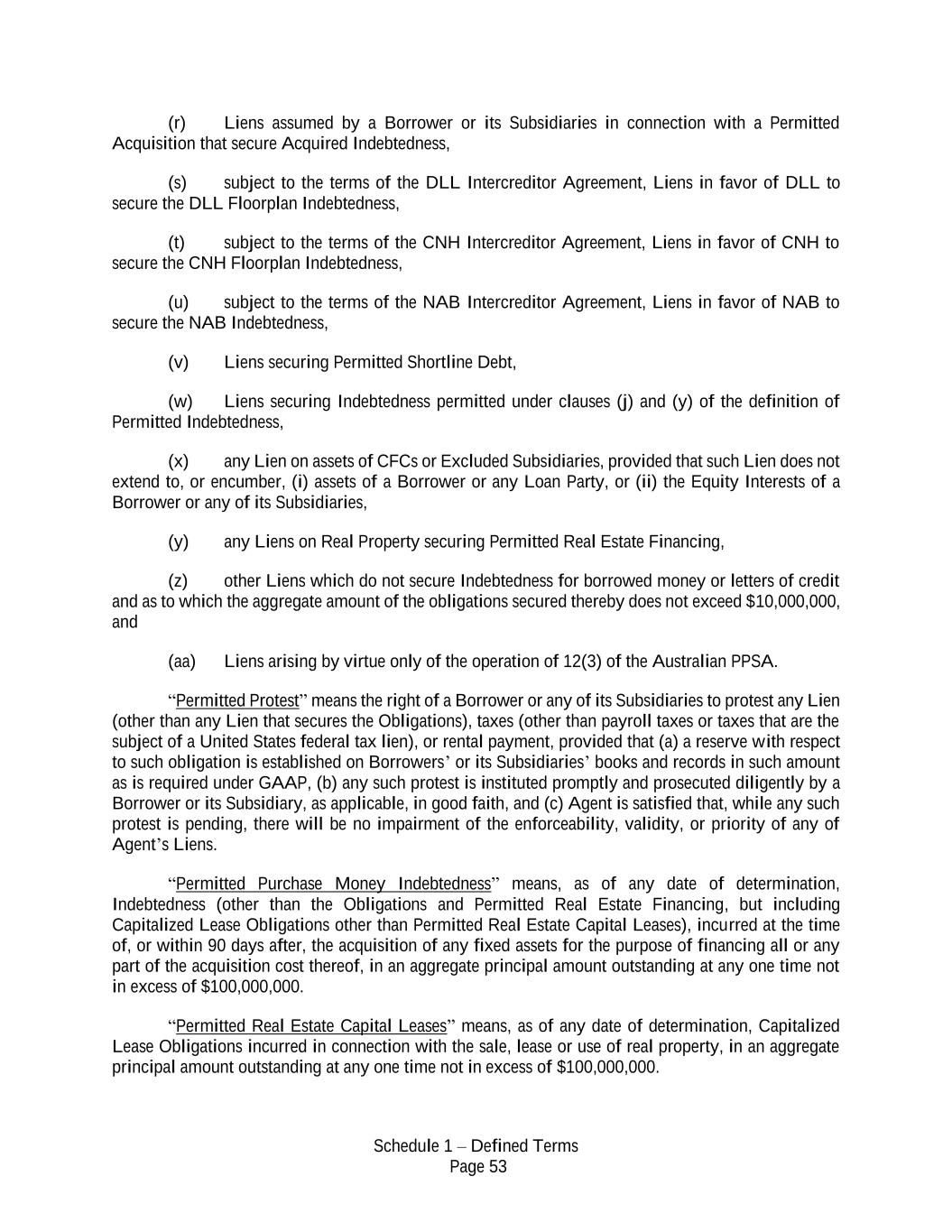 Schedule 1 – Defined Terms Page 53 (r) Liens assumed by a Borrower or its Subsidiaries in connection with a Permitted Acquisition that secure Acquired Indebtedness, (s) subject to the terms of the DLL Intercreditor Agreement, Liens in favor of DLL to secure the DLL Floorplan Indebtedness, (t) subject to the terms of the CNH Intercreditor Agreement, Liens in favor of CNH to secure the CNH Floorplan Indebtedness, (u) subject to the terms of the NAB Intercreditor Agreement, Liens in favor of NAB to secure the NAB Indebtedness, (v) Liens securing Permitted Shortline Debt, (w) Liens securing Indebtedness permitted under clauses (j) and (y) of the definition of Permitted Indebtedness, (x) any Lien on assets of CFCs or Excluded Subsidiaries, provided that such Lien does not extend to, or encumber, (i) assets of a Borrower or any Loan Party, or (ii) the Equity Interests of a Borrower or any of its Subsidiaries, (y) any Liens on Real Property securing Permitted Real Estate Financing, (z) other Liens which do not secure Indebtedness for borrowed money or letters of credit and as to which the aggregate amount of the obligations secured thereby does not exceed $10,000,000, and (aa) Liens arising by virtue only of the operation of 12(3) of the Australian PPSA. “Permitted Protest” means the right of a Borrower or any of its Subsidiaries to protest any Lien (other than any Lien that secures the Obligations), taxes (other than payroll taxes or taxes that are the subject of a United States federal tax lien), or rental payment, provided that (a) a reserve with respect to such obligation is established on Borrowers’ or its Subsidiaries’ books and records in such amount as is required under GAAP, (b) any such protest is instituted promptly and prosecuted diligently by a Borrower or its Subsidiary, as applicable, in good faith, and (c) Agent is satisfied that, while any such protest is pending, there will be no impairment of the enforceability, validity, or priority of any of Agent’s Liens. “Permitted Purchase Money Indebtedness” means, as of any date of determination, Indebtedness (other than the Obligations and Permitted Real Estate Financing, but including Capitalized Lease Obligations other than Permitted Real Estate Capital Leases), incurred at the time of, or within 90 days after, the acquisition of any fixed assets for the purpose of financing all or any part of the acquisition cost thereof, in an aggregate principal amount outstanding at any one time not in excess of $100,000,000. “Permitted Real Estate Capital Leases” means, as of any date of determination, Capitalized Lease Obligations incurred in connection with the sale, lease or use of real property, in an aggregate principal amount outstanding at any one time not in excess of $100,000,000.