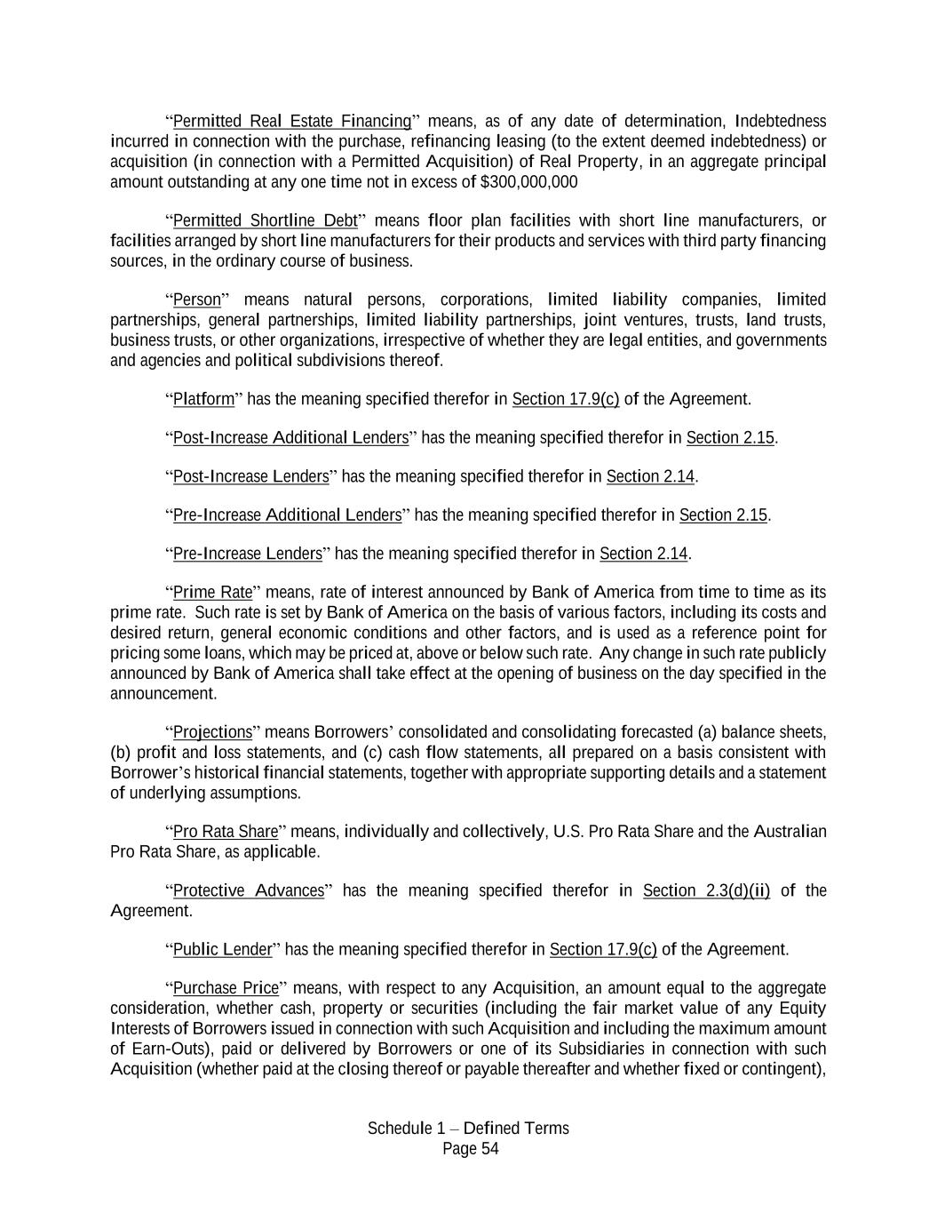 Schedule 1 – Defined Terms Page 54 “Permitted Real Estate Financing” means, as of any date of determination, Indebtedness incurred in connection with the purchase, refinancing leasing (to the extent deemed indebtedness) or acquisition (in connection with a Permitted Acquisition) of Real Property, in an aggregate principal amount outstanding at any one time not in excess of $300,000,000 “Permitted Shortline Debt” means floor plan facilities with short line manufacturers, or facilities arranged by short line manufacturers for their products and services with third party financing sources, in the ordinary course of business. “Person” means natural persons, corporations, limited liability companies, limited partnerships, general partnerships, limited liability partnerships, joint ventures, trusts, land trusts, business trusts, or other organizations, irrespective of whether they are legal entities, and governments and agencies and political subdivisions thereof. “Platform” has the meaning specified therefor in Section 17.9(c) of the Agreement. “Post-Increase Additional Lenders” has the meaning specified therefor in Section 2.15. “Post-Increase Lenders” has the meaning specified therefor in Section 2.14. “Pre-Increase Additional Lenders” has the meaning specified therefor in Section 2.15. “Pre-Increase Lenders” has the meaning specified therefor in Section 2.14. “Prime Rate” means, rate of interest announced by Bank of America from time to time as its prime rate. Such rate is set by Bank of America on the basis of various factors, including its costs and desired return, general economic conditions and other factors, and is used as a reference point for pricing some loans, which may be priced at, above or below such rate. Any change in such rate publicly announced by Bank of America shall take effect at the opening of business on the day specified in the announcement. “Projections” means Borrowers’ consolidated and consolidating forecasted (a) balance sheets, (b) profit and loss statements, and (c) cash flow statements, all prepared on a basis consistent with Borrower’s historical financial statements, together with appropriate supporting details and a statement of underlying assumptions. “Pro Rata Share” means, individually and collectively, U.S. Pro Rata Share and the Australian Pro Rata Share, as applicable. “Protective Advances” has the meaning specified therefor in Section 2.3(d)(ii) of the Agreement. “Public Lender” has the meaning specified therefor in Section 17.9(c) of the Agreement. “Purchase Price” means, with respect to any Acquisition, an amount equal to the aggregate consideration, whether cash, property or securities (including the fair market value of any Equity Interests of Borrowers issued in connection with such Acquisition and including the maximum amount of Earn-Outs), paid or delivered by Borrowers or one of its Subsidiaries in connection with such Acquisition (whether paid at the closing thereof or payable thereafter and whether fixed or contingent),
