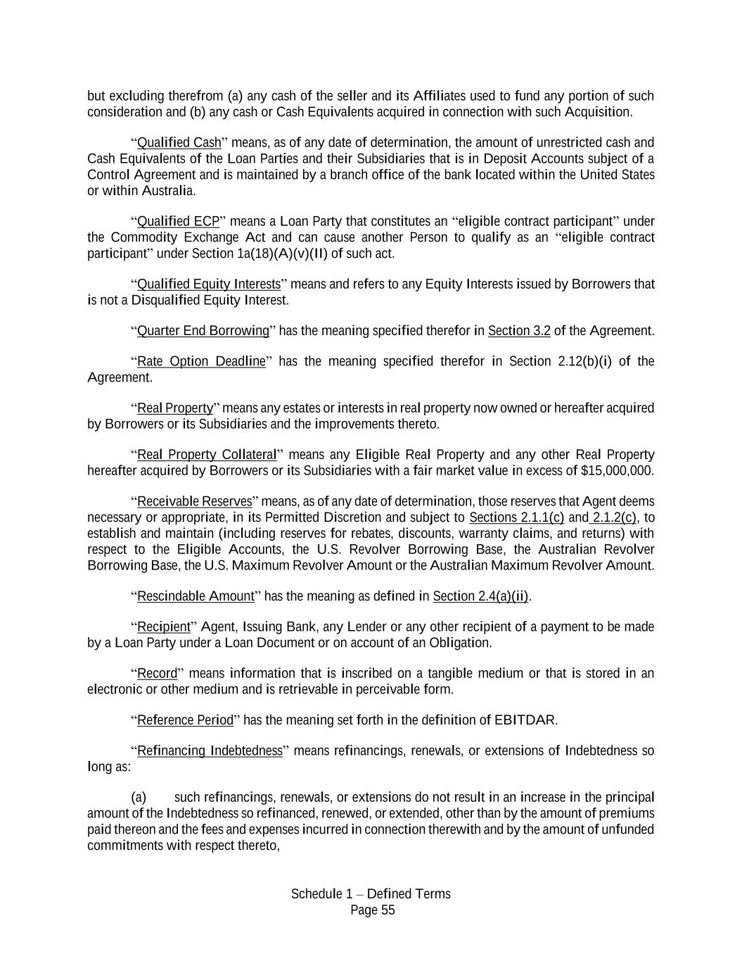 Schedule 1 – Defined Terms Page 55 but excluding therefrom (a) any cash of the seller and its Affiliates used to fund any portion of such consideration and (b) any cash or Cash Equivalents acquired in connection with such Acquisition. “Qualified Cash” means, as of any date of determination, the amount of unrestricted cash and Cash Equivalents of the Loan Parties and their Subsidiaries that is in Deposit Accounts subject of a Control Agreement and is maintained by a branch office of the bank located within the United States or within Australia. “Qualified ECP” means a Loan Party that constitutes an “eligible contract participant” under the Commodity Exchange Act and can cause another Person to qualify as an “eligible contract participant” under Section 1a(18)(A)(v)(II) of such act. “Qualified Equity Interests” means and refers to any Equity Interests issued by Borrowers that is not a Disqualified Equity Interest. “Quarter End Borrowing” has the meaning specified therefor in Section 3.2 of the Agreement. “Rate Option Deadline” has the meaning specified therefor in Section 2.12(b)(i) of the Agreement. “Real Property” means any estates or interests in real property now owned or hereafter acquired by Borrowers or its Subsidiaries and the improvements thereto. “Real Property Collateral” means any Eligible Real Property and any other Real Property hereafter acquired by Borrowers or its Subsidiaries with a fair market value in excess of $15,000,000. “Receivable Reserves” means, as of any date of determination, those reserves that Agent deems necessary or appropriate, in its Permitted Discretion and subject to Sections 2.1.1(c) and 2.1.2(c), to establish and maintain (including reserves for rebates, discounts, warranty claims, and returns) with respect to the Eligible Accounts, the U.S. Revolver Borrowing Base, the Australian Revolver Borrowing Base, the U.S. Maximum Revolver Amount or the Australian Maximum Revolver Amount. “Rescindable Amount” has the meaning as defined in Section 2.4(a)(ii). “Recipient” Agent, Issuing Bank, any Lender or any other recipient of a payment to be made by a Loan Party under a Loan Document or on account of an Obligation. “Record” means information that is inscribed on a tangible medium or that is stored in an electronic or other medium and is retrievable in perceivable form. “Reference Period” has the meaning set forth in the definition of EBITDAR. “Refinancing Indebtedness” means refinancings, renewals, or extensions of Indebtedness so long as: (a) such refinancings, renewals, or extensions do not result in an increase in the principal amount of the Indebtedness so refinanced, renewed, or extended, other than by the amount of premiums paid thereon and the fees and expenses incurred in connection therewith and by the amount of unfunded commitments with respect thereto,