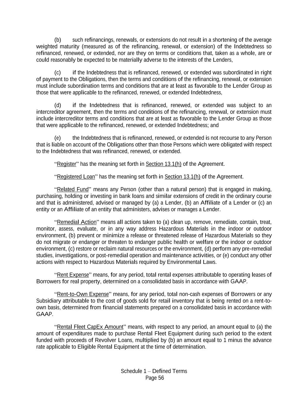 Schedule 1 – Defined Terms Page 56 (b) such refinancings, renewals, or extensions do not result in a shortening of the average weighted maturity (measured as of the refinancing, renewal, or extension) of the Indebtedness so refinanced, renewed, or extended, nor are they on terms or conditions that, taken as a whole, are or could reasonably be expected to be materially adverse to the interests of the Lenders, (c) if the Indebtedness that is refinanced, renewed, or extended was subordinated in right of payment to the Obligations, then the terms and conditions of the refinancing, renewal, or extension must include subordination terms and conditions that are at least as favorable to the Lender Group as those that were applicable to the refinanced, renewed, or extended Indebtedness, (d) if the Indebtedness that is refinanced, renewed, or extended was subject to an intercreditor agreement, then the terms and conditions of the refinancing, renewal, or extension must include intercreditor terms and conditions that are at least as favorable to the Lender Group as those that were applicable to the refinanced, renewed, or extended Indebtedness; and (e) the Indebtedness that is refinanced, renewed, or extended is not recourse to any Person that is liable on account of the Obligations other than those Persons which were obligated with respect to the Indebtedness that was refinanced, renewed, or extended. “Register” has the meaning set forth in Section 13.1(h) of the Agreement. “Registered Loan” has the meaning set forth in Section 13.1(h) of the Agreement. “Related Fund” means any Person (other than a natural person) that is engaged in making, purchasing, holding or investing in bank loans and similar extensions of credit in the ordinary course and that is administered, advised or managed by (a) a Lender, (b) an Affiliate of a Lender or (c) an entity or an Affiliate of an entity that administers, advises or manages a Lender. “Remedial Action” means all actions taken to (a) clean up, remove, remediate, contain, treat, monitor, assess, evaluate, or in any way address Hazardous Materials in the indoor or outdoor environment, (b) prevent or minimize a release or threatened release of Hazardous Materials so they do not migrate or endanger or threaten to endanger public health or welfare or the indoor or outdoor environment, (c) restore or reclaim natural resources or the environment, (d) perform any pre-remedial studies, investigations, or post-remedial operation and maintenance activities, or (e) conduct any other actions with respect to Hazardous Materials required by Environmental Laws. “Rent Expense” means, for any period, total rental expenses attributable to operating leases of Borrowers for real property, determined on a consolidated basis in accordance with GAAP. “Rent-to-Own Expense” means, for any period, total non-cash expenses of Borrowers or any Subsidiary attributable to the cost of goods sold for retail inventory that is being rented on a rent-to- own basis, determined from financial statements prepared on a consolidated basis in accordance with GAAP. “Rental Fleet CapEx Amount” means, with respect to any period, an amount equal to (a) the amount of expenditures made to purchase Rental Fleet Equipment during such period to the extent funded with proceeds of Revolver Loans, multiplied by (b) an amount equal to 1 minus the advance rate applicable to Eligible Rental Equipment at the time of determination.