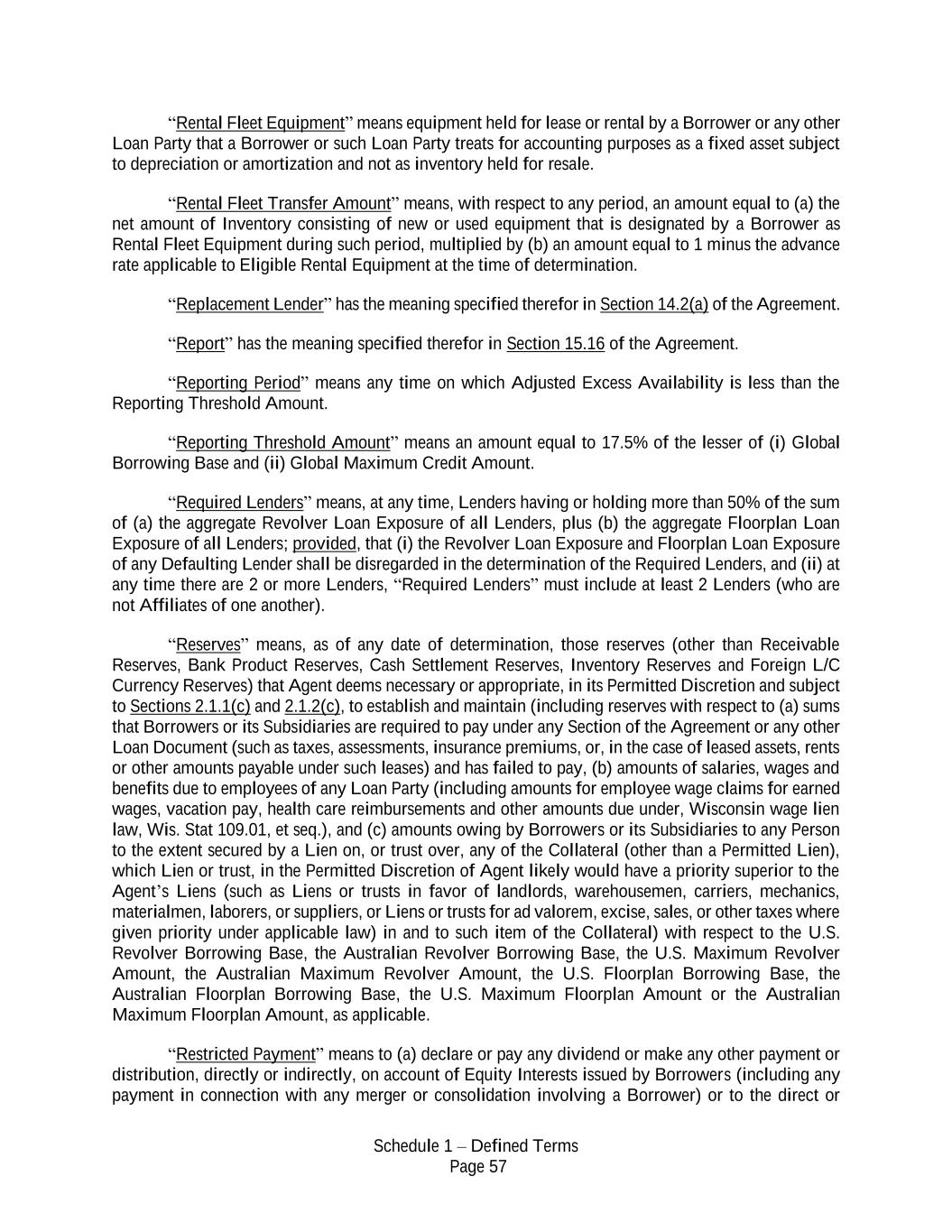 Schedule 1 – Defined Terms Page 57 “Rental Fleet Equipment” means equipment held for lease or rental by a Borrower or any other Loan Party that a Borrower or such Loan Party treats for accounting purposes as a fixed asset subject to depreciation or amortization and not as inventory held for resale. “Rental Fleet Transfer Amount” means, with respect to any period, an amount equal to (a) the net amount of Inventory consisting of new or used equipment that is designated by a Borrower as Rental Fleet Equipment during such period, multiplied by (b) an amount equal to 1 minus the advance rate applicable to Eligible Rental Equipment at the time of determination. “Replacement Lender” has the meaning specified therefor in Section 14.2(a) of the Agreement. “Report” has the meaning specified therefor in Section 15.16 of the Agreement. “Reporting Period” means any time on which Adjusted Excess Availability is less than the Reporting Threshold Amount. “Reporting Threshold Amount” means an amount equal to 17.5% of the lesser of (i) Global Borrowing Base and (ii) Global Maximum Credit Amount. “Required Lenders” means, at any time, Lenders having or holding more than 50% of the sum of (a) the aggregate Revolver Loan Exposure of all Lenders, plus (b) the aggregate Floorplan Loan Exposure of all Lenders; provided, that (i) the Revolver Loan Exposure and Floorplan Loan Exposure of any Defaulting Lender shall be disregarded in the determination of the Required Lenders, and (ii) at any time there are 2 or more Lenders, “Required Lenders” must include at least 2 Lenders (who are not Affiliates of one another). “Reserves” means, as of any date of determination, those reserves (other than Receivable Reserves, Bank Product Reserves, Cash Settlement Reserves, Inventory Reserves and Foreign L/C Currency Reserves) that Agent deems necessary or appropriate, in its Permitted Discretion and subject to Sections 2.1.1(c) and 2.1.2(c), to establish and maintain (including reserves with respect to (a) sums that Borrowers or its Subsidiaries are required to pay under any Section of the Agreement or any other Loan Document (such as taxes, assessments, insurance premiums, or, in the case of leased assets, rents or other amounts payable under such leases) and has failed to pay, (b) amounts of salaries, wages and benefits due to employees of any Loan Party (including amounts for employee wage claims for earned wages, vacation pay, health care reimbursements and other amounts due under, Wisconsin wage lien law, Wis. Stat 109.01, et seq.), and (c) amounts owing by Borrowers or its Subsidiaries to any Person to the extent secured by a Lien on, or trust over, any of the Collateral (other than a Permitted Lien), which Lien or trust, in the Permitted Discretion of Agent likely would have a priority superior to the Agent’s Liens (such as Liens or trusts in favor of landlords, warehousemen, carriers, mechanics, materialmen, laborers, or suppliers, or Liens or trusts for ad valorem, excise, sales, or other taxes where given priority under applicable law) in and to such item of the Collateral) with respect to the U.S. Revolver Borrowing Base, the Australian Revolver Borrowing Base, the U.S. Maximum Revolver Amount, the Australian Maximum Revolver Amount, the U.S. Floorplan Borrowing Base, the Australian Floorplan Borrowing Base, the U.S. Maximum Floorplan Amount or the Australian Maximum Floorplan Amount, as applicable. “Restricted Payment” means to (a) declare or pay any dividend or make any other payment or distribution, directly or indirectly, on account of Equity Interests issued by Borrowers (including any payment in connection with any merger or consolidation involving a Borrower) or to the direct or