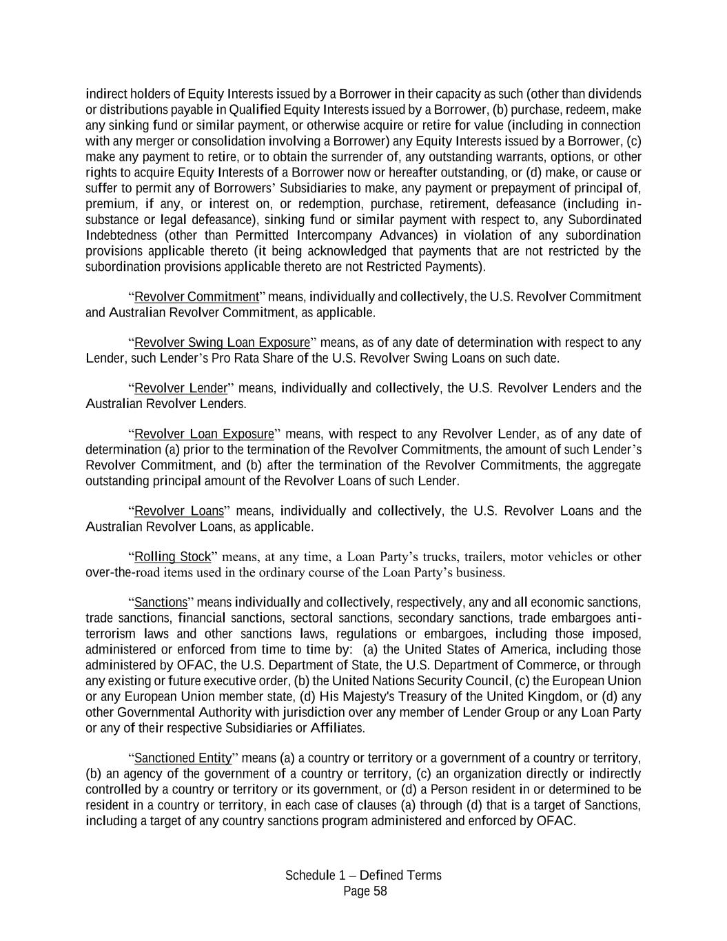 Schedule 1 – Defined Terms Page 58 indirect holders of Equity Interests issued by a Borrower in their capacity as such (other than dividends or distributions payable in Qualified Equity Interests issued by a Borrower, (b) purchase, redeem, make any sinking fund or similar payment, or otherwise acquire or retire for value (including in connection with any merger or consolidation involving a Borrower) any Equity Interests issued by a Borrower, (c) make any payment to retire, or to obtain the surrender of, any outstanding warrants, options, or other rights to acquire Equity Interests of a Borrower now or hereafter outstanding, or (d) make, or cause or suffer to permit any of Borrowers’ Subsidiaries to make, any payment or prepayment of principal of, premium, if any, or interest on, or redemption, purchase, retirement, defeasance (including in- substance or legal defeasance), sinking fund or similar payment with respect to, any Subordinated Indebtedness (other than Permitted Intercompany Advances) in violation of any subordination provisions applicable thereto (it being acknowledged that payments that are not restricted by the subordination provisions applicable thereto are not Restricted Payments). “Revolver Commitment” means, individually and collectively, the U.S. Revolver Commitment and Australian Revolver Commitment, as applicable. “Revolver Swing Loan Exposure” means, as of any date of determination with respect to any Lender, such Lender’s Pro Rata Share of the U.S. Revolver Swing Loans on such date. “Revolver Lender” means, individually and collectively, the U.S. Revolver Lenders and the Australian Revolver Lenders. “Revolver Loan Exposure” means, with respect to any Revolver Lender, as of any date of determination (a) prior to the termination of the Revolver Commitments, the amount of such Lender’s Revolver Commitment, and (b) after the termination of the Revolver Commitments, the aggregate outstanding principal amount of the Revolver Loans of such Lender. “Revolver Loans” means, individually and collectively, the U.S. Revolver Loans and the Australian Revolver Loans, as applicable. “Rolling Stock” means, at any time, a Loan Party’s trucks, trailers, motor vehicles or other over-the-road items used in the ordinary course of the Loan Party’s business. “Sanctions” means individually and collectively, respectively, any and all economic sanctions, trade sanctions, financial sanctions, sectoral sanctions, secondary sanctions, trade embargoes anti- terrorism laws and other sanctions laws, regulations or embargoes, including those imposed, administered or enforced from time to time by: (a) the United States of America, including those administered by OFAC, the U.S. Department of State, the U.S. Department of Commerce, or through any existing or future executive order, (b) the United Nations Security Council, (c) the European Union or any European Union member state, (d) His Majesty's Treasury of the United Kingdom, or (d) any other Governmental Authority with jurisdiction over any member of Lender Group or any Loan Party or any of their respective Subsidiaries or Affiliates. “Sanctioned Entity” means (a) a country or territory or a government of a country or territory, (b) an agency of the government of a country or territory, (c) an organization directly or indirectly controlled by a country or territory or its government, or (d) a Person resident in or determined to be resident in a country or territory, in each case of clauses (a) through (d) that is a target of Sanctions, including a target of any country sanctions program administered and enforced by OFAC.