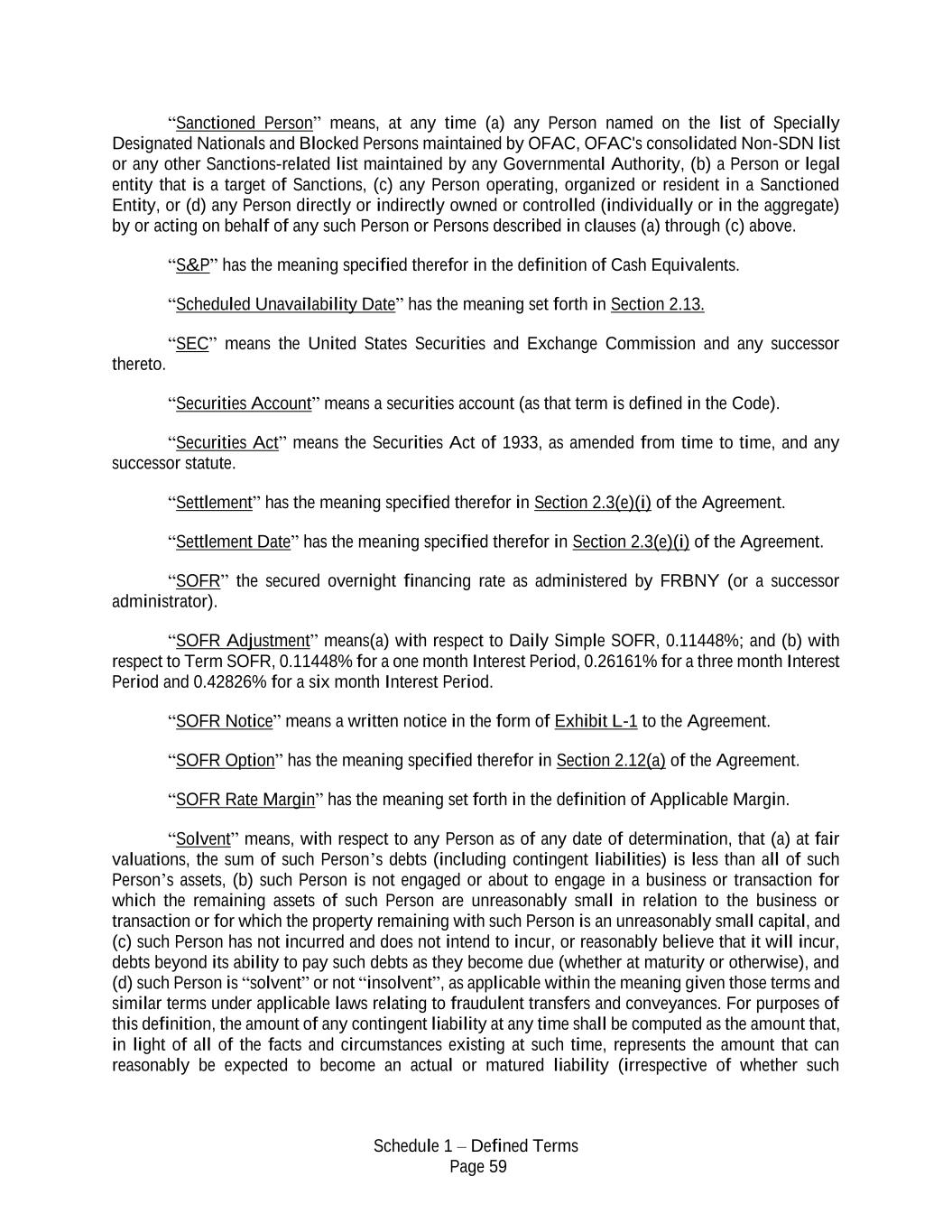 Schedule 1 – Defined Terms Page 59 “Sanctioned Person” means, at any time (a) any Person named on the list of Specially Designated Nationals and Blocked Persons maintained by OFAC, OFAC's consolidated Non-SDN list or any other Sanctions-related list maintained by any Governmental Authority, (b) a Person or legal entity that is a target of Sanctions, (c) any Person operating, organized or resident in a Sanctioned Entity, or (d) any Person directly or indirectly owned or controlled (individually or in the aggregate) by or acting on behalf of any such Person or Persons described in clauses (a) through (c) above. “S&P” has the meaning specified therefor in the definition of Cash Equivalents. “Scheduled Unavailability Date” has the meaning set forth in Section 2.13. “SEC” means the United States Securities and Exchange Commission and any successor thereto. “Securities Account” means a securities account (as that term is defined in the Code). “Securities Act” means the Securities Act of 1933, as amended from time to time, and any successor statute. “Settlement” has the meaning specified therefor in Section 2.3(e)(i) of the Agreement. “Settlement Date” has the meaning specified therefor in Section 2.3(e)(i) of the Agreement. “SOFR” the secured overnight financing rate as administered by FRBNY (or a successor administrator). “SOFR Adjustment” means(a) with respect to Daily Simple SOFR, 0.11448%; and (b) with respect to Term SOFR, 0.11448% for a one month Interest Period, 0.26161% for a three month Interest Period and 0.42826% for a six month Interest Period. “SOFR Notice” means a written notice in the form of Exhibit L-1 to the Agreement. “SOFR Option” has the meaning specified therefor in Section 2.12(a) of the Agreement. “SOFR Rate Margin” has the meaning set forth in the definition of Applicable Margin. “Solvent” means, with respect to any Person as of any date of determination, that (a) at fair valuations, the sum of such Person’s debts (including contingent liabilities) is less than all of such Person’s assets, (b) such Person is not engaged or about to engage in a business or transaction for which the remaining assets of such Person are unreasonably small in relation to the business or transaction or for which the property remaining with such Person is an unreasonably small capital, and (c) such Person has not incurred and does not intend to incur, or reasonably believe that it will incur, debts beyond its ability to pay such debts as they become due (whether at maturity or otherwise), and (d) such Person is “solvent” or not “insolvent”, as applicable within the meaning given those terms and similar terms under applicable laws relating to fraudulent transfers and conveyances. For purposes of this definition, the amount of any contingent liability at any time shall be computed as the amount that, in light of all of the facts and circumstances existing at such time, represents the amount that can reasonably be expected to become an actual or matured liability (irrespective of whether such