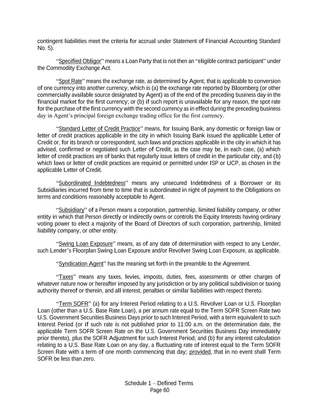 Schedule 1 – Defined Terms Page 60 contingent liabilities meet the criteria for accrual under Statement of Financial Accounting Standard No. 5). “Specified Obligor” means a Loan Party that is not then an “eligible contract participant” under the Commodity Exchange Act. “Spot Rate” means the exchange rate, as determined by Agent, that is applicable to conversion of one currency into another currency, which is (a) the exchange rate reported by Bloomberg (or other commercially available source designated by Agent) as of the end of the preceding business day in the financial market for the first currency; or (b) if such report is unavailable for any reason, the spot rate for the purchase of the first currency with the second currency as in effect during the preceding business day in Agent’s principal foreign exchange trading office for the first currency. “Standard Letter of Credit Practice” means, for Issuing Bank, any domestic or foreign law or letter of credit practices applicable in the city in which Issuing Bank issued the applicable Letter of Credit or, for its branch or correspondent, such laws and practices applicable in the city in which it has advised, confirmed or negotiated such Letter of Credit, as the case may be, in each case, (a) which letter of credit practices are of banks that regularly issue letters of credit in the particular city, and (b) which laws or letter of credit practices are required or permitted under ISP or UCP, as chosen in the applicable Letter of Credit. “Subordinated Indebtedness” means any unsecured Indebtedness of a Borrower or its Subsidiaries incurred from time to time that is subordinated in right of payment to the Obligations on terms and conditions reasonably acceptable to Agent. “Subsidiary” of a Person means a corporation, partnership, limited liability company, or other entity in which that Person directly or indirectly owns or controls the Equity Interests having ordinary voting power to elect a majority of the Board of Directors of such corporation, partnership, limited liability company, or other entity. “Swing Loan Exposure” means, as of any date of determination with respect to any Lender, such Lender’s Floorplan Swing Loan Exposure and/or Revolver Swing Loan Exposure, as applicable. “Syndication Agent” has the meaning set forth in the preamble to the Agreement. “Taxes” means any taxes, levies, imposts, duties, fees, assessments or other charges of whatever nature now or hereafter imposed by any jurisdiction or by any political subdivision or taxing authority thereof or therein, and all interest, penalties or similar liabilities with respect thereto. “Term SOFR” (a) for any Interest Period relating to a U.S. Revolver Loan or U.S. Floorplan Loan (other than a U.S. Base Rate Loan), a per annum rate equal to the Term SOFR Screen Rate two U.S. Government Securities Business Days prior to such Interest Period, with a term equivalent to such Interest Period (or if such rate is not published prior to 11:00 a.m. on the determination date, the applicable Term SOFR Screen Rate on the U.S. Government Securities Business Day immediately prior thereto), plus the SOFR Adjustment for such Interest Period; and (b) for any interest calculation relating to a U.S. Base Rate Loan on any day, a fluctuating rate of interest equal to the Term SOFR Screen Rate with a term of one month commencing that day; provided, that in no event shall Term SOFR be less than zero.