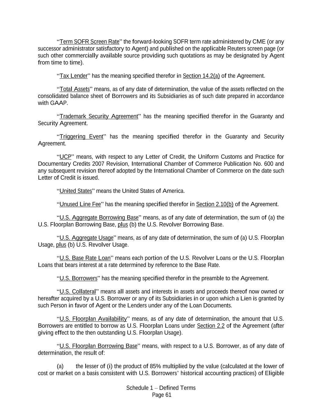 Schedule 1 – Defined Terms Page 61 “Term SOFR Screen Rate” the forward-looking SOFR term rate administered by CME (or any successor administrator satisfactory to Agent) and published on the applicable Reuters screen page (or such other commercially available source providing such quotations as may be designated by Agent from time to time). “Tax Lender” has the meaning specified therefor in Section 14.2(a) of the Agreement. “Total Assets” means, as of any date of determination, the value of the assets reflected on the consolidated balance sheet of Borrowers and its Subsidiaries as of such date prepared in accordance with GAAP. “Trademark Security Agreement” has the meaning specified therefor in the Guaranty and Security Agreement. “Triggering Event” has the meaning specified therefor in the Guaranty and Security Agreement. “UCP” means, with respect to any Letter of Credit, the Uniform Customs and Practice for Documentary Credits 2007 Revision, International Chamber of Commerce Publication No. 600 and any subsequent revision thereof adopted by the International Chamber of Commerce on the date such Letter of Credit is issued. “United States” means the United States of America. “Unused Line Fee” has the meaning specified therefor in Section 2.10(b) of the Agreement. “U.S. Aggregate Borrowing Base” means, as of any date of determination, the sum of (a) the U.S. Floorplan Borrowing Base, plus (b) the U.S. Revolver Borrowing Base. “U.S. Aggregate Usage” means, as of any date of determination, the sum of (a) U.S. Floorplan Usage, plus (b) U.S. Revolver Usage. “U.S. Base Rate Loan” means each portion of the U.S. Revolver Loans or the U.S. Floorplan Loans that bears interest at a rate determined by reference to the Base Rate. “U.S. Borrowers” has the meaning specified therefor in the preamble to the Agreement. “U.S. Collateral” means all assets and interests in assets and proceeds thereof now owned or hereafter acquired by a U.S. Borrower or any of its Subsidiaries in or upon which a Lien is granted by such Person in favor of Agent or the Lenders under any of the Loan Documents. “U.S. Floorplan Availability” means, as of any date of determination, the amount that U.S. Borrowers are entitled to borrow as U.S. Floorplan Loans under Section 2.2 of the Agreement (after giving effect to the then outstanding U.S. Floorplan Usage). “U.S. Floorplan Borrowing Base” means, with respect to a U.S. Borrower, as of any date of determination, the result of: (a) the lesser of (i) the product of 85% multiplied by the value (calculated at the lower of cost or market on a basis consistent with U.S. Borrowers’ historical accounting practices) of Eligible