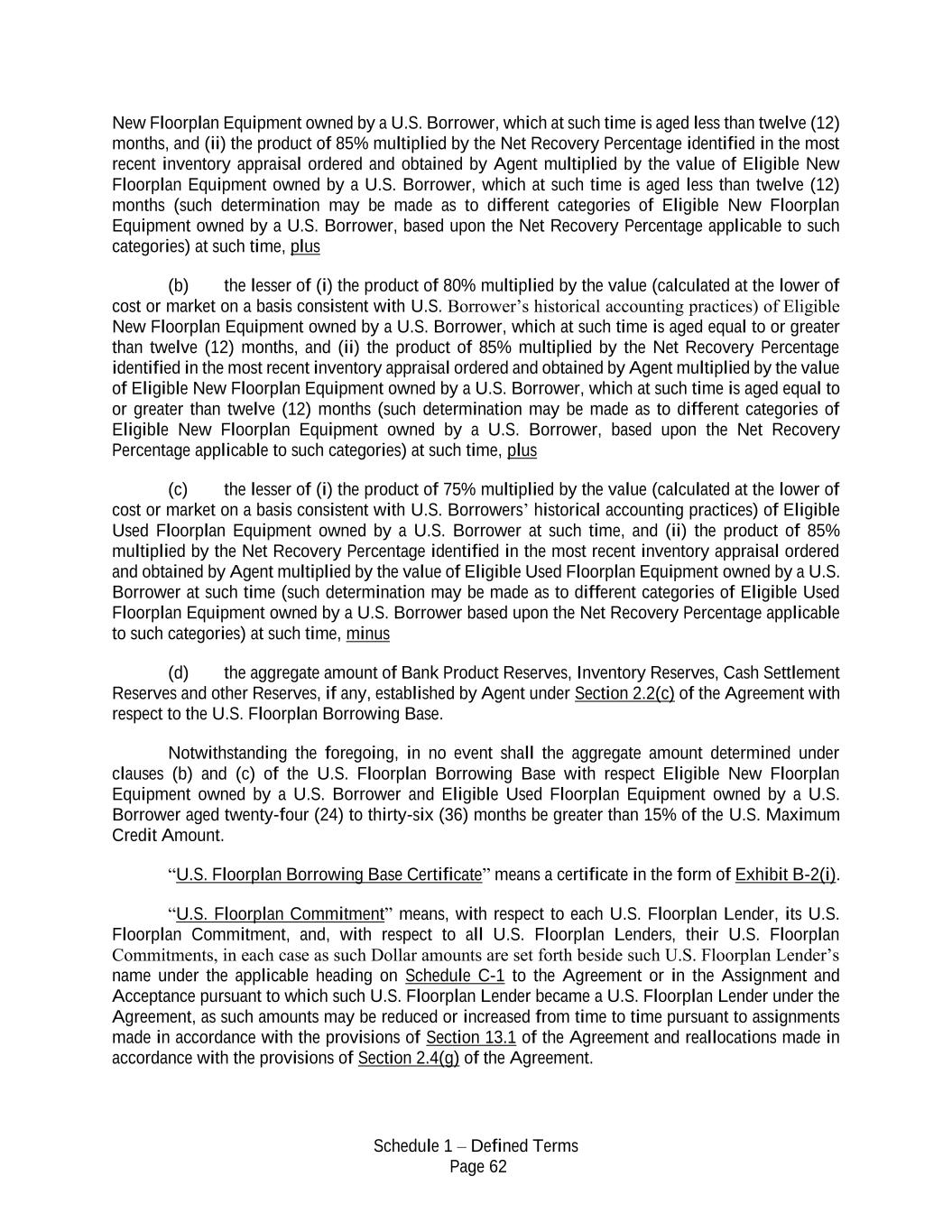 Schedule 1 – Defined Terms Page 62 New Floorplan Equipment owned by a U.S. Borrower, which at such time is aged less than twelve (12) months, and (ii) the product of 85% multiplied by the Net Recovery Percentage identified in the most recent inventory appraisal ordered and obtained by Agent multiplied by the value of Eligible New Floorplan Equipment owned by a U.S. Borrower, which at such time is aged less than twelve (12) months (such determination may be made as to different categories of Eligible New Floorplan Equipment owned by a U.S. Borrower, based upon the Net Recovery Percentage applicable to such categories) at such time, plus (b) the lesser of (i) the product of 80% multiplied by the value (calculated at the lower of cost or market on a basis consistent with U.S. Borrower’s historical accounting practices) of Eligible New Floorplan Equipment owned by a U.S. Borrower, which at such time is aged equal to or greater than twelve (12) months, and (ii) the product of 85% multiplied by the Net Recovery Percentage identified in the most recent inventory appraisal ordered and obtained by Agent multiplied by the value of Eligible New Floorplan Equipment owned by a U.S. Borrower, which at such time is aged equal to or greater than twelve (12) months (such determination may be made as to different categories of Eligible New Floorplan Equipment owned by a U.S. Borrower, based upon the Net Recovery Percentage applicable to such categories) at such time, plus (c) the lesser of (i) the product of 75% multiplied by the value (calculated at the lower of cost or market on a basis consistent with U.S. Borrowers’ historical accounting practices) of Eligible Used Floorplan Equipment owned by a U.S. Borrower at such time, and (ii) the product of 85% multiplied by the Net Recovery Percentage identified in the most recent inventory appraisal ordered and obtained by Agent multiplied by the value of Eligible Used Floorplan Equipment owned by a U.S. Borrower at such time (such determination may be made as to different categories of Eligible Used Floorplan Equipment owned by a U.S. Borrower based upon the Net Recovery Percentage applicable to such categories) at such time, minus (d) the aggregate amount of Bank Product Reserves, Inventory Reserves, Cash Settlement Reserves and other Reserves, if any, established by Agent under Section 2.2(c) of the Agreement with respect to the U.S. Floorplan Borrowing Base. Notwithstanding the foregoing, in no event shall the aggregate amount determined under clauses (b) and (c) of the U.S. Floorplan Borrowing Base with respect Eligible New Floorplan Equipment owned by a U.S. Borrower and Eligible Used Floorplan Equipment owned by a U.S. Borrower aged twenty-four (24) to thirty-six (36) months be greater than 15% of the U.S. Maximum Credit Amount. “U.S. Floorplan Borrowing Base Certificate” means a certificate in the form of Exhibit B-2(i). “U.S. Floorplan Commitment” means, with respect to each U.S. Floorplan Lender, its U.S. Floorplan Commitment, and, with respect to all U.S. Floorplan Lenders, their U.S. Floorplan Commitments, in each case as such Dollar amounts are set forth beside such U.S. Floorplan Lender’s name under the applicable heading on Schedule C-1 to the Agreement or in the Assignment and Acceptance pursuant to which such U.S. Floorplan Lender became a U.S. Floorplan Lender under the Agreement, as such amounts may be reduced or increased from time to time pursuant to assignments made in accordance with the provisions of Section 13.1 of the Agreement and reallocations made in accordance with the provisions of Section 2.4(g) of the Agreement.