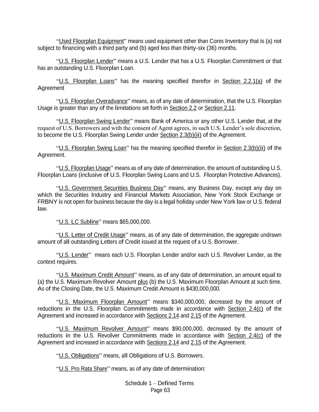 Schedule 1 – Defined Terms Page 63 “Used Floorplan Equipment” means used equipment other than Cores Inventory that is (a) not subject to financing with a third party and (b) aged less than thirty-six (36) months. “U.S. Floorplan Lender” means a U.S. Lender that has a U.S. Floorplan Commitment or that has an outstanding U.S. Floorplan Loan. “U.S. Floorplan Loans” has the meaning specified therefor in Section 2.2.1(a) of the Agreement “U.S. Floorplan Overadvance” means, as of any date of determination, that the U.S. Floorplan Usage is greater than any of the limitations set forth in Section 2.2 or Section 2.11. “U.S. Floorplan Swing Lender” means Bank of America or any other U.S. Lender that, at the request of U.S. Borrowers and with the consent of Agent agrees, in such U.S. Lender’s sole discretion, to become the U.S. Floorplan Swing Lender under Section 2.3(b)(ii) of the Agreement. “U.S. Floorplan Swing Loan” has the meaning specified therefor in Section 2.3(b)(ii) of the Agreement. “U.S. Floorplan Usage” means as of any date of determination, the amount of outstanding U.S. Floorplan Loans (inclusive of U.S. Floorplan Swing Loans and U.S. Floorplan Protective Advances). “U.S. Government Securities Business Day” means, any Business Day, except any day on which the Securities Industry and Financial Markets Association, New York Stock Exchange or FRBNY is not open for business because the day is a legal holiday under New York law or U.S. federal law. “U.S. LC Subline” means $65,000,000. “U.S. Letter of Credit Usage” means, as of any date of determination, the aggregate undrawn amount of all outstanding Letters of Credit issued at the request of a U.S. Borrower. “U.S. Lender” means each U.S. Floorplan Lender and/or each U.S. Revolver Lender, as the context requires. “U.S. Maximum Credit Amount” means, as of any date of determination, an amount equal to (a) the U.S. Maximum Revolver Amount plus (b) the U.S. Maximum Floorplan Amount at such time. As of the Closing Date, the U.S. Maximum Credit Amount is $430,000,000. “U.S. Maximum Floorplan Amount” means $340,000,000, decreased by the amount of reductions in the U.S. Floorplan Commitments made in accordance with Section 2.4(c) of the Agreement and increased in accordance with Sections 2.14 and 2.15 of the Agreement. “U.S. Maximum Revolver Amount” means $90,000,000, decreased by the amount of reductions in the U.S. Revolver Commitments made in accordance with Section 2.4(c) of the Agreement and increased in accordance with Sections 2.14 and 2.15 of the Agreement. “U.S. Obligations” means, all Obligations of U.S. Borrowers. “U.S. Pro Rata Share” means, as of any date of determination: