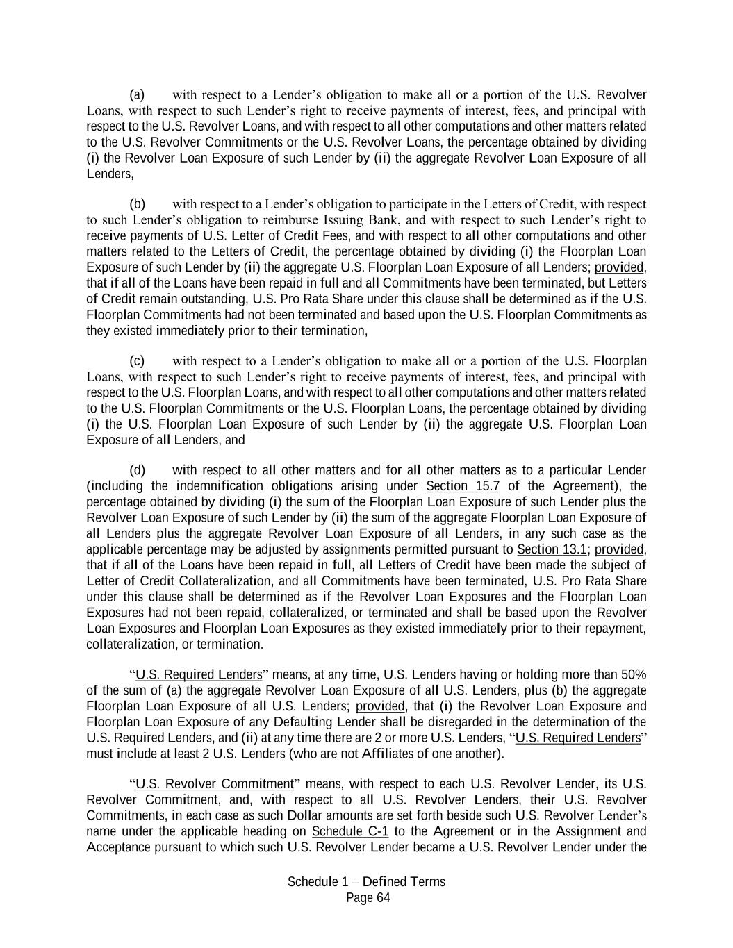 Schedule 1 – Defined Terms Page 64 (a) with respect to a Lender’s obligation to make all or a portion of the U.S. Revolver Loans, with respect to such Lender’s right to receive payments of interest, fees, and principal with respect to the U.S. Revolver Loans, and with respect to all other computations and other matters related to the U.S. Revolver Commitments or the U.S. Revolver Loans, the percentage obtained by dividing (i) the Revolver Loan Exposure of such Lender by (ii) the aggregate Revolver Loan Exposure of all Lenders, (b) with respect to a Lender’s obligation to participate in the Letters of Credit, with respect to such Lender’s obligation to reimburse Issuing Bank, and with respect to such Lender’s right to receive payments of U.S. Letter of Credit Fees, and with respect to all other computations and other matters related to the Letters of Credit, the percentage obtained by dividing (i) the Floorplan Loan Exposure of such Lender by (ii) the aggregate U.S. Floorplan Loan Exposure of all Lenders; provided, that if all of the Loans have been repaid in full and all Commitments have been terminated, but Letters of Credit remain outstanding, U.S. Pro Rata Share under this clause shall be determined as if the U.S. Floorplan Commitments had not been terminated and based upon the U.S. Floorplan Commitments as they existed immediately prior to their termination, (c) with respect to a Lender’s obligation to make all or a portion of the U.S. Floorplan Loans, with respect to such Lender’s right to receive payments of interest, fees, and principal with respect to the U.S. Floorplan Loans, and with respect to all other computations and other matters related to the U.S. Floorplan Commitments or the U.S. Floorplan Loans, the percentage obtained by dividing (i) the U.S. Floorplan Loan Exposure of such Lender by (ii) the aggregate U.S. Floorplan Loan Exposure of all Lenders, and (d) with respect to all other matters and for all other matters as to a particular Lender (including the indemnification obligations arising under Section 15.7 of the Agreement), the percentage obtained by dividing (i) the sum of the Floorplan Loan Exposure of such Lender plus the Revolver Loan Exposure of such Lender by (ii) the sum of the aggregate Floorplan Loan Exposure of all Lenders plus the aggregate Revolver Loan Exposure of all Lenders, in any such case as the applicable percentage may be adjusted by assignments permitted pursuant to Section 13.1; provided, that if all of the Loans have been repaid in full, all Letters of Credit have been made the subject of Letter of Credit Collateralization, and all Commitments have been terminated, U.S. Pro Rata Share under this clause shall be determined as if the Revolver Loan Exposures and the Floorplan Loan Exposures had not been repaid, collateralized, or terminated and shall be based upon the Revolver Loan Exposures and Floorplan Loan Exposures as they existed immediately prior to their repayment, collateralization, or termination. “U.S. Required Lenders” means, at any time, U.S. Lenders having or holding more than 50% of the sum of (a) the aggregate Revolver Loan Exposure of all U.S. Lenders, plus (b) the aggregate Floorplan Loan Exposure of all U.S. Lenders; provided, that (i) the Revolver Loan Exposure and Floorplan Loan Exposure of any Defaulting Lender shall be disregarded in the determination of the U.S. Required Lenders, and (ii) at any time there are 2 or more U.S. Lenders, “U.S. Required Lenders” must include at least 2 U.S. Lenders (who are not Affiliates of one another). “U.S. Revolver Commitment” means, with respect to each U.S. Revolver Lender, its U.S. Revolver Commitment, and, with respect to all U.S. Revolver Lenders, their U.S. Revolver Commitments, in each case as such Dollar amounts are set forth beside such U.S. Revolver Lender’s name under the applicable heading on Schedule C-1 to the Agreement or in the Assignment and Acceptance pursuant to which such U.S. Revolver Lender became a U.S. Revolver Lender under the