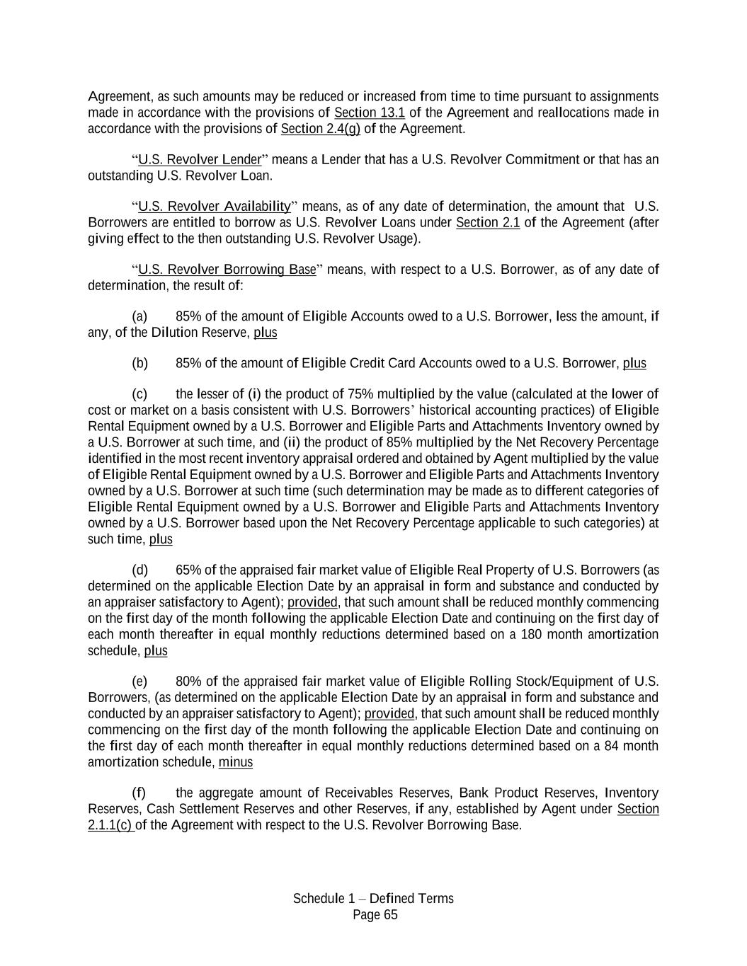 Schedule 1 – Defined Terms Page 65 Agreement, as such amounts may be reduced or increased from time to time pursuant to assignments made in accordance with the provisions of Section 13.1 of the Agreement and reallocations made in accordance with the provisions of Section 2.4(g) of the Agreement. “U.S. Revolver Lender” means a Lender that has a U.S. Revolver Commitment or that has an outstanding U.S. Revolver Loan. “U.S. Revolver Availability” means, as of any date of determination, the amount that U.S. Borrowers are entitled to borrow as U.S. Revolver Loans under Section 2.1 of the Agreement (after giving effect to the then outstanding U.S. Revolver Usage). “U.S. Revolver Borrowing Base” means, with respect to a U.S. Borrower, as of any date of determination, the result of: (a) 85% of the amount of Eligible Accounts owed to a U.S. Borrower, less the amount, if any, of the Dilution Reserve, plus (b) 85% of the amount of Eligible Credit Card Accounts owed to a U.S. Borrower, plus (c) the lesser of (i) the product of 75% multiplied by the value (calculated at the lower of cost or market on a basis consistent with U.S. Borrowers’ historical accounting practices) of Eligible Rental Equipment owned by a U.S. Borrower and Eligible Parts and Attachments Inventory owned by a U.S. Borrower at such time, and (ii) the product of 85% multiplied by the Net Recovery Percentage identified in the most recent inventory appraisal ordered and obtained by Agent multiplied by the value of Eligible Rental Equipment owned by a U.S. Borrower and Eligible Parts and Attachments Inventory owned by a U.S. Borrower at such time (such determination may be made as to different categories of Eligible Rental Equipment owned by a U.S. Borrower and Eligible Parts and Attachments Inventory owned by a U.S. Borrower based upon the Net Recovery Percentage applicable to such categories) at such time, plus (d) 65% of the appraised fair market value of Eligible Real Property of U.S. Borrowers (as determined on the applicable Election Date by an appraisal in form and substance and conducted by an appraiser satisfactory to Agent); provided, that such amount shall be reduced monthly commencing on the first day of the month following the applicable Election Date and continuing on the first day of each month thereafter in equal monthly reductions determined based on a 180 month amortization schedule, plus (e) 80% of the appraised fair market value of Eligible Rolling Stock/Equipment of U.S. Borrowers, (as determined on the applicable Election Date by an appraisal in form and substance and conducted by an appraiser satisfactory to Agent); provided, that such amount shall be reduced monthly commencing on the first day of the month following the applicable Election Date and continuing on the first day of each month thereafter in equal monthly reductions determined based on a 84 month amortization schedule, minus (f) the aggregate amount of Receivables Reserves, Bank Product Reserves, Inventory Reserves, Cash Settlement Reserves and other Reserves, if any, established by Agent under Section 2.1.1(c) of the Agreement with respect to the U.S. Revolver Borrowing Base.