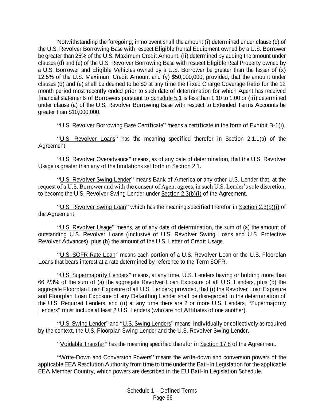 Schedule 1 – Defined Terms Page 66 Notwithstanding the foregoing, in no event shall the amount (i) determined under clause (c) of the U.S. Revolver Borrowing Base with respect Eligible Rental Equipment owned by a U.S. Borrower be greater than 25% of the U.S. Maximum Credit Amount, (ii) determined by adding the amount under clauses (d) and (e) of the U.S. Revolver Borrowing Base with respect Eligible Real Property owned by a U.S. Borrower and Eligible Vehicles owned by a U.S. Borrower be greater than the lesser of (x) 12.5% of the U.S. Maximum Credit Amount and (y) $50,000,000; provided, that the amount under clauses (d) and (e) shall be deemed to be $0 at any time the Fixed Charge Coverage Ratio for the 12 month period most recently ended prior to such date of determination for which Agent has received financial statements of Borrowers pursuant to Schedule 5.1 is less than 1.10 to 1.00 or (iii) determined under clause (a) of the U.S. Revolver Borrowing Base with respect to Extended Terms Accounts be greater than $10,000,000. “U.S. Revolver Borrowing Base Certificate” means a certificate in the form of Exhibit B-1(i). “U.S. Revolver Loans” has the meaning specified therefor in Section 2.1.1(a) of the Agreement. “U.S. Revolver Overadvance” means, as of any date of determination, that the U.S. Revolver Usage is greater than any of the limitations set forth in Section 2.1. “U.S. Revolver Swing Lender” means Bank of America or any other U.S. Lender that, at the request of a U.S. Borrower and with the consent of Agent agrees, in such U.S. Lender’s sole discretion, to become the U.S. Revolver Swing Lender under Section 2.3(b)(i) of the Agreement. “U.S. Revolver Swing Loan” which has the meaning specified therefor in Section 2.3(b)(i) of the Agreement. “U.S. Revolver Usage” means, as of any date of determination, the sum of (a) the amount of outstanding U.S. Revolver Loans (inclusive of U.S. Revolver Swing Loans and U.S. Protective Revolver Advances), plus (b) the amount of the U.S. Letter of Credit Usage. “U.S. SOFR Rate Loan” means each portion of a U.S. Revolver Loan or the U.S. Floorplan Loans that bears interest at a rate determined by reference to the Term SOFR. “U.S. Supermajority Lenders” means, at any time, U.S. Lenders having or holding more than 66 2/3% of the sum of (a) the aggregate Revolver Loan Exposure of all U.S. Lenders, plus (b) the aggregate Floorplan Loan Exposure of all U.S. Lenders; provided, that (i) the Revolver Loan Exposure and Floorplan Loan Exposure of any Defaulting Lender shall be disregarded in the determination of the U.S. Required Lenders, and (ii) at any time there are 2 or more U.S. Lenders, “Supermajority Lenders” must include at least 2 U.S. Lenders (who are not Affiliates of one another). “U.S. Swing Lender” and “U.S. Swing Lenders” means, individually or collectively as required by the context, the U.S. Floorplan Swing Lender and the U.S. Revolver Swing Lender. “Voidable Transfer” has the meaning specified therefor in Section 17.8 of the Agreement. “Write-Down and Conversion Powers” means the write-down and conversion powers of the applicable EEA Resolution Authority from time to time under the Bail-In Legislation for the applicable EEA Member Country, which powers are described in the EU Bail-In Legislation Schedule.