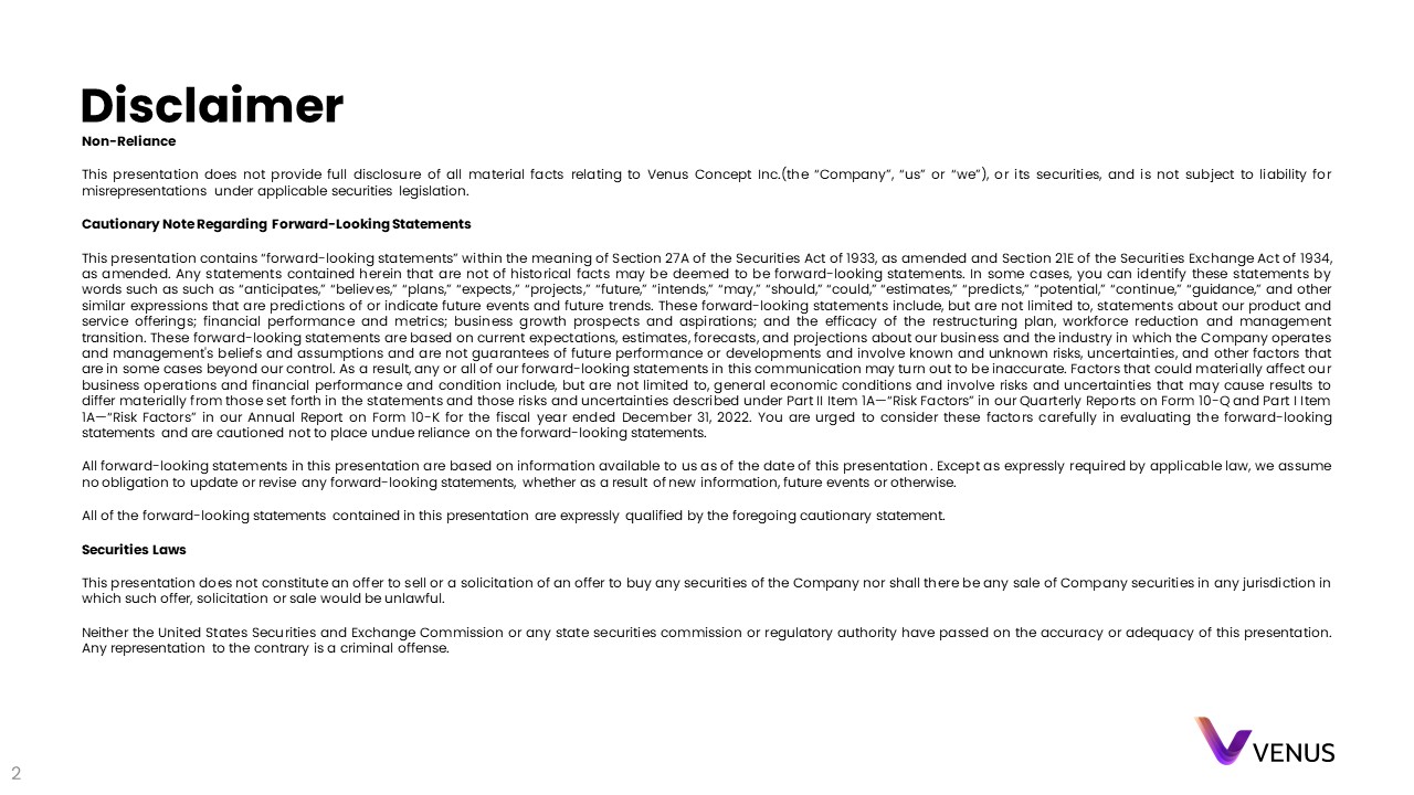 Disclaimer  2  Non-Reliance   This presentation does not provide full disclosure of all material facts relating to Venus Concept Inc.(the “Company”, “us” or “we”), or its securities, and is not subject to liability for misrepresentations under applicable securities legislation.   Cautionary Note Regarding Forward-Looking Statements  This presentation contains “forward-looking statements” within the meaning of Section 27A of the Securities Act of 1933, as amended and Section 21E of the Securities Exchange Act of 1934, as amended. Any statements contained herein that are not of historical facts may be deemed to be forward-looking statements. In some cases, you can identify these statements by words such as such as “anticipates,” “believes,” “plans,” “expects,” “projects,” “future,” “intends,” “may,” “should,” “could,” “estimates,” “predicts,” “potential,” “continue,” “guidance,” and other similar expressions that are predictions of or indicate future events and future trends. These forward-looking statements include, but are not limited to, statements about our product and service offerings; financial performance and metrics; business growth prospects and aspirations; and the efficacy of the restructuring plan, workforce reduction and management transition. These forward-looking statements are based on current expectations, estimates, forecasts, and projections about our business and the industry in which the Company operates and management's beliefs and assumptions and are not guarantees of future performance or developments and involve known and unknown risks, uncertainties, and other factors that are in some cases beyond our control. As a result, any or all of our forward-looking statements in this communication may turn out to be inaccurate. Factors that could materially affect our business operations and financial performance and condition include, but are not limited to, general economic conditions and involve risks and uncertainties that may cause results to differ materially from those set forth in the statements and those risks and uncertainties described under Part II Item 1A—“Risk Factors” in our Quarterly Reports on Form 10-Q and Part I Item 1A—“Risk Factors” in our Annual Report on Form 10-K for the fiscal year ended December 31, 2022. You are urged to consider these factors carefully in evaluating the forward-looking statements and are cautioned not to place undue reliance on the forward-looking statements.   All forward-looking statements in this presentation are based on information available to us as of the date of this presentation . Except as expressly required by applicable law, we assume no obligation to update or revise any forward-looking statements, whether as a result of new information, future events or otherwise.  All of the forward-looking statements contained in this presentation are expressly qualified by the foregoing cautionary statement.  Securities Laws  This presentation does not constitute an offer to sell or a solicitation of an offer to buy any securities of the Company nor shall there be any sale of Company securities in any jurisdiction in which such offer, solicitation or sale would be unlawful.  Neither the United States Securities and Exchange Commission or any state securities commission or regulatory authority have passed on the accuracy or adequacy of this presentation. Any representation to the contrary is a criminal offense.