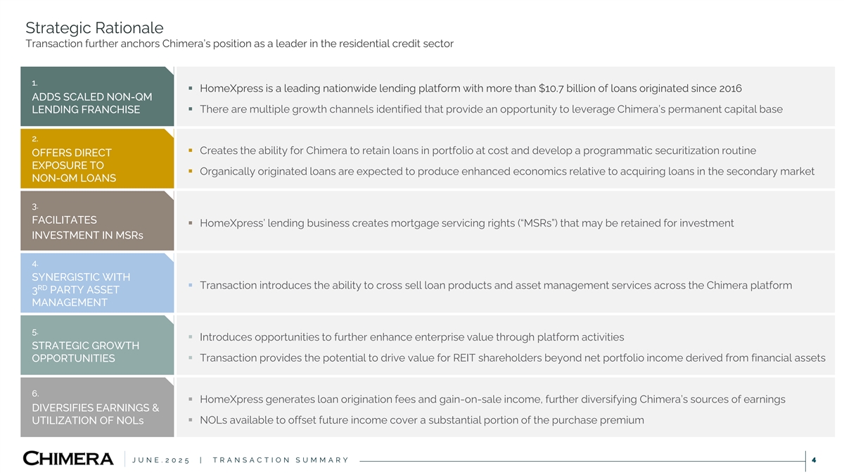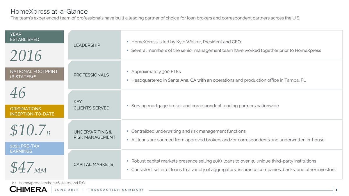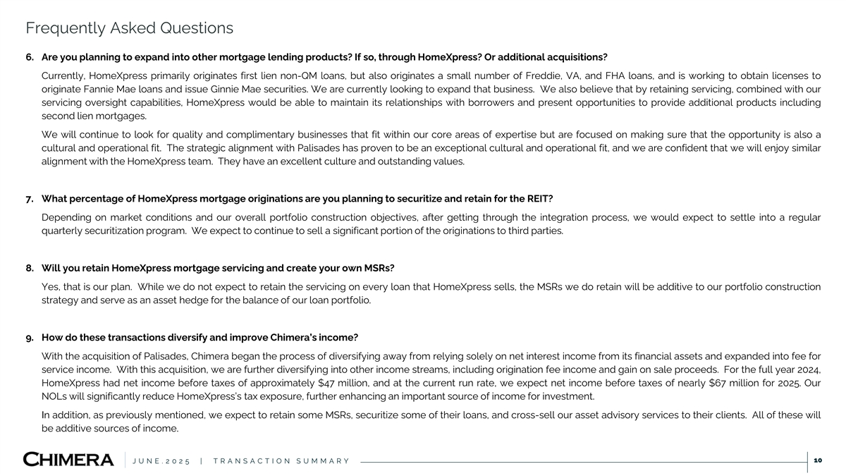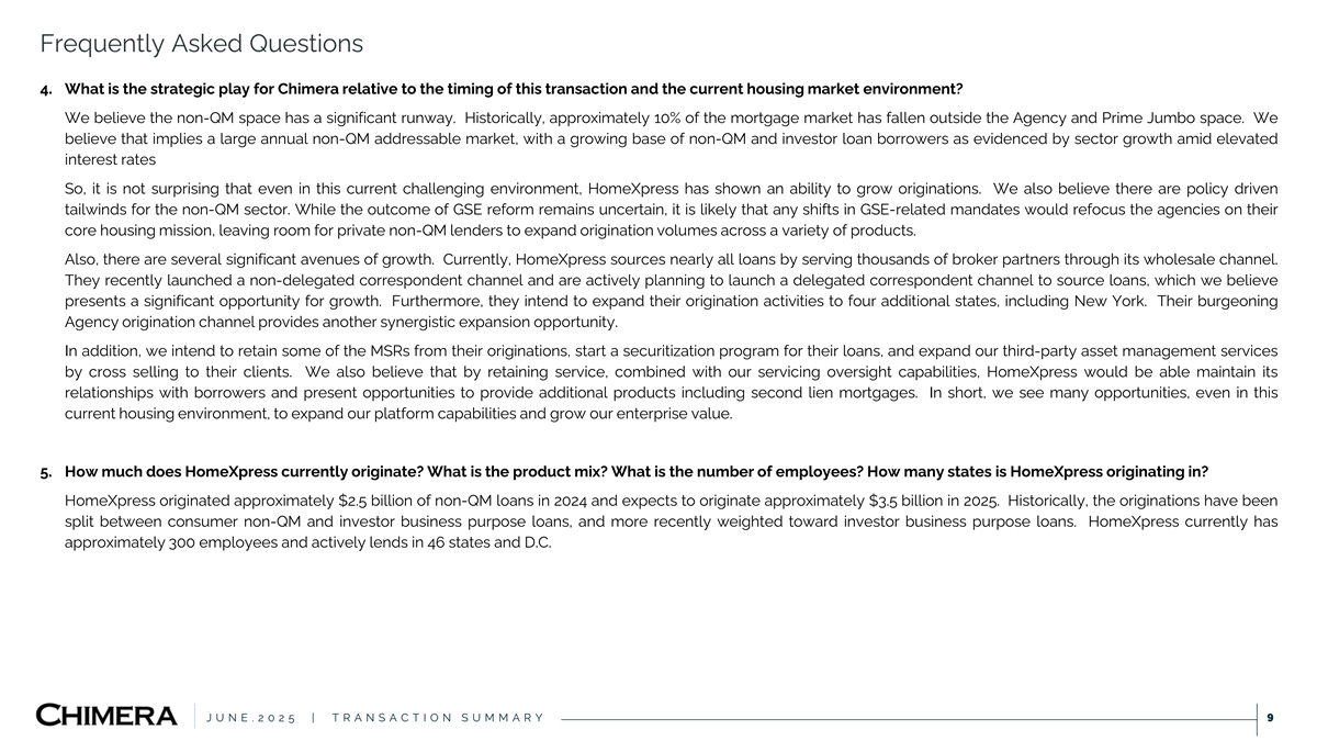 Frequently Asked Questions 4. What is the strategic play for Chimera relative to the timing of this transaction and the current housing market environment? We believe the non-QM space has a significant runway. Historically, approximately 10% of the mortgage market has fallen outside the Agency and Prime Jumbo space. We believe that implies a large annual non-QM addressable market, with a growing base of non-QM and investor loan borrowers as evidenced by sector growth amid elevated interest rates So, it is not surprising that even in this current challenging environment, HomeXpress has shown an ability to grow originations. We also believe there are policy driven tailwinds for the non-QM sector. While the outcome of GSE reform remains uncertain, it is likely that any shifts in GSE-related mandates would refocus the agencies on their core housing mission, leaving room for private non-QM lenders to expand origination volumes across a variety of products. Also, there are several significant avenues of growth. Currently, HomeXpress sources nearly all loans by serving thousands of broker partners through its wholesale channel. They recently launched a non-delegated correspondent channel and are actively planning to launch a delegated correspondent channel to source loans, which we believe presents a significant opportunity for growth. Furthermore, they intend to expand their origination activities to four additional states, including New York. Their burgeoning Agency origination channel provides another synergistic expansion opportunity. In addition, we intend to retain some of the MSRs from their originations, start a securitization program for their loans, and expand our third-party asset management services by cross selling to their clients. We also believe that by retaining service, combined with our servicing oversight capabilities, HomeXpress would be able maintain its relationships with borrowers and present opportunities to provide additional products including second lien mortgages. In short, we see many opportunities, even in this current housing environment, to expand our platform capabilities and grow our enterprise value. 5. How much does HomeXpress currently originate? What is the product mix? What is the number of employees? How many states is HomeXpress originating in? HomeXpress originated approximately $2.5 billion of non-QM loans in 2024 and expects to originate approximately $3.5 billion in 2025. Historically, the originations have been split between consumer non-QM and investor business purpose loans, and more recently weighted toward investor business purpose loans. HomeXpress currently has approximately 300 employees and actively lends in 46 states and D.C. 9 J U N E . 2 0 2 5 | T R A N S A C T I O N S U M M A R Y