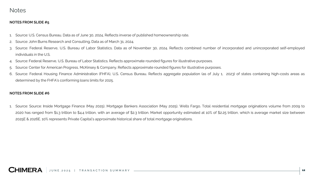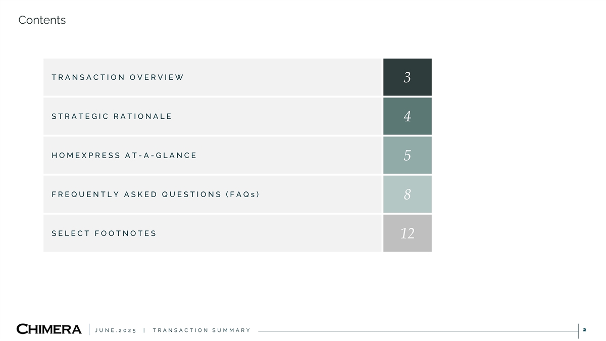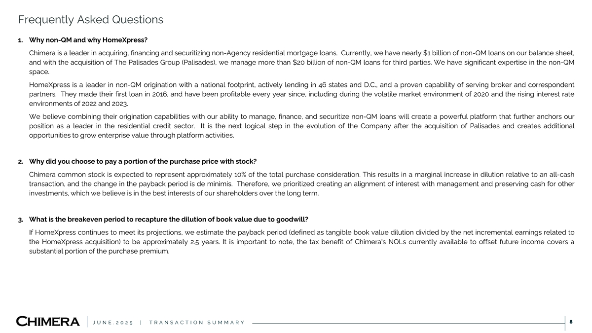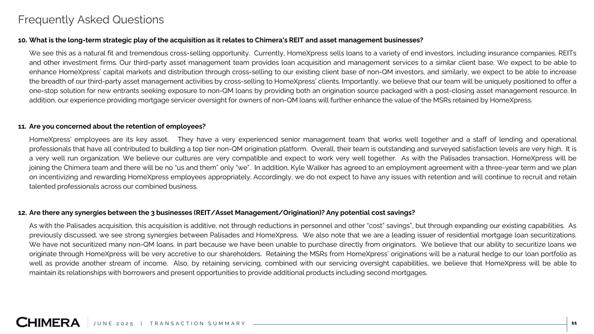 Frequently Asked Questions 10. What is the long-term strategic play of the acquisition as it relates to Chimera’s REIT and asset management businesses? We see this as a natural fit and tremendous cross-selling opportunity. Currently, HomeXpress sells loans to a variety of end investors, including insurance companies, REITs and other investment firms. Our third-party asset management team provides loan acquisition and management services to a similar client base. We expect to be able to enhance HomeXpress’ capital markets and distribution through cross-selling to our existing client base of non-QM investors, and similarly, we expect to be able to increase the breadth of our third-party asset management activities by cross-selling to HomeXpress’ clients. Importantly, we believe that our team will be uniquely positioned to offer a one-stop solution for new entrants seeking exposure to non-QM loans by providing both an origination source packaged with a post-closing asset management resource. In addition, our experience providing mortgage servicer oversight for owners of non-QM loans will further enhance the value of the MSRs retained by HomeXpress. 11. Are you concerned about the retention of employees? HomeXpress’ employees are its key asset. They have a very experienced senior management team that works well together and a staff of lending and operational professionals that have all contributed to building a top tier non-QM origination platform. Overall, their team is outstanding and surveyed satisfaction levels are very high. It is a very well run organization. We believe our cultures are very compatible and expect to work very well together. As with the Palisades transaction, HomeXpress will be joining the Chimera team and there will be no “us and them” only “we”. In addition, Kyle Walker has agreed to an employment agreement with a three-year term and we plan on incentivizing and rewarding HomeXpress employees appropriately. Accordingly, we do not expect to have any issues with retention and will continue to recruit and retain talented professionals across our combined business. 12. Are there any synergies between the 3 businesses (REIT/Asset Management/Origination)? Any potential cost savings? As with the Palisades acquisition, this acquisition is additive, not through reductions in personnel and other “cost” savings”, but through expanding our existing capabilities. As previously discussed, we see strong synergies between Palisades and HomeXpress. We also note that we are a leading issuer of residential mortgage loan securitizations. We have not securitized many non-QM loans, in part because we have been unable to purchase directly from originators. We believe that our ability to securitize loans we originate through HomeXpress will be very accretive to our shareholders. Retaining the MSRs from HomeXpress’ originations will be a natural hedge to our loan portfolio as well as provide another stream of income. Also, by retaining servicing, combined with our servicing oversight capabilities, we believe that HomeXpress will be able to maintain its relationships with borrowers and present opportunities to provide additional products including second mortgages. 11 J U N E . 2 0 2 5 | T R A N S A C T I O N S U M M A R Y