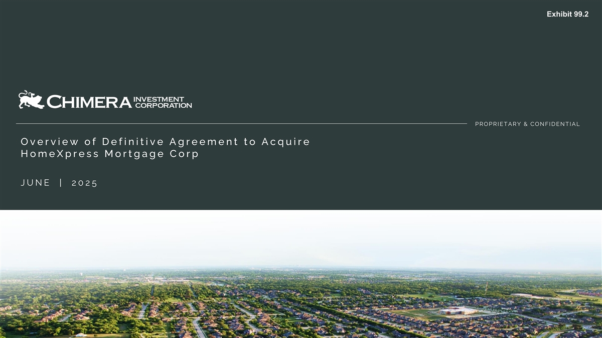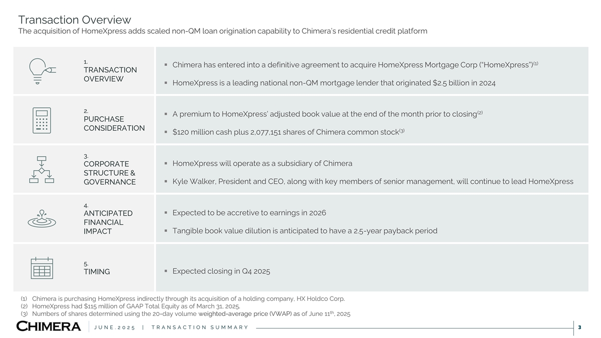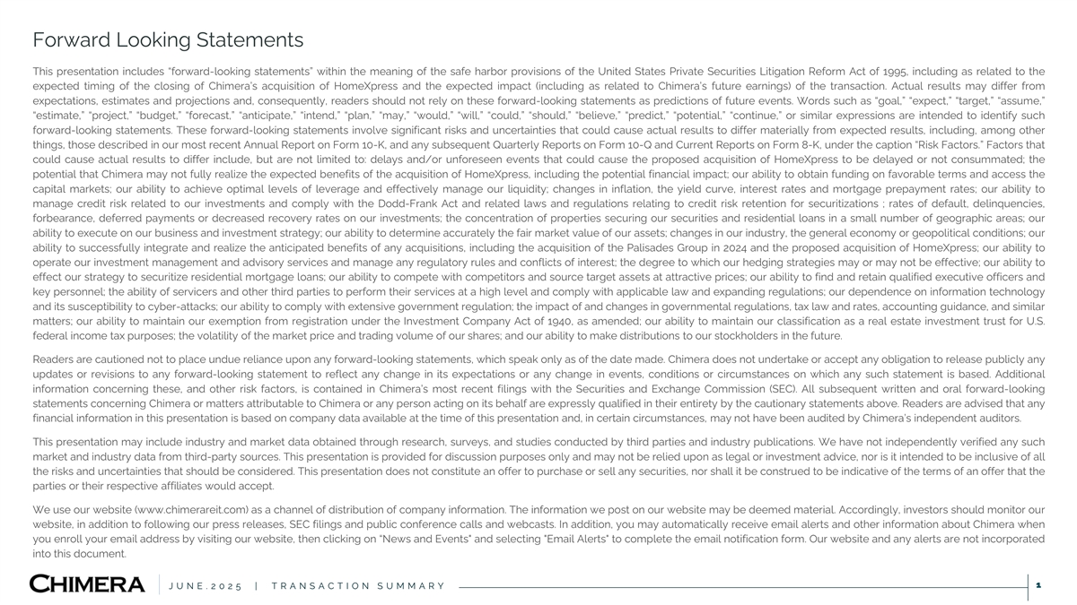 Forward Looking Statements This presentation includes “forward-looking statements” within the meaning of the safe harbor provisions of the United States Private Securities Litigation Reform Act of 1995, including as related to the expected timing of the closing of Chimera’s acquisition of HomeXpress and the expected impact (including as related to Chimera’s future earnings) of the transaction. Actual results may differ from expectations, estimates and projections and, consequently, readers should not rely on these forward-looking statements as predictions of future events. Words such as “goal,” “expect,” “target,” “assume,” “estimate,” “project,” “budget,” “forecast,” “anticipate,” “intend,” “plan,” “may,” “would,” “will,” “could,” “should,” “believe,” “predict,” “potential,” “continue,” or similar expressions are intended to identify such forward-looking statements. These forward-looking statements involve significant risks and uncertainties that could cause actual results to differ materially from expected results, including, among other things, those described in our most recent Annual Report on Form 10-K, and any subsequent Quarterly Reports on Form 10-Q and Current Reports on Form 8-K, under the caption “Risk Factors.” Factors that could cause actual results to differ include, but are not limited to: delays and/or unforeseen events that could cause the proposed acquisition of HomeXpress to be delayed or not consummated; the potential that Chimera may not fully realize the expected benefits of the acquisition of HomeXpress, including the potential financial impact; our ability to obtain funding on favorable terms and access the capital markets; our ability to achieve optimal levels of leverage and effectively manage our liquidity; changes in inflation, the yield curve, interest rates and mortgage prepayment rates; our ability to manage credit risk related to our investments and comply with the Dodd-Frank Act and related laws and regulations relating to credit risk retention for securitizations ; rates of default, delinquencies, forbearance, deferred payments or decreased recovery rates on our investments; the concentration of properties securing our securities and residential loans in a small number of geographic areas; our ability to execute on our business and investment strategy; our ability to determine accurately the fair market value of our assets; changes in our industry, the general economy or geopolitical conditions; our ability to successfully integrate and realize the anticipated benefits of any acquisitions, including the acquisition of the Palisades Group in 2024 and the proposed acquisition of HomeXpress; our ability to operate our investment management and advisory services and manage any regulatory rules and conflicts of interest; the degree to which our hedging strategies may or may not be effective; our ability to effect our strategy to securitize residential mortgage loans; our ability to compete with competitors and source target assets at attractive prices; our ability to find and retain qualified executive officers and key personnel; the ability of servicers and other third parties to perform their services at a high level and comply with applicable law and expanding regulations; our dependence on information technology and its susceptibility to cyber-attacks; our ability to comply with extensive government regulation; the impact of and changes in governmental regulations, tax law and rates, accounting guidance, and similar matters; our ability to maintain our exemption from registration under the Investment Company Act of 1940, as amended; our ability to maintain our classification as a real estate investment trust for U.S. federal income tax purposes; the volatility of the market price and trading volume of our shares; and our ability to make distributions to our stockholders in the future. Readers are cautioned not to place undue reliance upon any forward-looking statements, which speak only as of the date made. Chimera does not undertake or accept any obligation to release publicly any updates or revisions to any forward-looking statement to reflect any change in its expectations or any change in events, conditions or circumstances on which any such statement is based. Additional information concerning these, and other risk factors, is contained in Chimera’s most recent filings with the Securities and Exchange Commission (SEC). All subsequent written and oral forward-looking statements concerning Chimera or matters attributable to Chimera or any person acting on its behalf are expressly qualified in their entirety by the cautionary statements above. Readers are advised that any financial information in this presentation is based on company data available at the time of this presentation and, in certain circumstances, may not have been audited by Chimera’s independent auditors. This presentation may include industry and market data obtained through research, surveys, and studies conducted by third parties and industry publications. We have not independently verified any such market and industry data from third-party sources. This presentation is provided for discussion purposes only and may not be relied upon as legal or investment advice, nor is it intended to be inclusive of all the risks and uncertainties that should be considered. This presentation does not constitute an offer to purchase or sell any securities, nor shall it be construed to be indicative of the terms of an offer that the parties or their respective affiliates would accept. We use our website (www.chimerareit.com) as a channel of distribution of company information. The information we post on our website may be deemed material. Accordingly, investors should monitor our website, in addition to following our press releases, SEC filings and public conference calls and webcasts. In addition, you may
