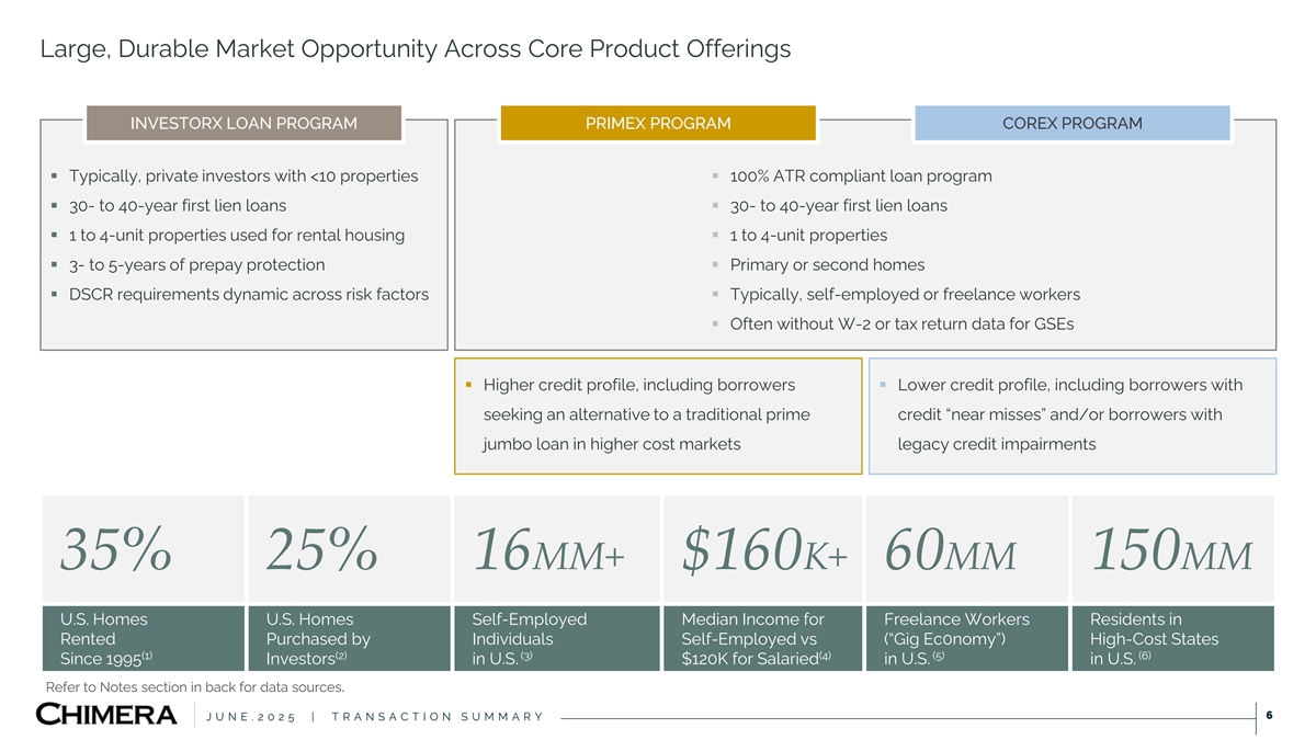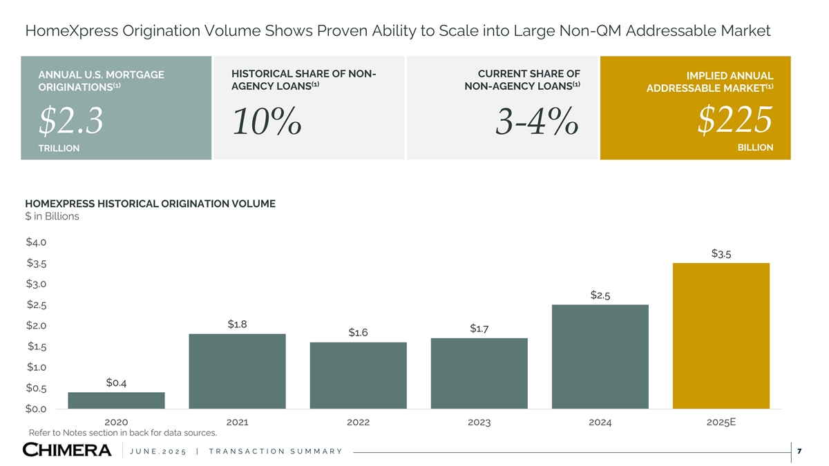 Large, Durable Market Opportunity Across Core Product Offerings INVESTORX LOAN PROGRAM PRIMEX PROGRAM COREX PROGRAM ▪ Typically, private investors with <10 properties▪ 100% ATR compliant loan program ▪ 30- to 40-year first lien loans▪ 30- to 40-year first lien loans ▪ 1 to 4-unit properties used for rental housing▪ 1 to 4-unit properties ▪ 3- to 5-years of prepay protection ▪ Primary or second homes ▪ DSCR requirements dynamic across risk factors▪ Typically, self-employed or freelance workers ▪ Often without W-2 or tax return data for GSEs ▪ Higher credit profile, including borrowers ▪ Lower credit profile, including borrowers with seeking an alternative to a traditional prime credit “near misses” and/or borrowers with jumbo loan in higher cost markets legacy credit impairments 35% 25% 16MM+ $160K+ 60MM 150MM U.S. Homes U.S. Homes Self-Employed Median Income for Freelance Workers Residents in Rented Purchased by Individuals Self-Employed vs (“Gig Ec0nomy”) High-Cost States (1) (2) (3) (4) (5) (6) Since 1995 Investors in U.S. $120K for Salaried in U.S. in U.S. Refer to Notes section in back for data sources. 6 J U N E . 2 0 2 5 | T R A N S A C T I O N S U M M A R Y