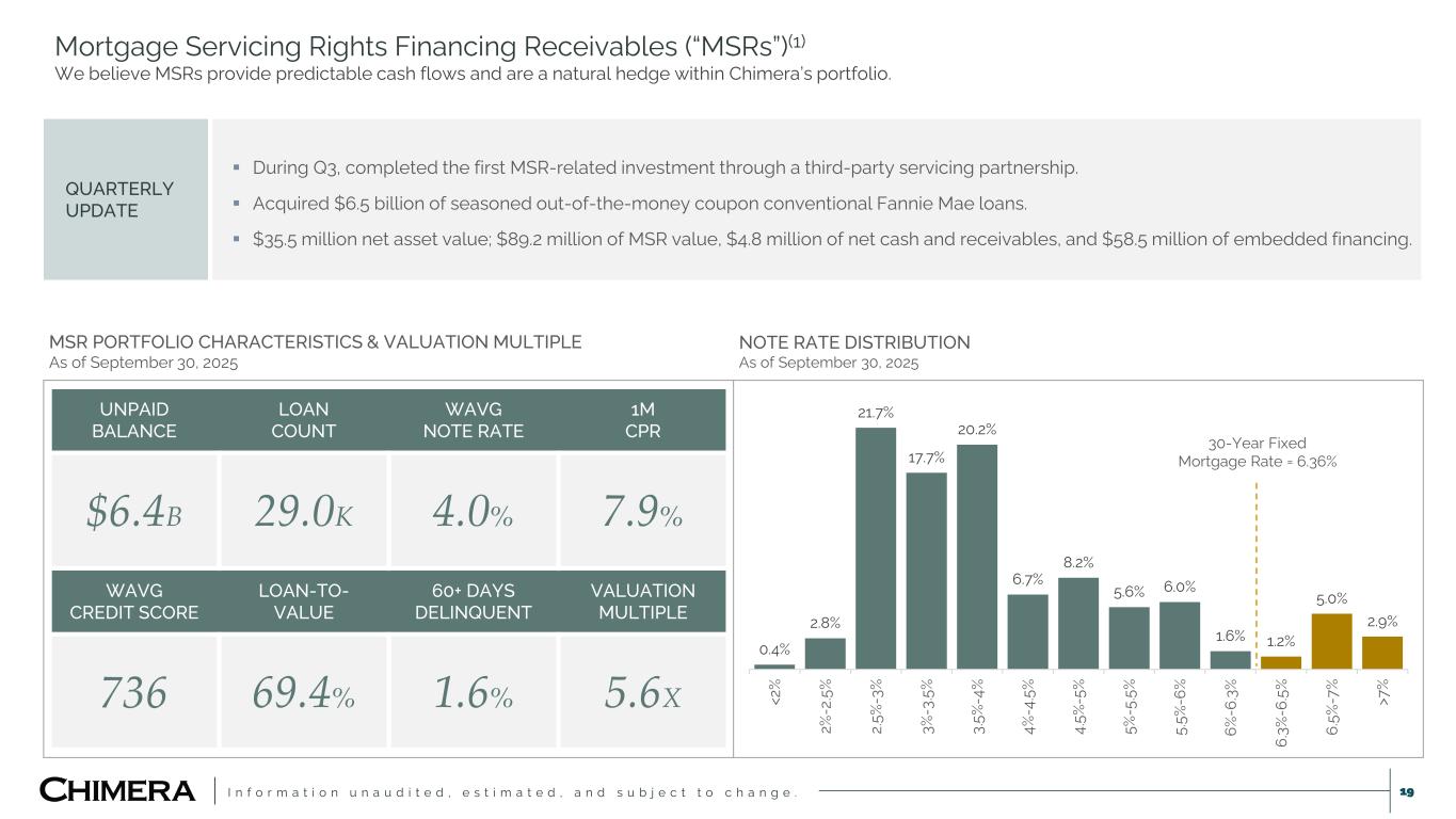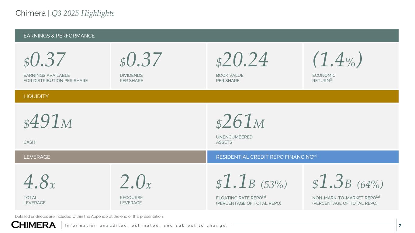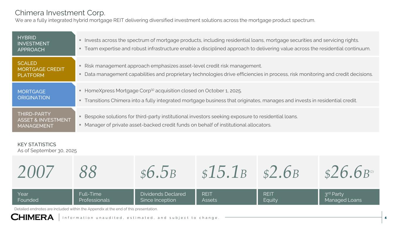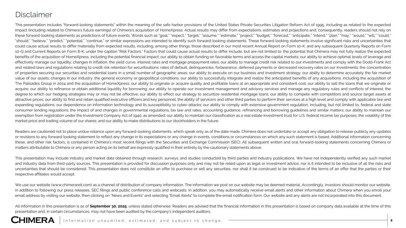 I n f o r m a t i o n u n a u d i t e d , e s t i m a t e d , a n d s u b j e c t t o c h a n g e . This presentation includes “forward-looking statements” within the meaning of the safe harbor provisions of the United States Private Securities Litigation Reform Act of 1995, including as related to the expected impact (including related to Chimera’s future earnings) of Chimera’s acquisition of HomeXpress. Actual results may differ from expectations, estimates and projections and, consequently, readers should not rely on these forward-looking statements as predictions of future events. Words such as “goal,” “expect,” “target,” “assume,” “estimate,” “project,” “budget,” “forecast,” “anticipate,” “intend,” “plan,” “may,” “would,” “will,” “could,” “should,” “believe,” “predict,” “potential,” “continue,” or similar expressions are intended to identify such forward-looking statements. These forward-looking statements involve significant risks and uncertainties that could cause actual results to differ materially from expected results, including, among other things, those described in our most recent Annual Report on Form 10-K, and any subsequent Quarterly Reports on Form 10-Q and Current Reports on Form 8-K, under the caption “Risk Factors.” Factors that could cause actual results to differ include, but are not limited to: the potential that Chimera may not fully realize the expected benefits of the acquisition of HomeXpress, including the potential financial impact; our ability to obtain funding on favorable terms and access the capital markets; our ability to achieve optimal levels of leverage and effectively manage our liquidity; changes in inflation, the yield curve, interest rates and mortgage prepayment rates; our ability to manage credit risk related to our investments and comply with the Dodd-Frank Act and related laws and regulations relating to credit risk retention for securitizations; rates of default, delinquencies, forbearance, deferred payments or decreased recovery rates on our investments; the concentration of properties securing our securities and residential loans in a small number of geographic areas; our ability to execute on our business and investment strategy; our ability to determine accurately the fair market value of our assets; changes in our industry, the general economy or geopolitical conditions; our ability to successfully integrate and realize the anticipated benefits of any acquisitions, including the acquisition of The Palisades Group in 2024 and the acquisition of HomeXpress; our ability to originate or acquire quality and profitable loans at an appropriate and consistent cost; our ability to sell the loans that we originate or acquire; our ability to refinance or obtain additional liquidity for borrowing; our ability to operate our investment management and advisory services and manage any regulatory rules and conflicts of interest; the degree to which our hedging strategies may or may not be effective; our ability to effect our strategy to securitize residential mortgage loans; our ability to compete with competitors and source target assets at attractive prices; our ability to find and retain qualified executive officers and key personnel; the ability of servicers and other third parties to perform their services at a high level and comply with applicable law and expanding regulations; our dependence on information technology and its susceptibility to cyber-attacks; our ability to comply with extensive government regulation, including, but not limited to, federal and state consumer lending regulations; the impact of and changes in governmental regulations, tax law and rates, accounting guidance, refinancing and borrowing guidelines and similar matters; our ability to maintain our exemption from registration under the Investment Company Act of 1940, as amended; our ability to maintain our classification as a real estate investment trust for U.S. federal income tax purposes; the volatility of the market price and trading volume of our shares; and our ability to make distributions to our stockholders in the future. Readers are cautioned not to place undue reliance upon any forward-looking statements, which speak only as of the date made. Chimera does not undertake or accept any obligation to release publicly any updates or revisions to any forward-looking statement to reflect any change in its expectations or any change in events, conditions or circumstances on which any such statement is based. Additional information concerning these, and other risk factors, is contained in Chimera’s most recent filings with the Securities and Exchange Commission (SEC). All subsequent written and oral forward-looking statements concerning Chimera or matters attributable to Chimera or any person acting on its behalf are expressly qualified in their entirety by the cautionary statements above. This presentation may include industry and market data obtained through research, surveys, and studies conducted by third parties and industry publications. We have not independently verified any such market and industry data from third-party sources. This presentation is provided for discussion purposes only and may not be relied upon as legal or investment advice, nor is it intended to be inclusive of all the risks and uncertainties that should be considered. This presentation does not constitute an offer to purchase or sell any securities, nor shall it be construed to be indicative of the terms of an offer that the parties or their respective affiliates would accept. We use our website (www.chimerareit.com) as a channel of distribution of company information. The information we post on our website may be deemed material. Accordingly, investors should monitor our website, in addition to following our press releases, SEC filings and public conference calls and webcasts. In addition, you may au