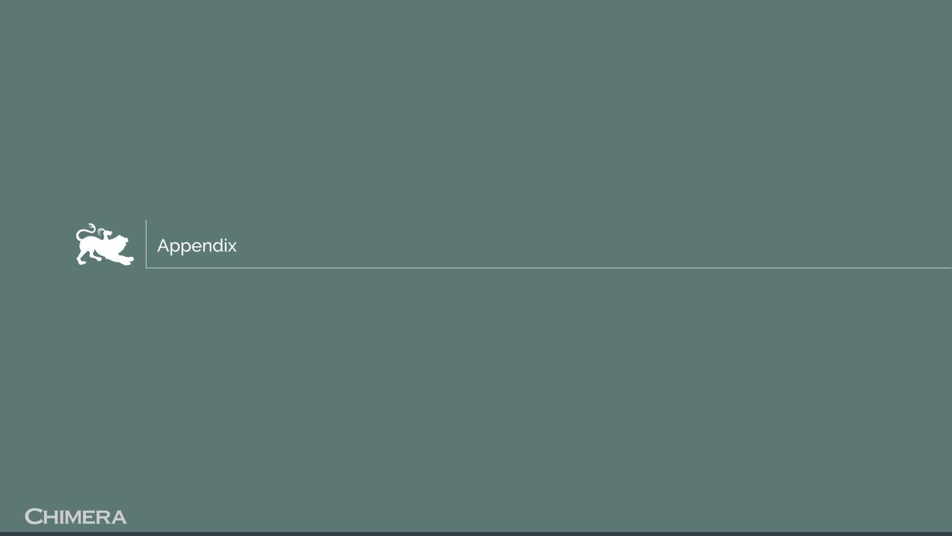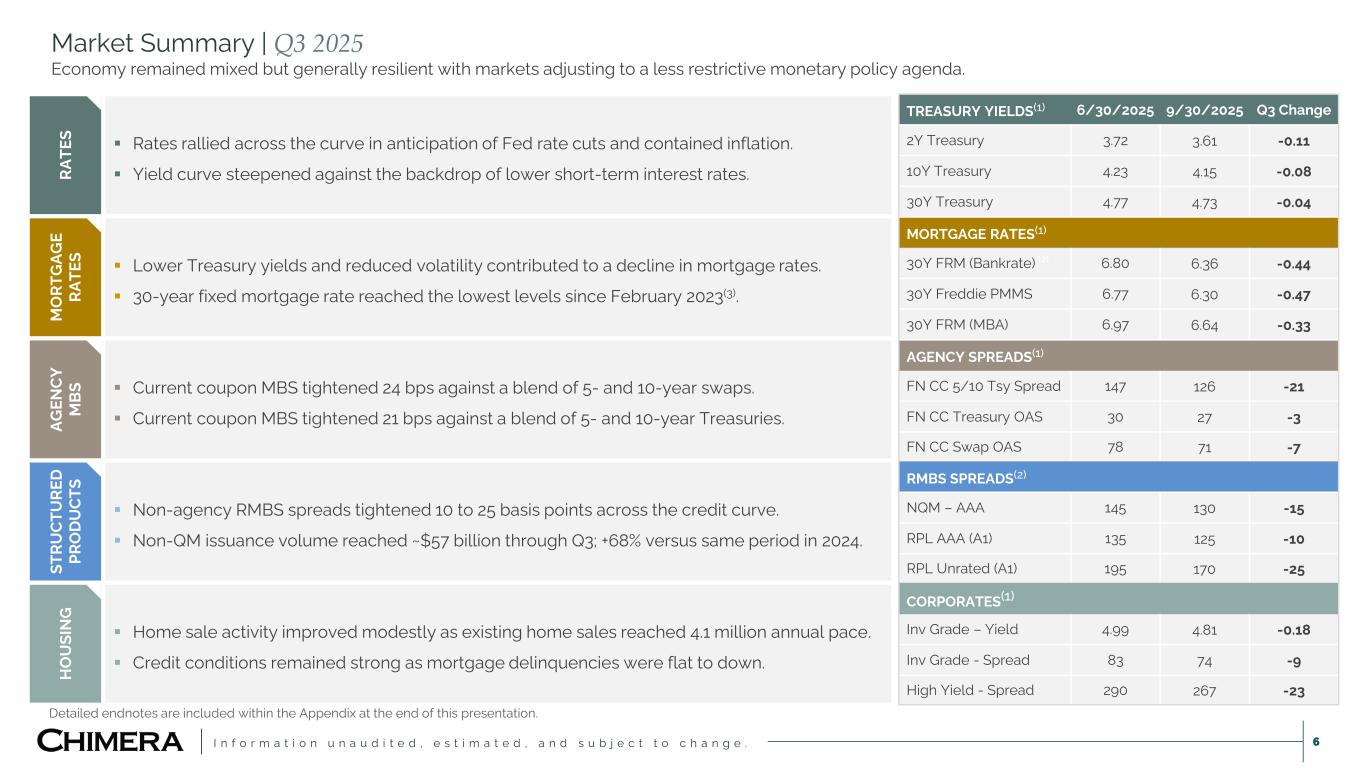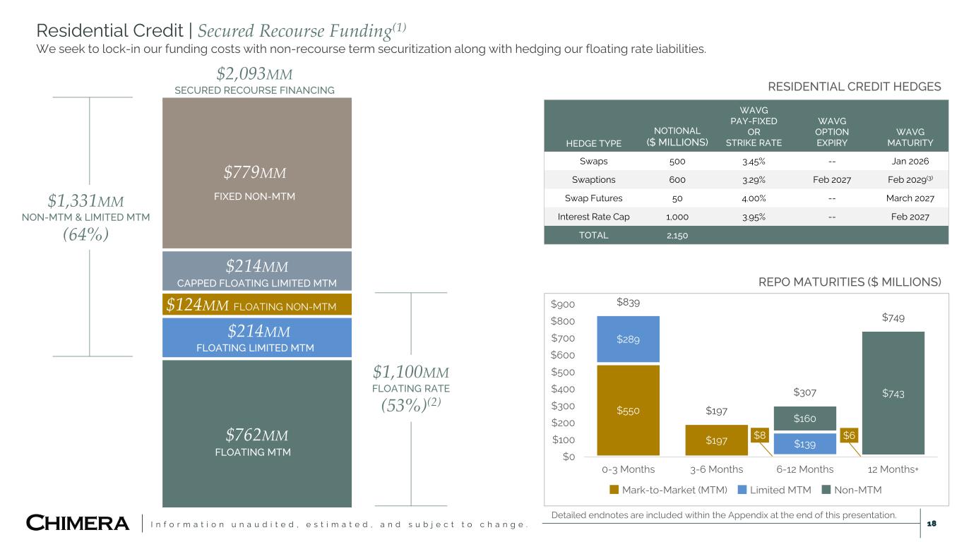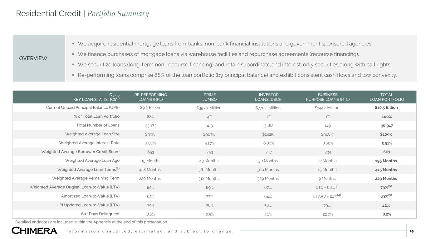 I n f o r m a t i o n u n a u d i t e d , e s t i m a t e d , a n d s u b j e c t t o c h a n g e . This presentation includes “forward-looking statements” within the meaning of the safe harbor provisions of the United States Private Securities Litigation Reform Act of 1995, including as related to the expected impact (including related to Chimera’s future earnings) of Chimera’s acquisition of HomeXpress. Actual results may differ from expectations, estimates and projections and, consequently, readers should not rely on these forward-looking statements as predictions of future events. Words such as “goal,” “expect,” “target,” “assume,” “estimate,” “project,” “budget,” “forecast,” “anticipate,” “intend,” “plan,” “may,” “would,” “will,” “could,” “should,” “believe,” “predict,” “potential,” “continue,” or similar expressions are intended to identify such forward-looking statements. These forward-looking statements involve significant risks and uncertainties that could cause actual results to differ materially from expected results, including, among other things, those described in our most recent Annual Report on Form 10-K, and any subsequent Quarterly Reports on Form 10-Q and Current Reports on Form 8-K, under the caption “Risk Factors.” Factors that could cause actual results to differ include, but are not limited to: the potential that Chimera may not fully realize the expected benefits of the acquisition of HomeXpress, including the potential financial impact; our ability to obtain funding on favorable terms and access the capital markets; our ability to achieve optimal levels of leverage and effectively manage our liquidity; changes in inflation, the yield curve, interest rates and mortgage prepayment rates; our ability to manage credit risk related to our investments and comply with the Dodd-Frank Act and related laws and regulations relating to credit risk retention for securitizations; rates of default, delinquencies, forbearance, deferred payments or decreased recovery rates on our investments; the concentration of properties securing our securities and residential loans in a small number of geographic areas; our ability to execute on our business and investment strategy; our ability to determine accurately the fair market value of our assets; changes in our industry, the general economy or geopolitical conditions; our ability to successfully integrate and realize the anticipated benefits of any acquisitions, including the acquisition of The Palisades Group in 2024 and the acquisition of HomeXpress; our ability to originate or acquire quality and profitable loans at an appropriate and consistent cost; our ability to sell the loans that we originate or acquire; our ability to refinance or obtain additional liquidity for borrowing; our ability to operate our investment management and advisory services and manage any regulatory rules and conflicts of interest; the degree to which our hedging strategies may or may not be effective; our ability to effect our strategy to securitize residential mortgage loans; our ability to compete with competitors and source target assets at attractive prices; our ability to find and retain qualified executive officers and key personnel; the ability of servicers and other third parties to perform their services at a high level and comply with applicable law and expanding regulations; our dependence on information technology and its susceptibility to cyber-attacks; our ability to comply with extensive government regulation, including, but not limited to, federal and state consumer lending regulations; the impact of and changes in governmental regulations, tax law and rates, accounting guidance, refinancing and borrowing guidelines and similar matters; our ability to maintain our exemption from registration under the Investment Company Act of 1940, as amended; our ability to maintain our classification as a real estate investment trust for U.S. federal income tax purposes; the volatility of the market price and trading volume of our shares; and our ability to make distributions to our stockholders in the future. Readers are cautioned not to place undue reliance upon any forward-looking statements, which speak only as of the date made. Chimera does not undertake or accept any obligation to release publicly any updates or revisions to any forward-looking statement to reflect any change in its expectations or any change in events, conditions or circumstances on which any such statement is based. Additional information concerning these, and other risk factors, is contained in Chimera’s most recent filings with the Securities and Exchange Commission (SEC). All subsequent written and oral forward-looking statements concerning Chimera or matters attributable to Chimera or any person acting on its behalf are expressly qualified in their entirety by the cautionary statements above. This presentation may include industry and market data obtained through research, surveys, and studies conducted by third parties and industry publications. We have not independently verified any such market and industry data from third-party sources. This presentation is provided for discussion purposes only and may not be relied upon as legal or investment advice, nor is it intended to be inclusive of all the risks and uncertainties that should be considered. This presentation does not constitute an offer to purchase or sell any securities, nor shall it be construed to be indicative of the terms of an offer that the parties or their respective affiliates would accept. We use our website (www.chimerareit.com) as a channel of distribution of company information. The information we post on our website may be deemed material. Accordingly, investors should monitor our website, in addition to following our press releases, SEC filings and public conference calls and webcasts. In addition, you may au