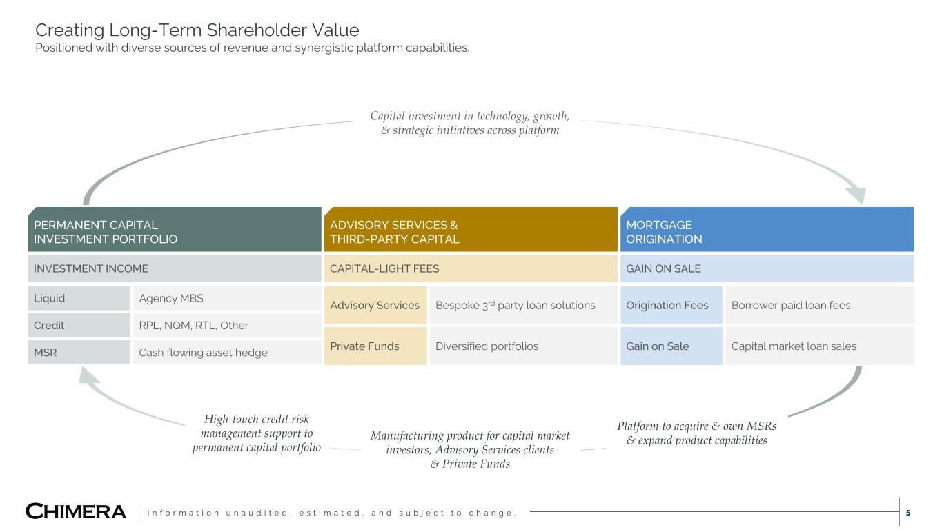 I n f o r m a t i o n u n a u d i t e d , e s t i m a t e d , a n d s u b j e c t t o c h a n g e . 4 HYBRID INVESTMENT APPROACH  Invests across the spectrum of mortgage products, including residential loans, mortgage securities and servicing rights.  Team expertise and robust infrastructure enable a disciplined approach to delivering value across the residential continuum. SCALED MORTGAGE CREDIT PLATFORM  Risk management approach emphasizes asset-level credit risk management.  Data management capabilities and proprietary technologies drive efficiencies in process, risk monitoring and credit decisions. MORTGAGE ORIGINATION  HomeXpress Mortgage Corp(1) acquisition closed on October 1, 2025.  Transitions Chimera into a fully integrated mortgage business that originates, manages and invests in residential credit. THIRD-PARTY ASSET & INVESTMENT MANAGEMENT  Bespoke solutions for third-party institutional investors seeking exposure to residential loans.  Manager of private asset-backed credit funds on behalf of institutional allocators. KEY STATISTICS As of September 30, 2025 2007 88 $6.5B $15.1B $2.6B $26.6B(2) Year Founded Full-Time Professionals Dividends Declared Since Inception REIT Assets REIT Equity 3rd Party Managed Loans Chimera Investment Corp. We are a fully integrated hybrid mortgage REIT delivering diversified investment solutions across the mortgage product spectrum. Detailed endnotes are included within the Appendix at the end of this presentation.