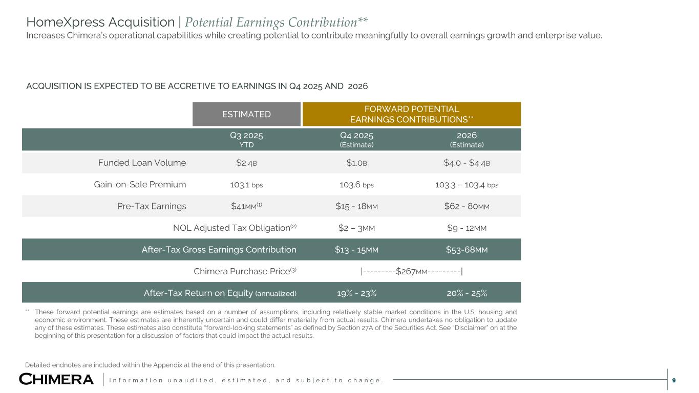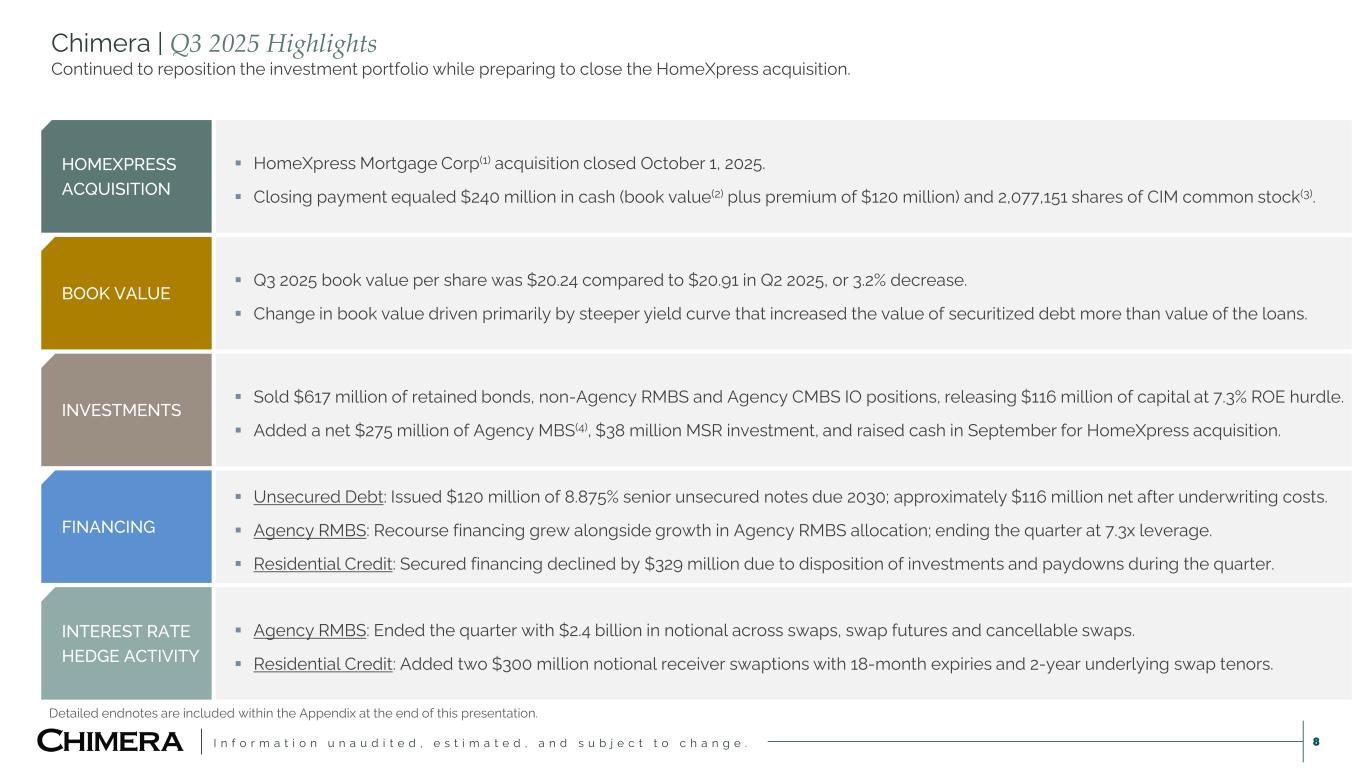I n f o r m a t i o n u n a u d i t e d , e s t i m a t e d , a n d s u b j e c t t o c h a n g e . 8 Chimera | Q3 2025 Highlights Continued to reposition the investment portfolio while preparing to close the HomeXpress acquisition. HOMEXPRESS ACQUISITION  HomeXpress Mortgage Corp(1) acquisition closed October 1, 2025.  Closing payment equaled $240 million in cash (book value(2) plus premium of $120 million) and 2,077,151 shares of CIM common stock(3). BOOK VALUE  Q3 2025 book value per share was $20.24 compared to $20.91 in Q2 2025, or 3.2% decrease.  Change in book value driven primarily by steeper yield curve that increased the value of securitized debt more than value of the loans. INVESTMENTS  Sold $617 million of retained bonds, non-Agency RMBS and Agency CMBS IO positions, releasing $116 million of capital at 7.3% ROE hurdle.  Added a net $275 million of Agency MBS(4), $38 million MSR investment, and raised cash in September for HomeXpress acquisition. FINANCING  Unsecured Debt: Issued $120 million of 8.875% senior unsecured notes due 2030; approximately $116 million net after underwriting costs.  Agency RMBS: Recourse financing grew alongside growth in Agency RMBS allocation; ending the quarter at 7.3x leverage.  Residential Credit: Secured financing declined by $329 million due to disposition of investments and paydowns during the quarter. INTEREST RATE HEDGE ACTIVITY  Agency RMBS: Ended the quarter with $2.4 billion in notional across swaps, swap futures and cancellable swaps.  Residential Credit: Added two $300 million notional receiver swaptions with 18-month expiries and 2-year underlying swap tenors. Detailed endnotes are included within the Appendix at the end of this presentation.