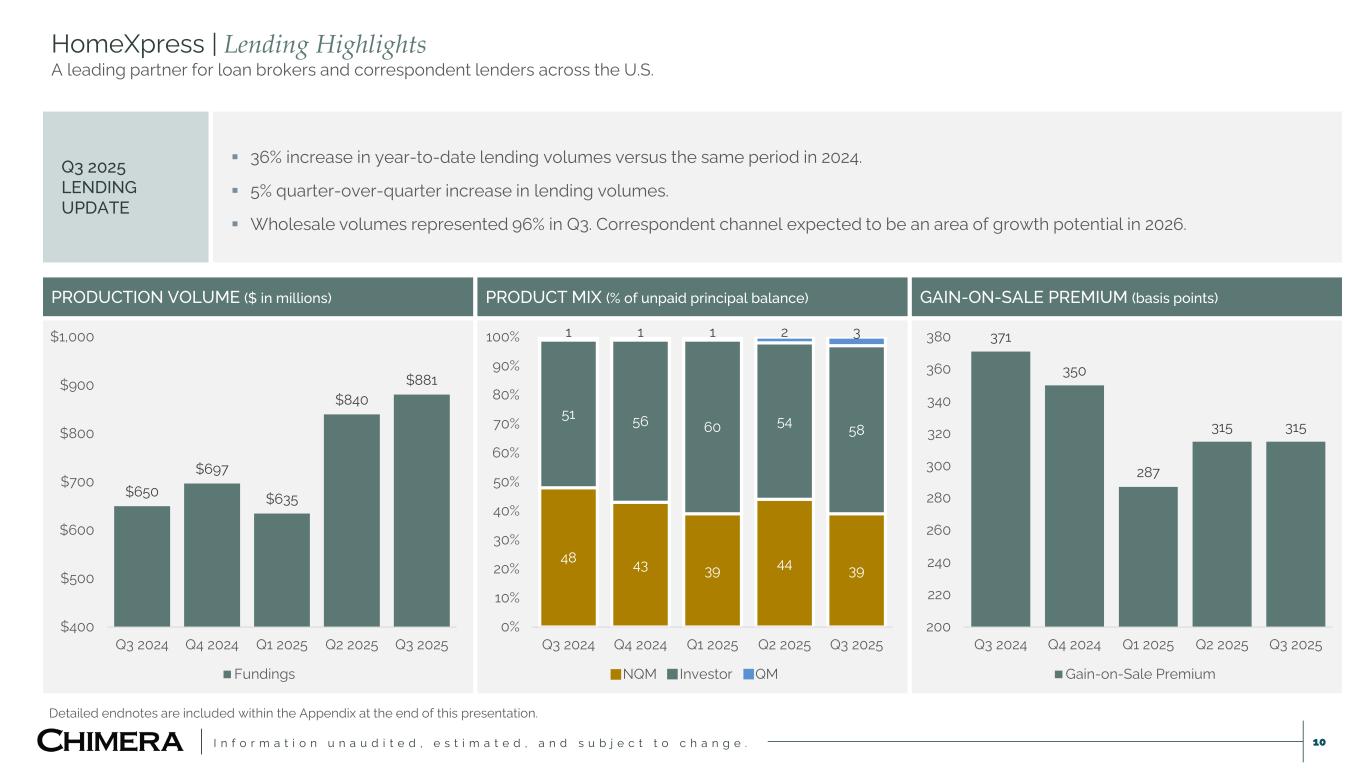 I n f o r m a t i o n u n a u d i t e d , e s t i m a t e d , a n d s u b j e c t t o c h a n g e . 9 HomeXpress Acquisition | Potential Earnings Contribution** Increases Chimera’s operational capabilities while creating potential to contribute meaningfully to overall earnings growth and enterprise value. ESTIMATED FORWARD POTENTIAL EARNINGS CONTRIBUTIONS** Q3 2025 YTD Q4 2025 (Estimate) 2026 (Estimate) Funded Loan Volume $2.4B $1.0B $4.0 - $4.4B Gain-on-Sale Premium 103.1 bps 103.6 bps 103.3 – 103.4 bps Pre-Tax Earnings $41MM(1) $15 - 18MM $62 - 80MM NOL Adjusted Tax Obligation(2) $2 – 3MM $9 - 12MM After-Tax Gross Earnings Contribution $13 - 15MM $53-68MM Chimera Purchase Price(3) |---------$267MM---------| After-Tax Return on Equity (annualized) 19% - 23% 20% - 25% ACQUISITION IS EXPECTED TO BE ACCRETIVE TO EARNINGS IN Q4 2025 AND 2026 ** These forward potential earnings are estimates based on a number of assumptions, including relatively stable market conditions in the U.S. housing and economic environment. These estimates are inherently uncertain and could differ materially from actual results. Chimera undertakes no obligation to update any of these estimates. These estimates also constitute “forward-looking statements” as defined by Section 27A of the Securities Act. See “Disclaimer” on at the beginning of this presentation for a discussion of factors that could impact the actual results. Detailed endnotes are included within the Appendix at the end of this presentation.