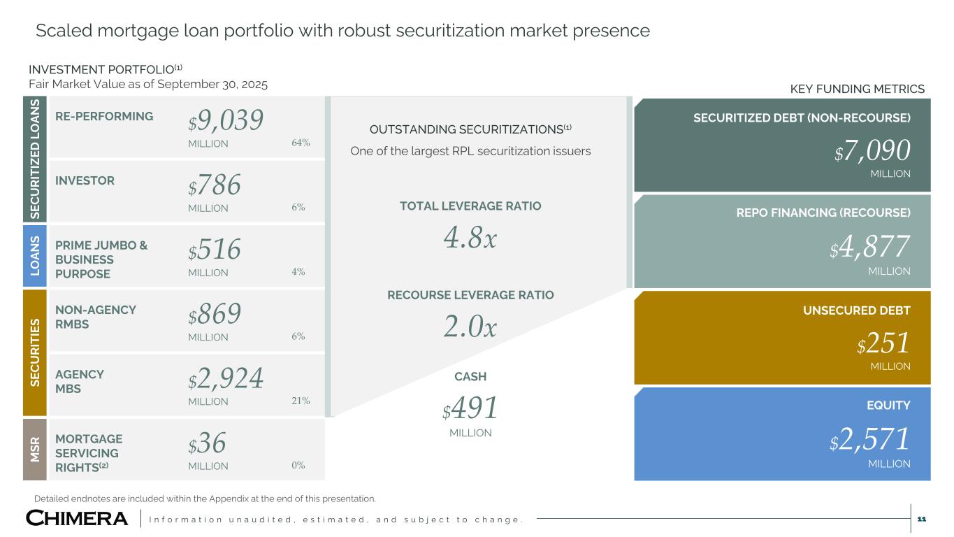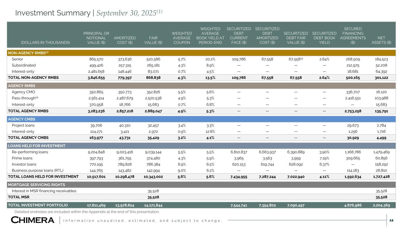 I n f o r m a t i o n u n a u d i t e d , e s t i m a t e d , a n d s u b j e c t t o c h a n g e . 11 Scaled mortgage loan portfolio with robust securitization market presence Detailed endnotes are included within the Appendix at the end of this presentation. SECURITIZED DEBT (NON-RECOURSE) $7,090 MILLION REPO FINANCING (RECOURSE) $4,877 MILLION UNSECURED DEBT $251 MILLION EQUITY $2,571 MILLION KEY FUNDING METRICS INVESTMENT PORTFOLIO(1) Fair Market Value as of September 30, 2025 SE C U RI TI ZE D L O AN S RE-PERFORMING $9,039 MILLION 64% INVESTOR $786 MILLION 6% LO AN S PRIME JUMBO & BUSINESS PURPOSE $516 MILLION 4% SE C U RI TI ES NON-AGENCY RMBS $869 MILLION 6% AGENCY MBS $2,924 MILLION 21% M SR MORTGAGE SERVICING RIGHTS(2) $36 MILLION 0% OUTSTANDING SECURITIZATIONS(1) One of the largest RPL securitization issuers TOTAL LEVERAGE RATIO 4.8x RECOURSE LEVERAGE RATIO 2.0x CASH $491 MILLION