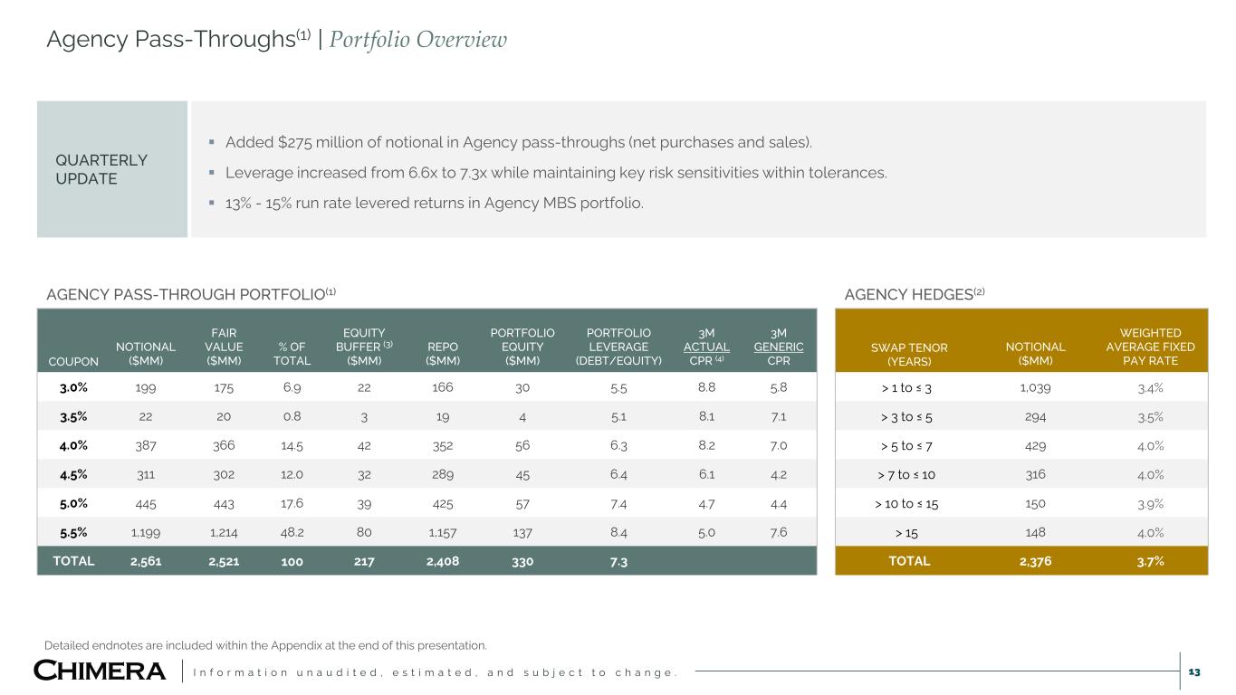 I n f o r m a t i o n u n a u d i t e d , e s t i m a t e d , a n d s u b j e c t t o c h a n g e . Investment Summary | September 30, 2025(1) 12 Detailed endnotes are included within the Appendix at the end of this presentation. (DOLLARS IN THOUSANDS) PRINCIPAL OR NOTIONAL VALUE ($) AMORTIZED COST ($) FAIR VALUE ($) WEIGHTED AVERAGE COUPON WEIGHTED AVERAGE BOOK YIELD AT PERIOD-END SECURITIZED DEBT CURRENT FACE ($) SECURITIZED DEBT AMORTIZED COST ($) SECURITIZED DEBT FAIR VALUE ($) SECURITIZED DEBT BOOK YIELD SECURED FINANCING AGREEMENTS ($) NET ASSETS ($) NON-AGENCY RMBS(2) Senior 865,570 373,636 520,586 5.7% 20.2% 109,786 67,558 67,558(3) 2.64% 268,509 184,523 Subordinated 499,426 257,315 265,181 4.3% 8.9% — — — — 212,975 52,208 Interest-only 2,481,658 148,446 83,071 0.7% 4.5% — — — — 18,681 64,392 TOTAL NON-AGENCY RMBS 3,846,655 779,397 868,838 4.3% 13.5% 109,786 67,558 67,558 2.64% 500,165 301,122 AGENCY RMBS Agency CMO 350,865 350,773 352,826 5.5% 5.6% — — — — 336,707 16,120 Pass-through(4) 2,561,414 2,487,679 2,520,538 4.9% 5.3% — — — — 2,416,551 103,988 Interest-only 370,958 18,766 15,683 0.7% 6.8% — — — — — 15,683 TOTAL AGENCY RMBS 3,283,236 2,857,218 2,889,047 4.9% 5.3% — — — — 2,753,258 135,791 AGENCY CMBS Project loans 39,706 40,310 32,457 3.4% 3.3% — — — — 29,673 2,784 Interest-only 124,271 3,421 2,972 0.9% 12.8% — — — — 1,256 1,716 TOTAL AGENCY CMBS 163,977 43,731 35,429 3.2% 4.1% — — — — 30,929 4,499 LOANS HELD FOR INVESTMENT Re-performing loans 9,204,848 9,003,416 9,039,144 5.5% 5.5% 6,810,837 6,663,937 6,390,889 3.90% 1,168,786 1,479,469 Prime loans 397,793 361,755 374,480 4.3% 5.9% 3,965 3,563 3,959 7.19% 309,665 60,856 Investor loans 770,195 789,826 786,384 6.9% 6.5% 620,153 619,744 628,092 6.37% — 158,292 Business purpose loans (RTL) 144,765 143,482 142,994 9.0% 6.2% — — — — 114,183 28,810 TOTAL LOANS HELD FOR INVESTMENT 10,517,601 10,298,478 10,343,002 5.6% 5.6% 7,434,955 7,287,244 7,022,940 4.11% 1,592,634 1,727,428 MORTGAGE SERVICING RIGHTS Interest in MSR financing receivables 35,528 35,528 TOTAL MSR 35,528 35,528 TOTAL INVESTMENT PORTFOLIO 17,811,469 13,978,824 14,171,844 7,544,741 7,354,802 7,090,497 4,876,986 2,204,369