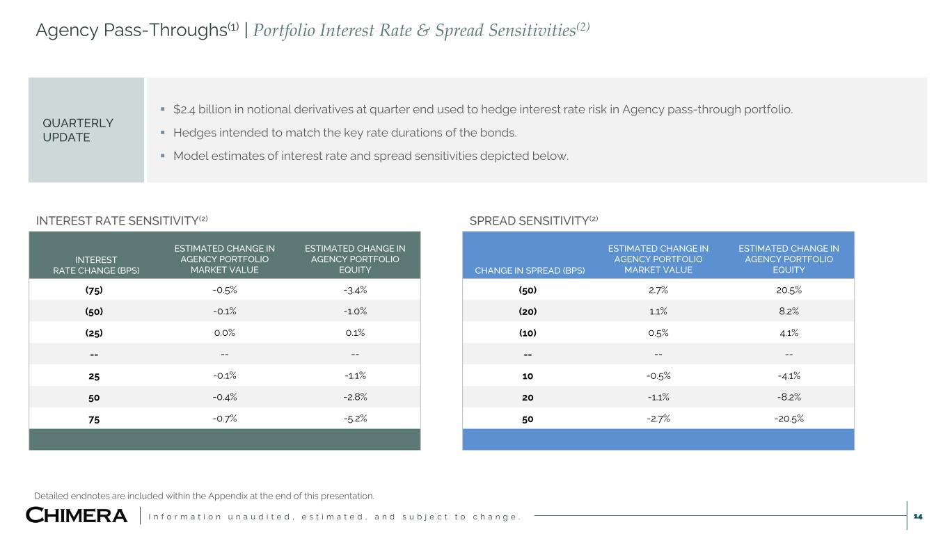 I n f o r m a t i o n u n a u d i t e d , e s t i m a t e d , a n d s u b j e c t t o c h a n g e . 13 Agency Pass-Throughs(1) | Portfolio Overview QUARTERLY UPDATE  Added $275 million of notional in Agency pass-throughs (net purchases and sales).  Leverage increased from 6.6x to 7.3x while maintaining key risk sensitivities within tolerances.  13% - 15% run rate levered returns in Agency MBS portfolio. COUPON NOTIONAL ($MM) FAIR VALUE ($MM) % OF TOTAL EQUITY BUFFER (3) ($MM) REPO ($MM) PORTFOLIO EQUITY ($MM) PORTFOLIO LEVERAGE (DEBT/EQUITY) 3M ACTUAL CPR (4) 3M GENERIC CPR 3.0% 199 175 6.9 22 166 30 5.5 8.8 5.8 3.5% 22 20 0.8 3 19 4 5.1 8.1 7.1 4.0% 387 366 14.5 42 352 56 6.3 8.2 7.0 4.5% 311 302 12.0 32 289 45 6.4 6.1 4.2 5.0% 445 443 17.6 39 425 57 7.4 4.7 4.4 5.5% 1,199 1,214 48.2 80 1,157 137 8.4 5.0 7.6 TOTAL 2,561 2,521 100 217 2,408 330 7.3 AGENCY PASS-THROUGH PORTFOLIO(1) SWAP TENOR (YEARS) NOTIONAL ($MM) WEIGHTED AVERAGE FIXED PAY RATE > 1 to ≤ 3 1,039 3.4% > 3 to ≤ 5 294 3.5% > 5 to ≤ 7 429 4.0% > 7 to ≤ 10 316 4.0% > 10 to ≤ 15 150 3.9% > 15 148 4.0% TOTAL 2,376 3.7% AGENCY HEDGES(2) Detailed endnotes are included within the Appendix at the end of this presentation.