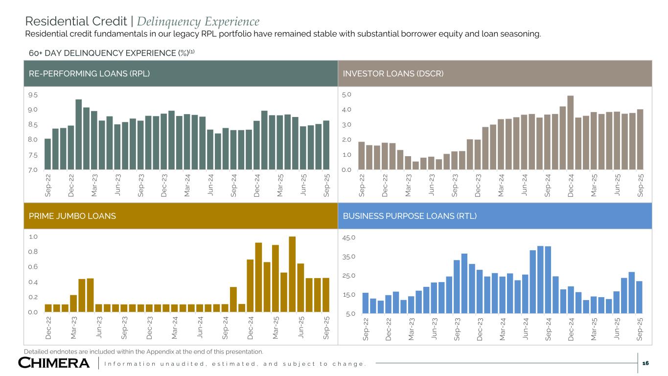 I n f o r m a t i o n u n a u d i t e d , e s t i m a t e d , a n d s u b j e c t t o c h a n g e . Residential Credit | Portfolio Summary 15 OVERVIEW  We acquire residential mortgage loans from banks, non-bank financial institutions and government sponsored agencies.  We finance purchases of mortgage loans via warehouse facilities and repurchase agreements (recourse financing).  We securitize loans (long-term non-recourse financing) and retain subordinate and interest-only securities along with call rights.  Re-performing loans comprise 88% of the loan portfolio (by principal balance) and exhibit consistent cash flows and low convexity. Q3’25 KEY LOAN STATISTICS(1) RE-PERFORMING LOANS (RPL) PRIME JUMBO INVESTOR LOANS (DSCR) BUSINESS PURPOSE LOANS (RTL) TOTAL LOAN PORTFOLIO Current Unpaid Principal Balance (UPB) $9.2 Billion $397.7 Million $770.2 Million $144.2 Million $10.5 Billion % of Total Loan Portfolio 88% 4% 7% 1% 100% Total Number of Loans 93,173 413 3,182 149 96,917 Weighted Average Loan Size $99K $963K $242K $968K $109K Weighted Average Interest Rate 5.86% 4.27% 6.86% 8.68% 5.91% Weighted Average Borrower Credit Score 653 753 747 734 667 Weighted Average Loan Age 215 Months 43 Months 30 Months 22 Months 195 Months Weighted Average Loan Terms(2) 428 Months 361 Months 360 Months 15 Months 415 Months Weighted Average Remaining Term 220 Months 318 Months 329 Months 9 Months 229 Months Weighted Average Original Loan-to-Value (LTV) 80% 89% 67% LTC = 68%(3) 79%(5) Amortized Loan-to-Value (LTV) 62% 77% 64% LTARV = 64%(4) 63%(5) HPI Updated Loan-to-Value (LTV) 39% 76% 58% 79% 42% 60+ Days Delinquent 8.6% 0.5% 4.1% 22.0% 8.2% Detailed endnotes are included within the Appendix at the end of this presentation.