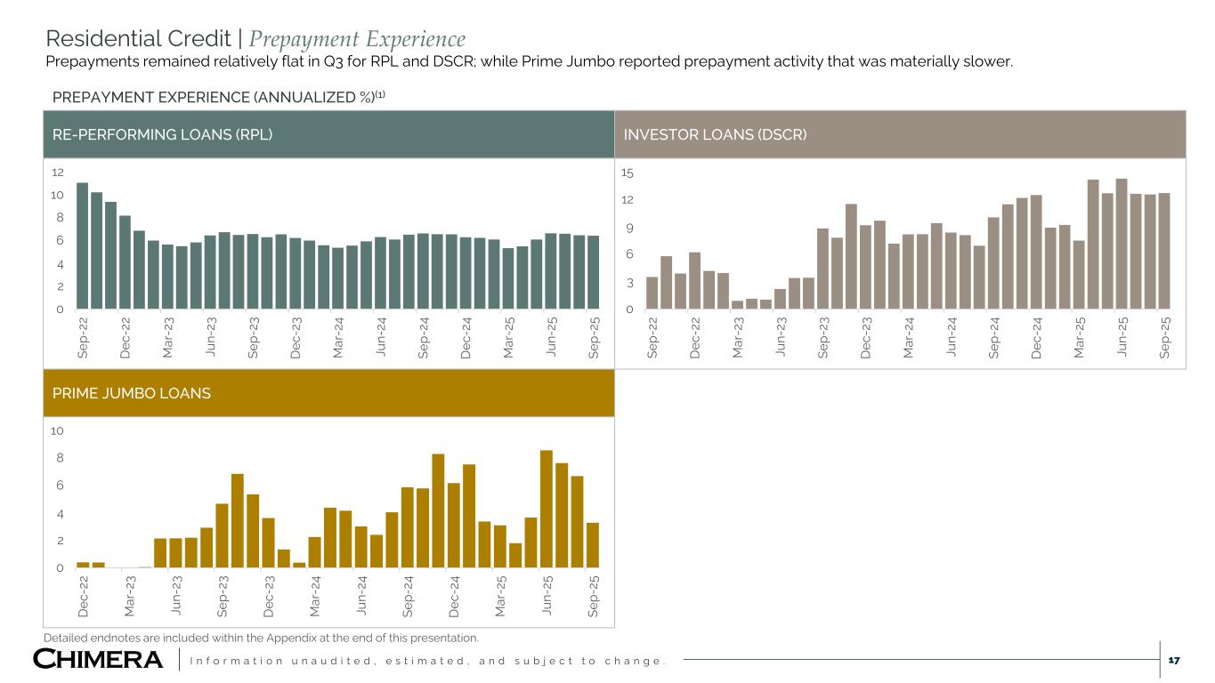 I n f o r m a t i o n u n a u d i t e d , e s t i m a t e d , a n d s u b j e c t t o c h a n g e . 16 RE-PERFORMING LOANS (RPL) INVESTOR LOANS (DSCR) PRIME JUMBO LOANS BUSINESS PURPOSE LOANS (RTL) 5.0 15.0 25.0 35.0 45.0 Se p- 22 D ec -2 2 M ar -2 3 Ju n- 23 Se p- 23 D ec -2 3 M ar -2 4 Ju n- 24 Se p- 24 D ec -2 4 M ar -2 5 Ju n- 25 Se p- 25 Residential Credit | Delinquency Experience Residential credit fundamentals in our legacy RPL portfolio have remained stable with substantial borrower equity and loan seasoning. 60+ DAY DELINQUENCY EXPERIENCE (%)(1) 0.0 1.0 2.0 3.0 4.0 5.0 Se p- 22 D ec -2 2 M ar -2 3 Ju n- 23 Se p- 23 D ec -2 3 M ar -2 4 Ju n- 24 Se p- 24 D ec -2 4 M ar -2 5 Ju n- 25 Se p- 25 7.0 7.5 8.0 8.5 9.0 9.5 Se p- 22 D ec -2 2 M ar -2 3 Ju n- 23 Se p- 23 D ec -2 3 M ar -2 4 Ju n- 24 Se p- 24 D ec -2 4 M ar -2 5 Ju n- 25 Se p- 25 0.0 0.2 0.4 0.6 0.8 1.0 D ec -2 2 M ar -2 3 Ju n- 23 Se p- 23 D ec -2 3 M ar -2 4 Ju n- 24 Se p- 24 D ec -2 4 M ar -2 5 Ju n- 25 Se p- 25 Detailed endnotes are included within the Appendix at the end of this presentation.