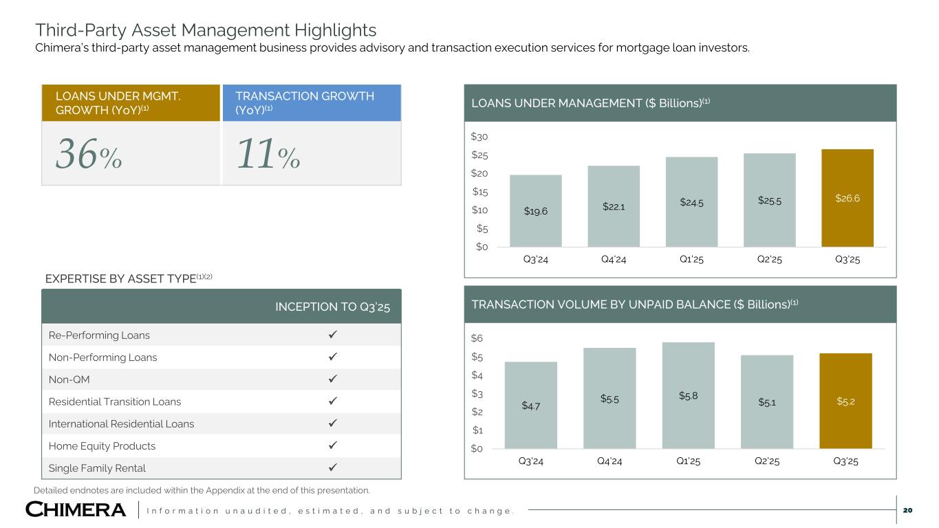 I n f o r m a t i o n u n a u d i t e d , e s t i m a t e d , a n d s u b j e c t t o c h a n g e . 19 Mortgage Servicing Rights Financing Receivables (“MSRs”)(1) We believe MSRs provide predictable cash flows and are a natural hedge within Chimera’s portfolio. MSR PORTFOLIO CHARACTERISTICS & VALUATION MULTIPLE As of September 30, 2025 QUARTERLY UPDATE  During Q3, completed the first MSR-related investment through a third-party servicing partnership.  Acquired $6.5 billion of seasoned out-of-the-money coupon conventional Fannie Mae loans.  $35.5 million net asset value; $89.2 million of MSR value, $4.8 million of net cash and receivables, and $58.5 million of embedded financing. UNPAID BALANCE LOAN COUNT WAVG NOTE RATE 1M CPR $6.4B 29.0K 4.0% 7.9% WAVG CREDIT SCORE LOAN-TO- VALUE 60+ DAYS DELINQUENT VALUATION MULTIPLE 736 69.4% 1.6% 5.6X 0.4% 2.8% 21.7% 17.7% 20.2% 6.7% 8.2% 5.6% 6.0% 1.6% 1.2% 5.0% 2.9% <2 % 2% -2 .5 % 2. 5% -3 % 3% -3 .5 % 3. 5% -4 % 4% -4 .5 % 4. 5% -5 % 5% -5 .5 % 5. 5% -6 % 6% -6 .3 % 6. 3% -6 .5 % 6. 5% -7 % >7 % NOTE RATE DISTRIBUTION As of September 30, 2025 30-Year Fixed Mortgage Rate = 6.36%