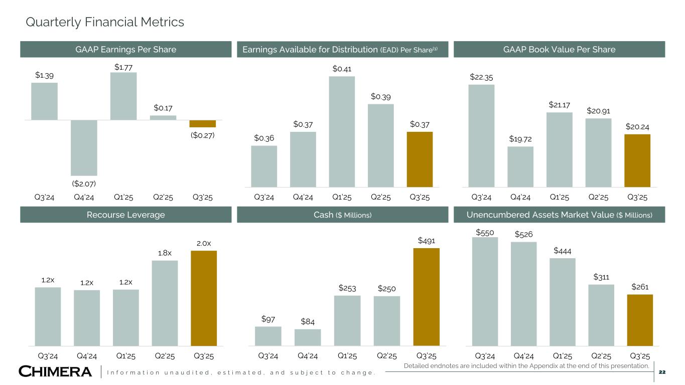 I n f o r m a t i o n u n a u d i t e d , e s t i m a t e d , a n d s u b j e c t t o c h a n g e . Quarterly Financial Metrics 22 $1.39 ($2.07) $1.77 $0.17 ($0.27) Q3'24 Q4'24 Q1'25 Q2'25 Q3'25 $0.36 $0.37 $0.41 $0.39 $0.37 Q3'24 Q4'24 Q1'25 Q2'25 Q3'25 $22.35 $19.72 $21.17 $20.91 $20.24 Q3'24 Q4'24 Q1'25 Q2'25 Q3'25 1.2x 1.2x 1.2x 1.8x 2.0x Q3'24 Q4'24 Q1'25 Q2'25 Q3'25 $97 $84 $253 $250 $491 Q3'24 Q4'24 Q1'25 Q2'25 Q3'25 $550 $526 $444 $311 $261 Q3'24 Q4'24 Q1'25 Q2'25 Q3'25 GAAP Earnings Per Share Earnings Available for Distribution (EAD) Per Share(1) GAAP Book Value Per Share Recourse Leverage Cash ($ Millions) Unencumbered Assets Market Value ($ Millions) Detailed endnotes are included within the Appendix at the end of this presentation.