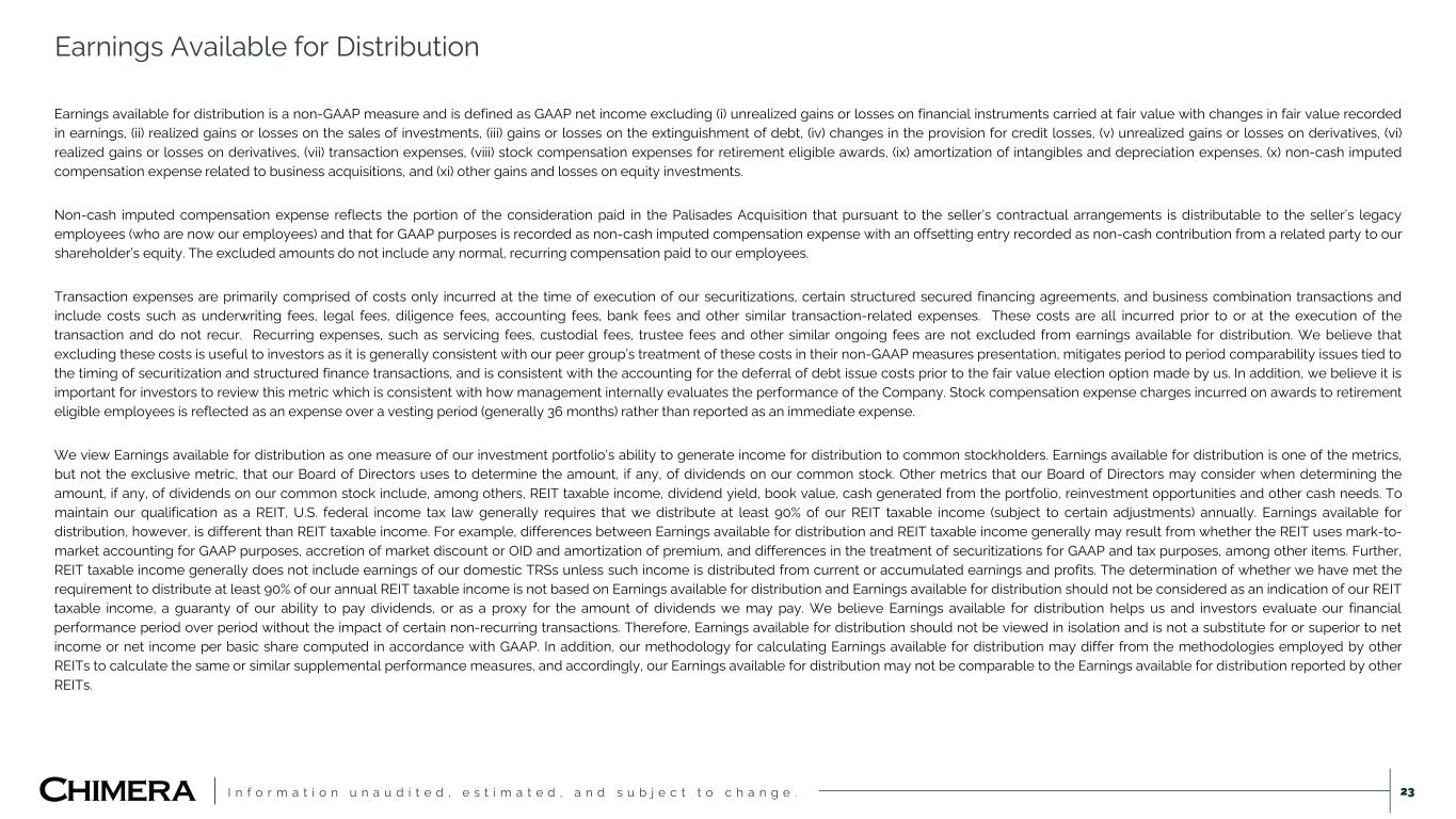 I n f o r m a t i o n u n a u d i t e d , e s t i m a t e d , a n d s u b j e c t t o c h a n g e . Earnings available for distribution is a non-GAAP measure and is defined as GAAP net income excluding (i) unrealized gains or losses on financial instruments carried at fair value with changes in fair value recorded in earnings, (ii) realized gains or losses on the sales of investments, (iii) gains or losses on the extinguishment of debt, (iv) changes in the provision for credit losses, (v) unrealized gains or losses on derivatives, (vi) realized gains or losses on derivatives, (vii) transaction expenses, (viii) stock compensation expenses for retirement eligible awards, (ix) amortization of intangibles and depreciation expenses, (x) non-cash imputed compensation expense related to business acquisitions, and (xi) other gains and losses on equity investments. Non-cash imputed compensation expense reflects the portion of the consideration paid in the Palisades Acquisition that pursuant to the seller’s contractual arrangements is distributable to the seller’s legacy employees (who are now our employees) and that for GAAP purposes is recorded as non-cash imputed compensation expense with an offsetting entry recorded as non-cash contribution from a related party to our shareholder’s equity. The excluded amounts do not include any normal, recurring compensation paid to our employees. Transaction expenses are primarily comprised of costs only incurred at the time of execution of our securitizations, certain structured secured financing agreements, and business combination transactions and include costs such as underwriting fees, legal fees, diligence fees, accounting fees, bank fees and other similar transaction-related expenses. These costs are all incurred prior to or at the execution of the transaction and do not recur. Recurring expenses, such as servicing fees, custodial fees, trustee fees and other similar ongoing fees are not excluded from earnings available for distribution. We believe that excluding these costs is useful to investors as it is generally consistent with our peer group’s treatment of these costs in their non-GAAP measures presentation, mitigates period to period comparability issues tied to the timing of securitization and structured finance transactions, and is consistent with the accounting for the deferral of debt issue costs prior to the fair value election option made by us. In addition, we believe it is important for investors to review this metric which is consistent with how management internally evaluates the performance of the Company. Stock compensation expense charges incurred on awards to retirement eligible employees is reflected as an expense over a vesting period (generally 36 months) rather than reported as an immediate expense. We view Earnings available for distribution as one measure of our investment portfolio's ability to generate income for distribution to common stockholders. Earnings available for distribution is one of the metrics, but not the exclusive metric, that our Board of Directors uses to determine the amount, if any, of dividends on our common stock. Other metrics that our Board of Directors may consider when determining the amount, if any, of dividends on our common stock include, among others, REIT taxable income, dividend yield, book value, cash generated from the portfolio, reinvestment opportunities and other cash needs. To maintain our qualification as a REIT, U.S. federal income tax law generally requires that we distribute at least 90% of our REIT taxable income (subject to certain adjustments) annually. Earnings available for distribution, however, is different than REIT taxable income. For example, differences between Earnings available for distribution and REIT taxable income generally may result from whether the REIT uses mark-to- market accounting for GAAP purposes, accretion of market discount or OID and amortization of premium, and differences in the treatment of securitizations for GAAP and tax purposes, among other items. Further, REIT taxable income generally does not include earnings of our domestic TRSs unless such income is distributed from current or accumulated earnings and profits. The determination of whether we have met the requirement to distribute at least 90% of our annual REIT taxable income is not based on Earnings available for distribution and Earnings available for distribution should not be considered as an indication of our REIT taxable income, a guaranty of our ability to pay dividends, or as a proxy for the amount of dividends we may pay. We believe Earnings available for distribution helps us and investors evaluate our financial performance period over period without the impact of certain non-recurring transactions. Therefore, Earnings available for distribution should not be viewed in isolation and is not a substitute for or superior to net income or net income per basic share computed in accordance with GAAP. In addition, our methodology for calculating Earnings available for distribution may differ from the methodologies employed by other REITs to calculate the same or similar supplemental performance measures, and accordingly, our Earnings available for distribution may not be comparable to the Earnings available for distribution reported by other REITs. Earnings Available for Distribution 23