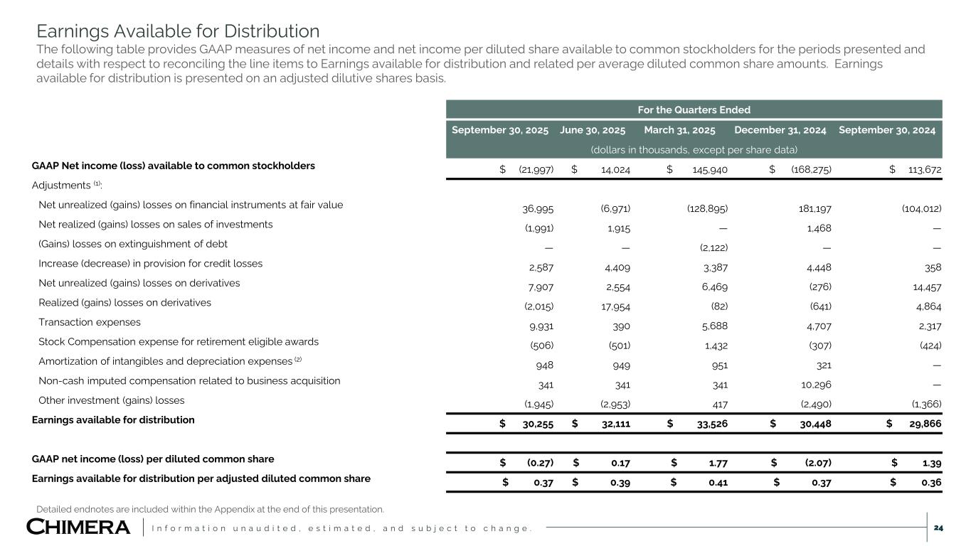 I n f o r m a t i o n u n a u d i t e d , e s t i m a t e d , a n d s u b j e c t t o c h a n g e . Earnings Available for Distribution The following table provides GAAP measures of net income and net income per diluted share available to common stockholders for the periods presented and details with respect to reconciling the line items to Earnings available for distribution and related per average diluted common share amounts. Earnings available for distribution is presented on an adjusted dilutive shares basis. 24 Detailed endnotes are included within the Appendix at the end of this presentation. For the Quarters Ended September 30, 2025 June 30, 2025 March 31, 2025 December 31, 2024 September 30, 2024 (dollars in thousands, except per share data) GAAP Net income (loss) available to common stockholders $ (21,997) $ 14,024 $ 145,940 $ (168,275) $ 113,672 Adjustments (1): Net unrealized (gains) losses on financial instruments at fair value 36,995 (6,971) (128,895) 181,197 (104,012) Net realized (gains) losses on sales of investments (1,991) 1,915 — 1,468 — (Gains) losses on extinguishment of debt — — (2,122) — — Increase (decrease) in provision for credit losses 2,587 4,409 3,387 4,448 358 Net unrealized (gains) losses on derivatives 7,907 2,554 6,469 (276) 14,457 Realized (gains) losses on derivatives (2,015) 17,954 (82) (641) 4,864 Transaction expenses 9,931 390 5,688 4,707 2,317 Stock Compensation expense for retirement eligible awards (506) (501) 1,432 (307) (424) Amortization of intangibles and depreciation expenses (2) 948 949 951 321 — Non-cash imputed compensation related to business acquisition 341 341 341 10,296 — Other investment (gains) losses (1,945) (2,953) 417 (2,490) (1,366) Earnings available for distribution $ 30,255 $ 32,111 $ 33,526 $ 30,448 $ 29,866 GAAP net income (loss) per diluted common share $ (0.27) $ 0.17 $ 1.77 $ (2.07) $ 1.39 Earnings available for distribution per adjusted diluted common share $ 0.37 $ 0.39 $ 0.41 $ 0.37 $ 0.36